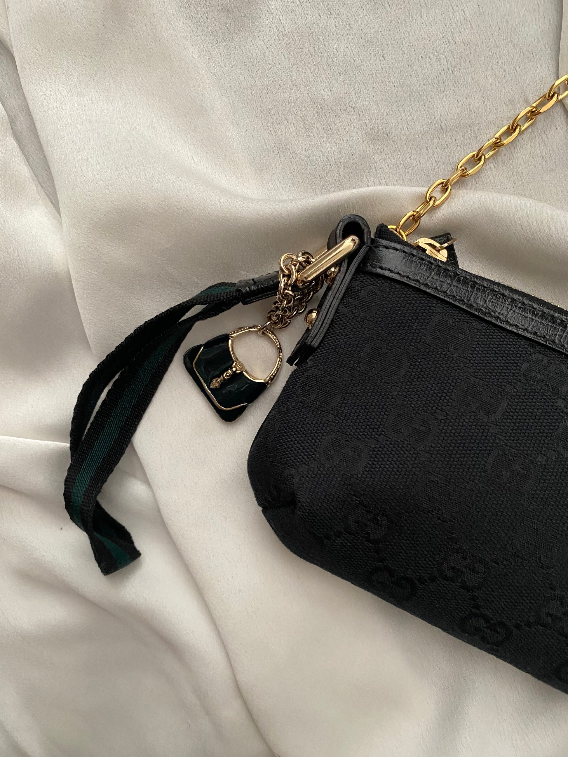 stupenda pochette Gucci in tela monogram nero con dettagli verdi. Charm con piccola jackie meraviglioso. Ottime condizioni. Catena aggiunta per portarla a spalla.