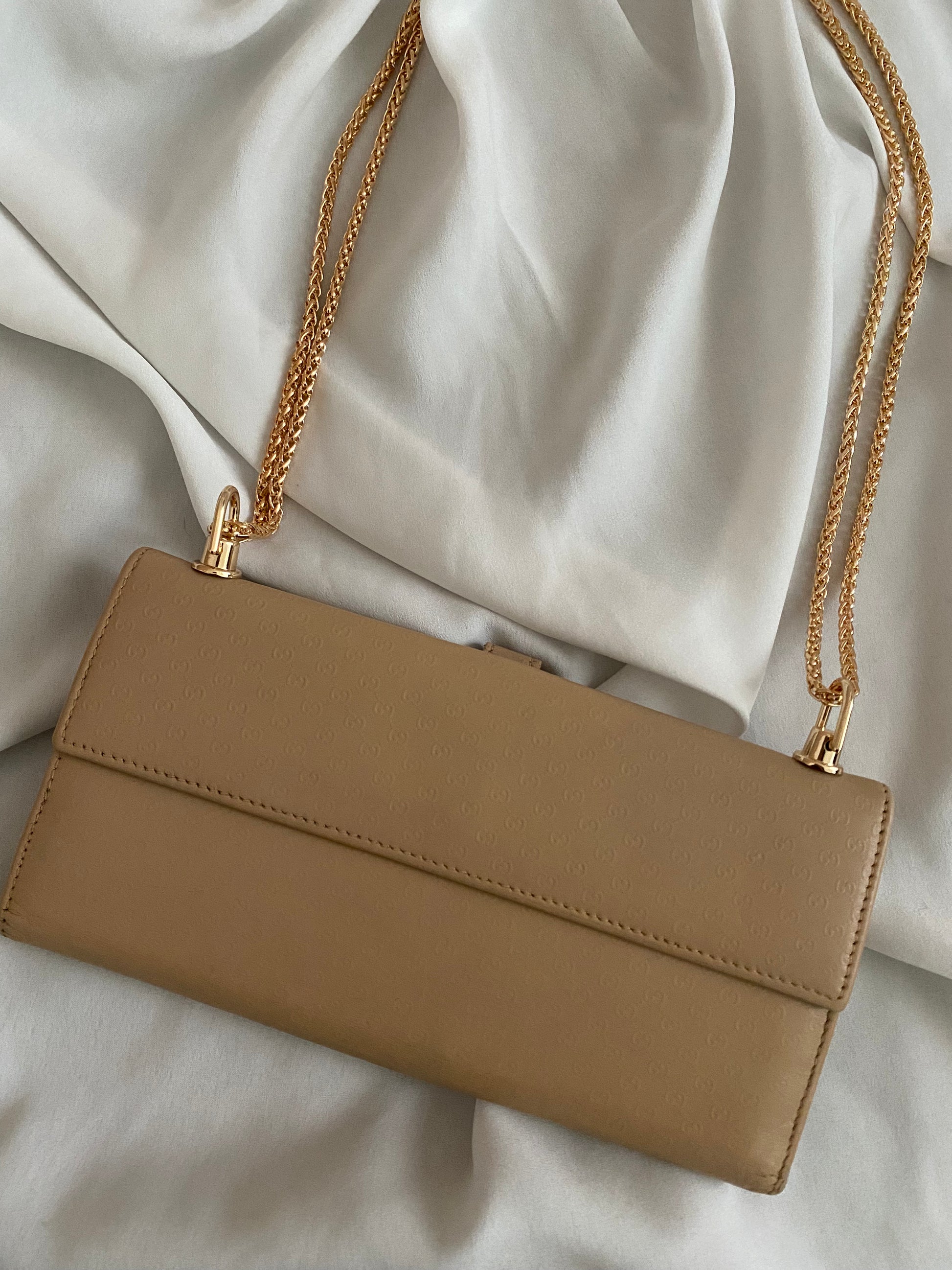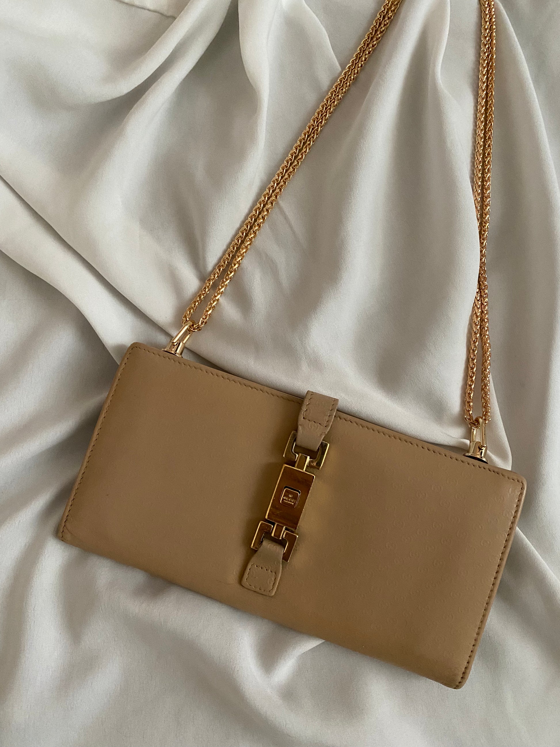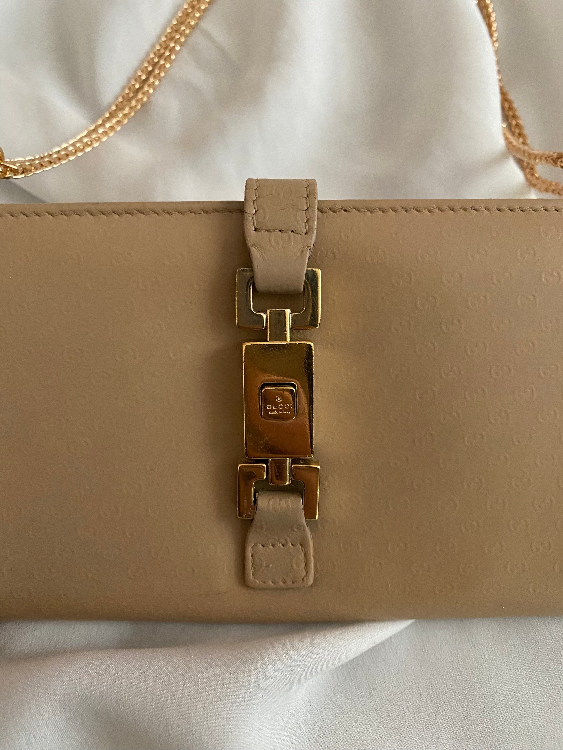 Gucci jackie pochette sabbia e interno beige con monogram in rilievo. Hardware placcato oro 24 carati.