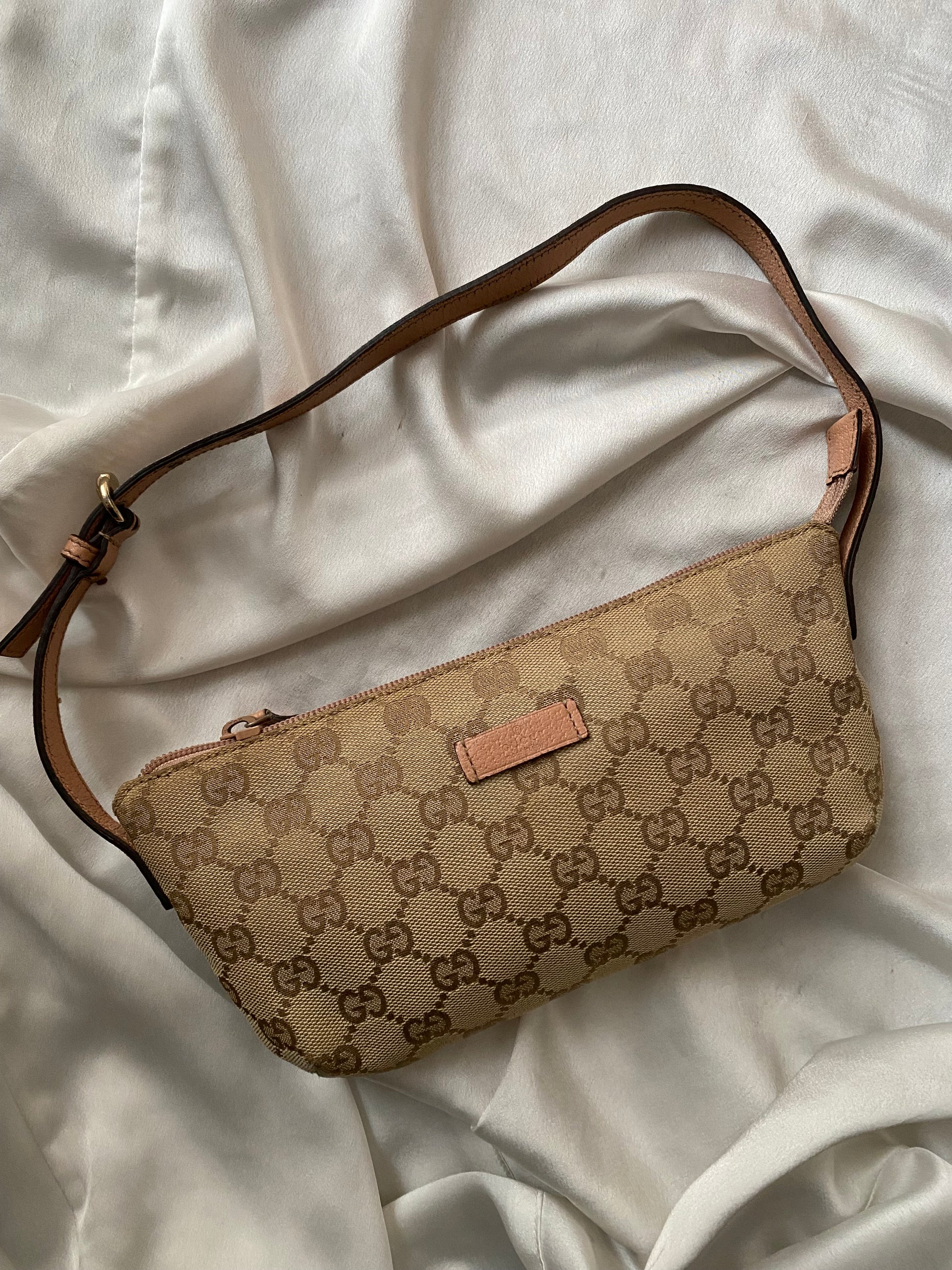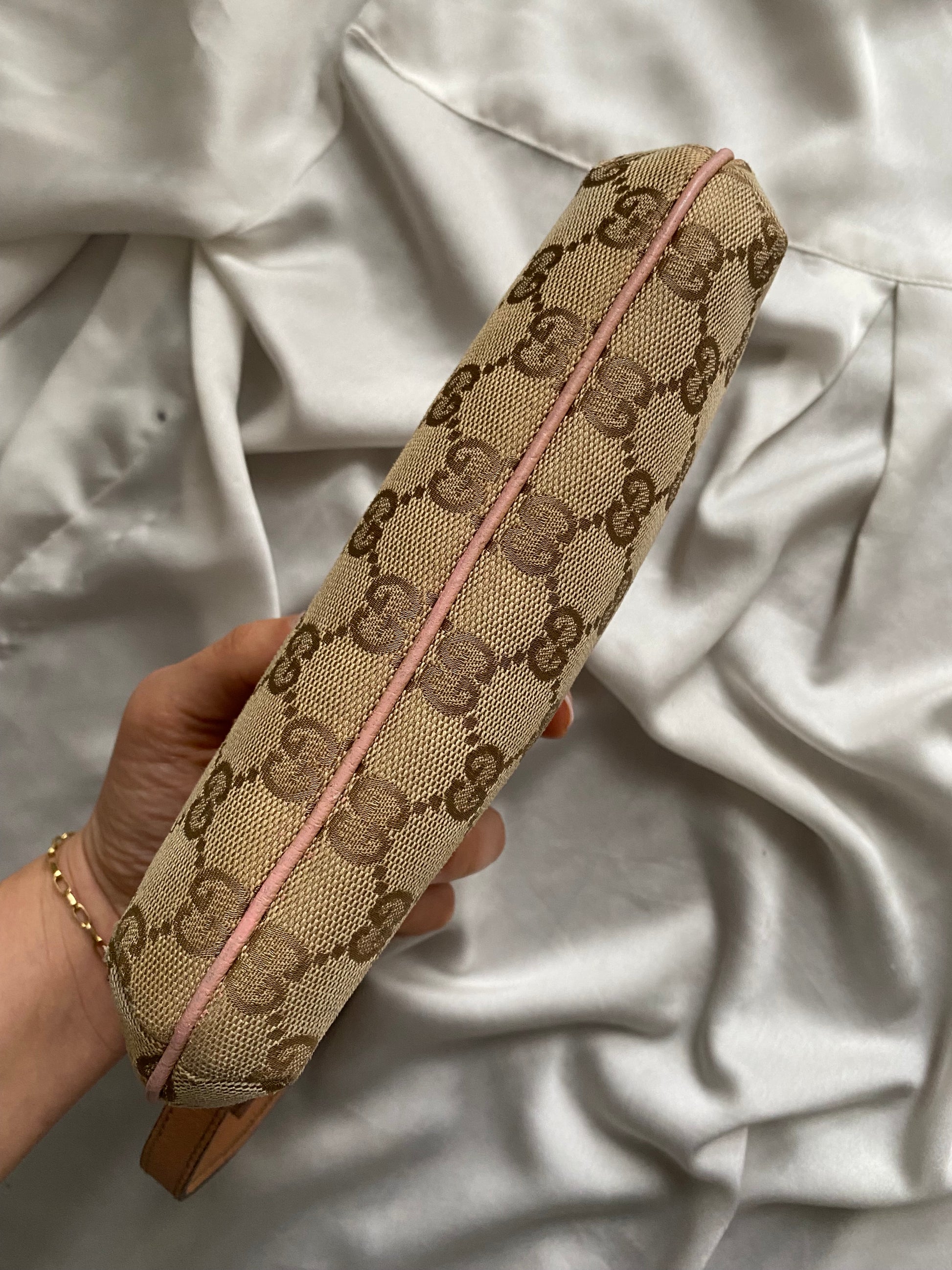 Pazzesca Gucci pretty boat in monogram beige, pelle martellata rosa e hardware oro. Micro segni sugli angolini sul retro, buonissime condizioni generali.