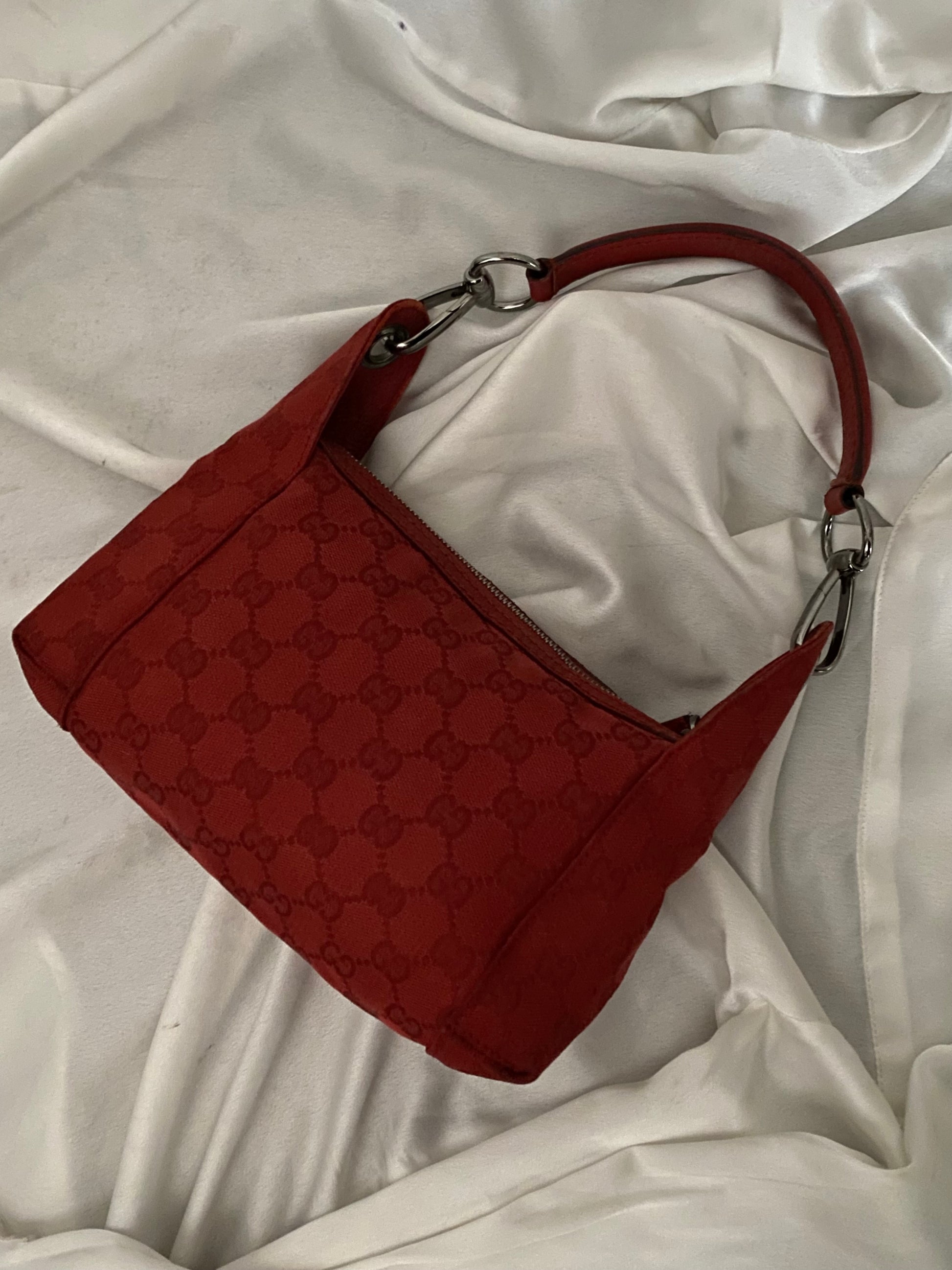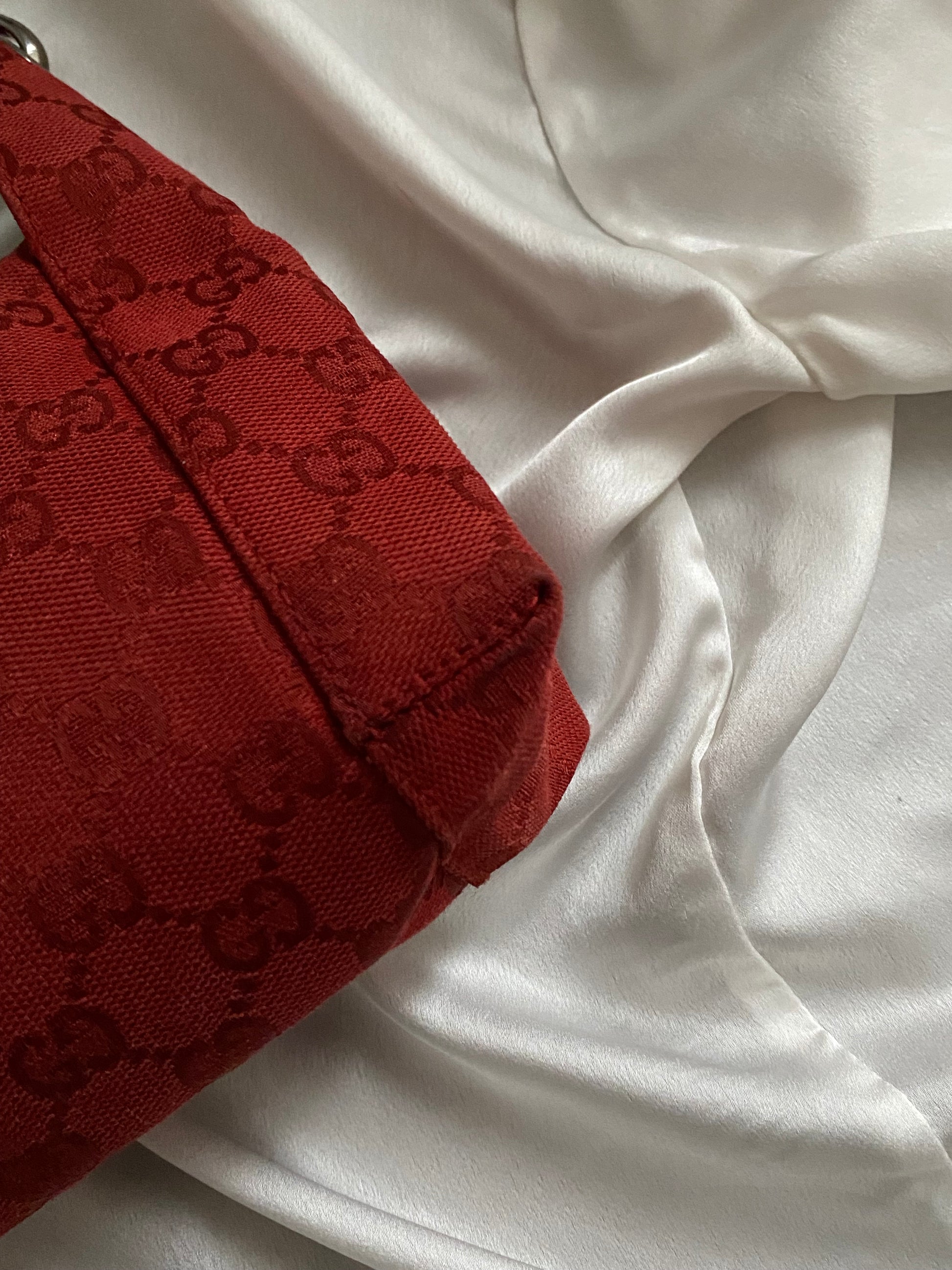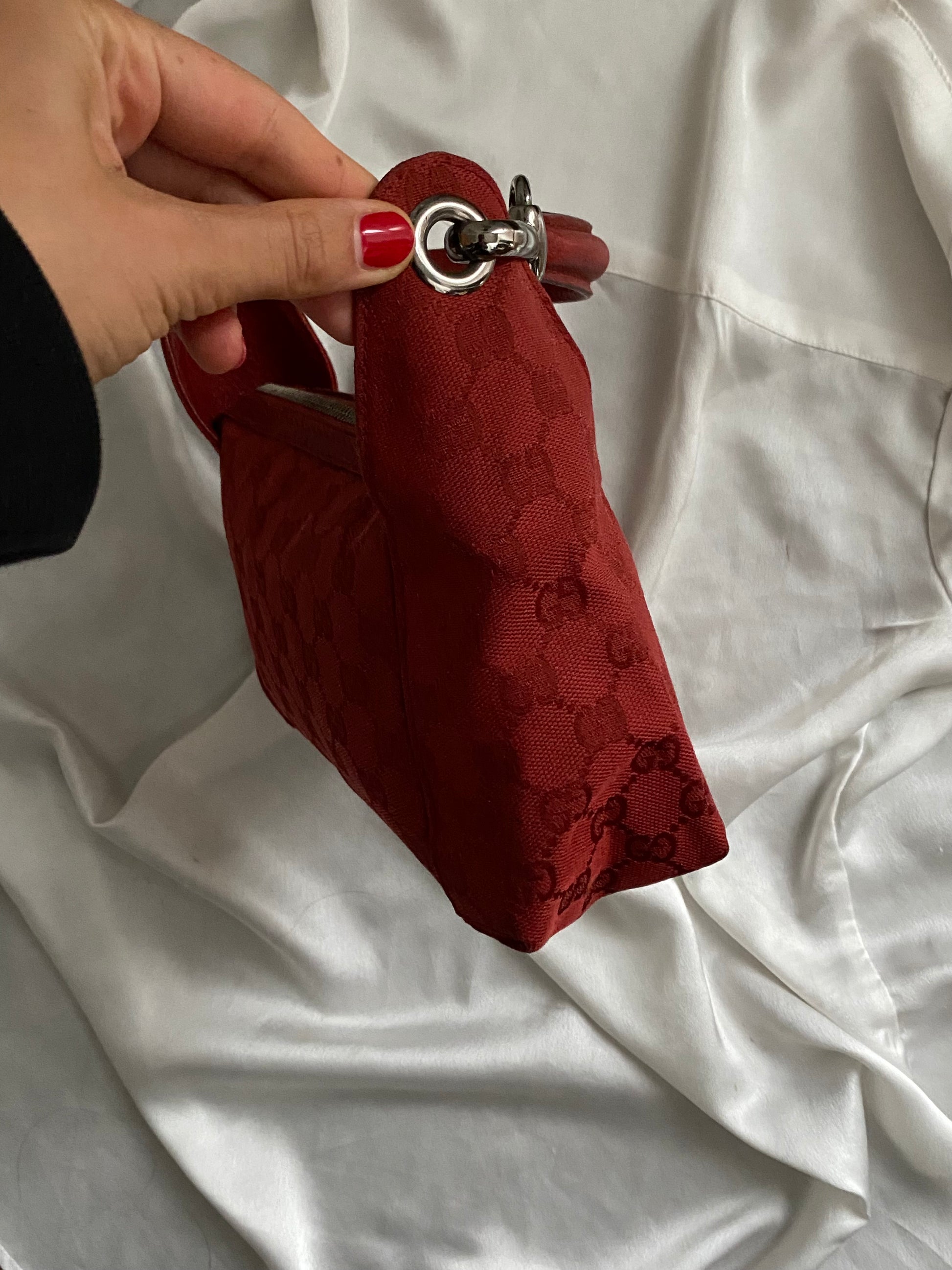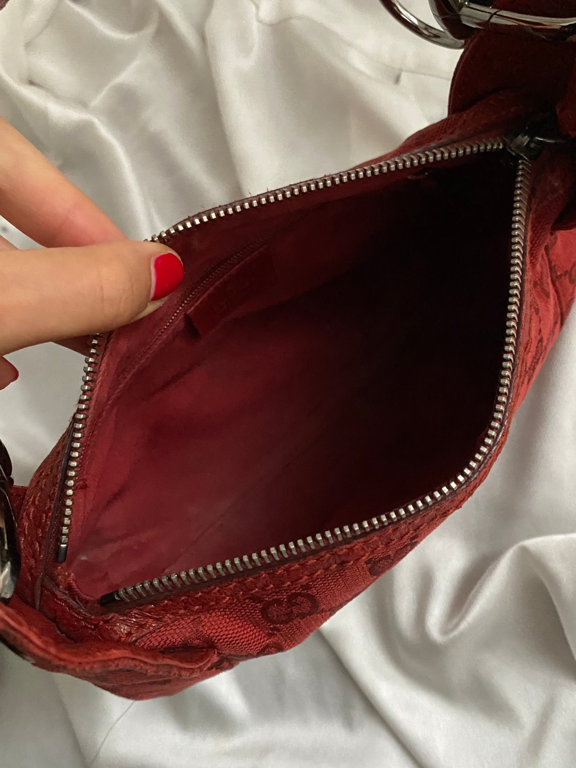 Gucci small hobo cherry red 🍒 in tela monogram e profili in pelle.