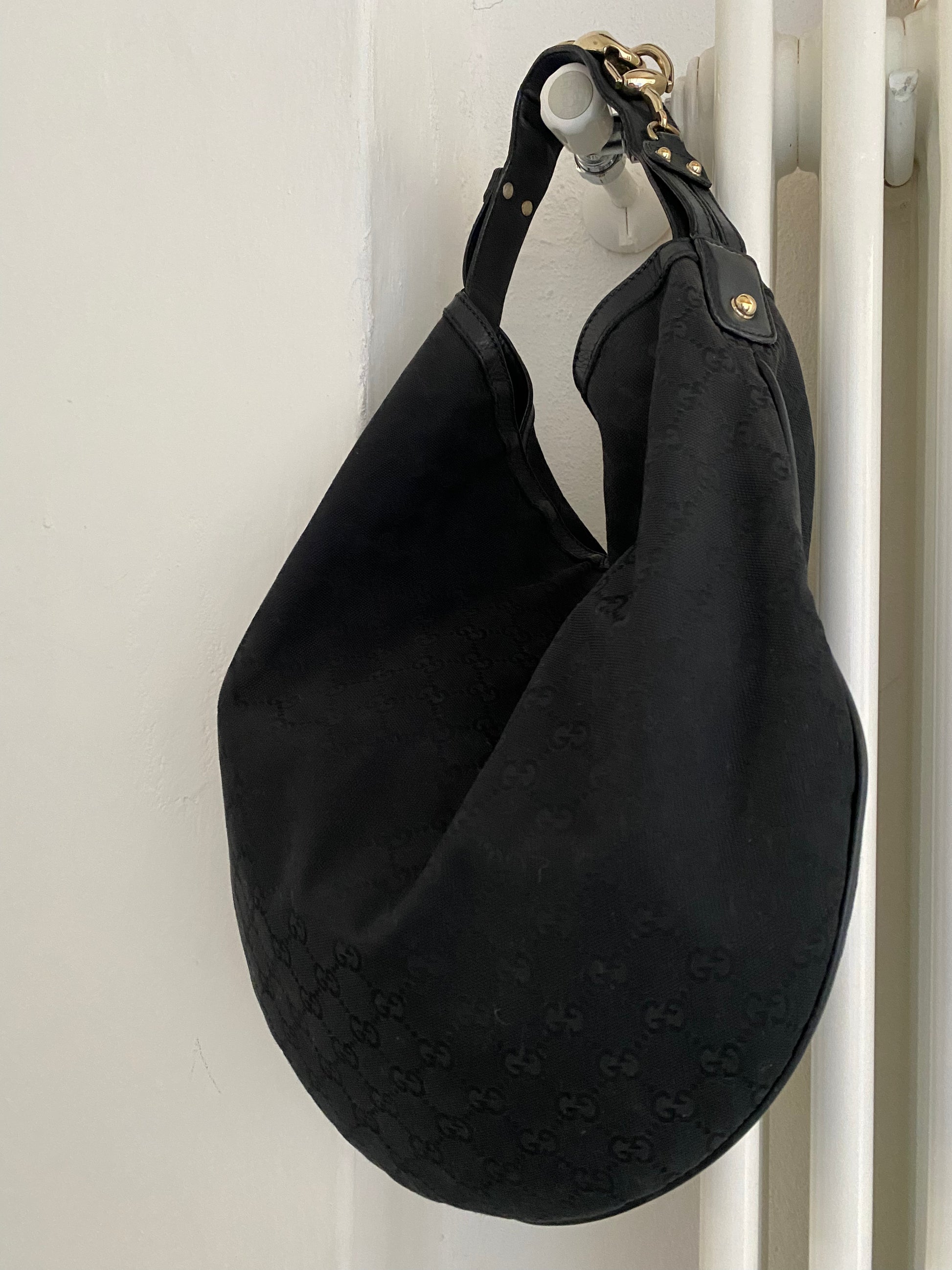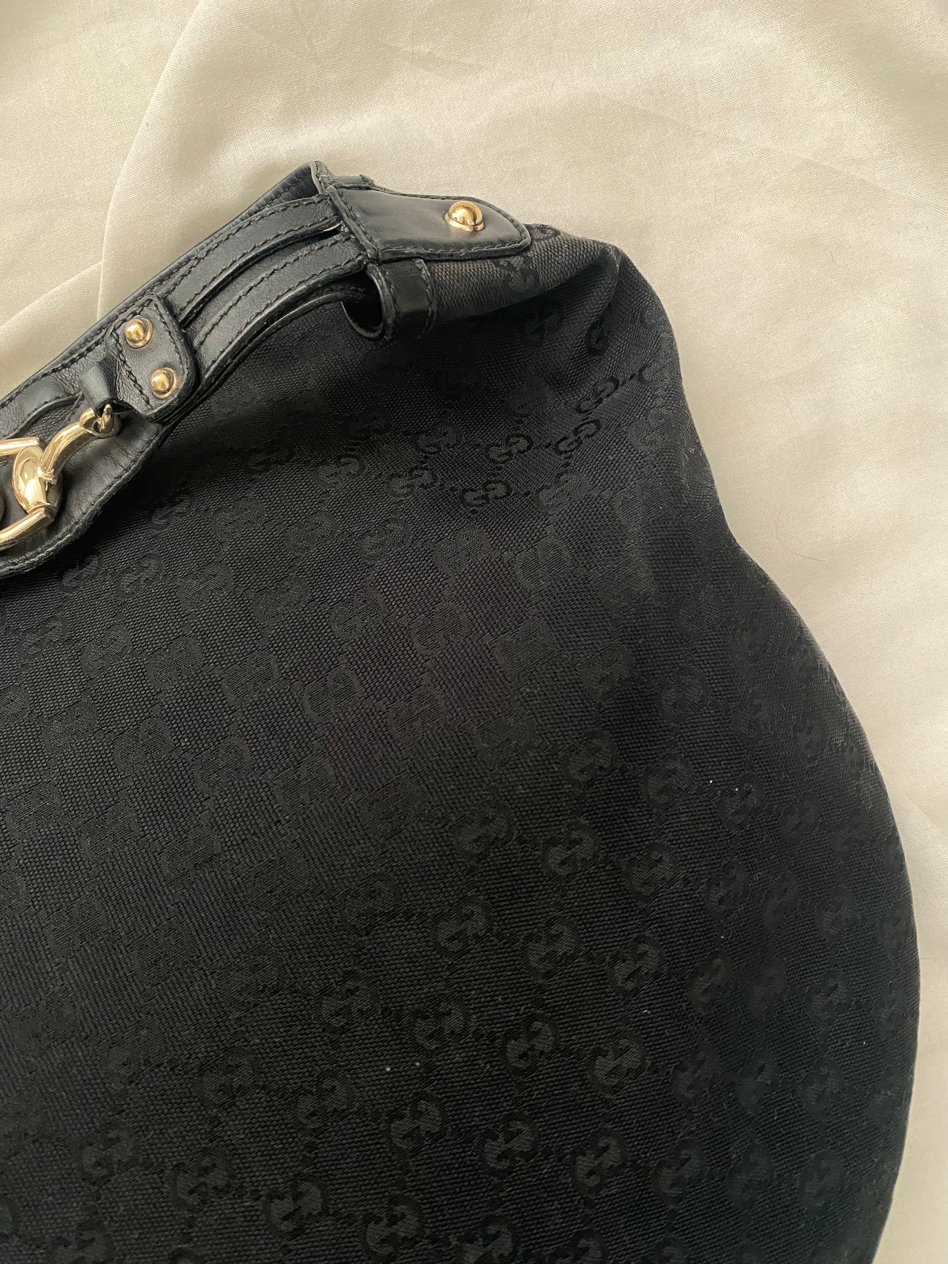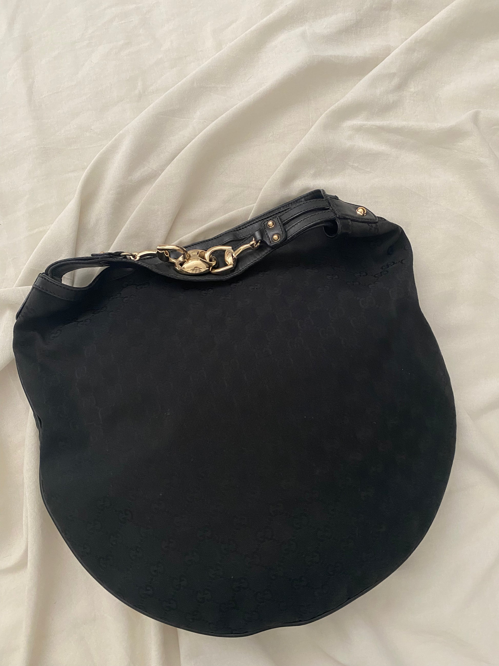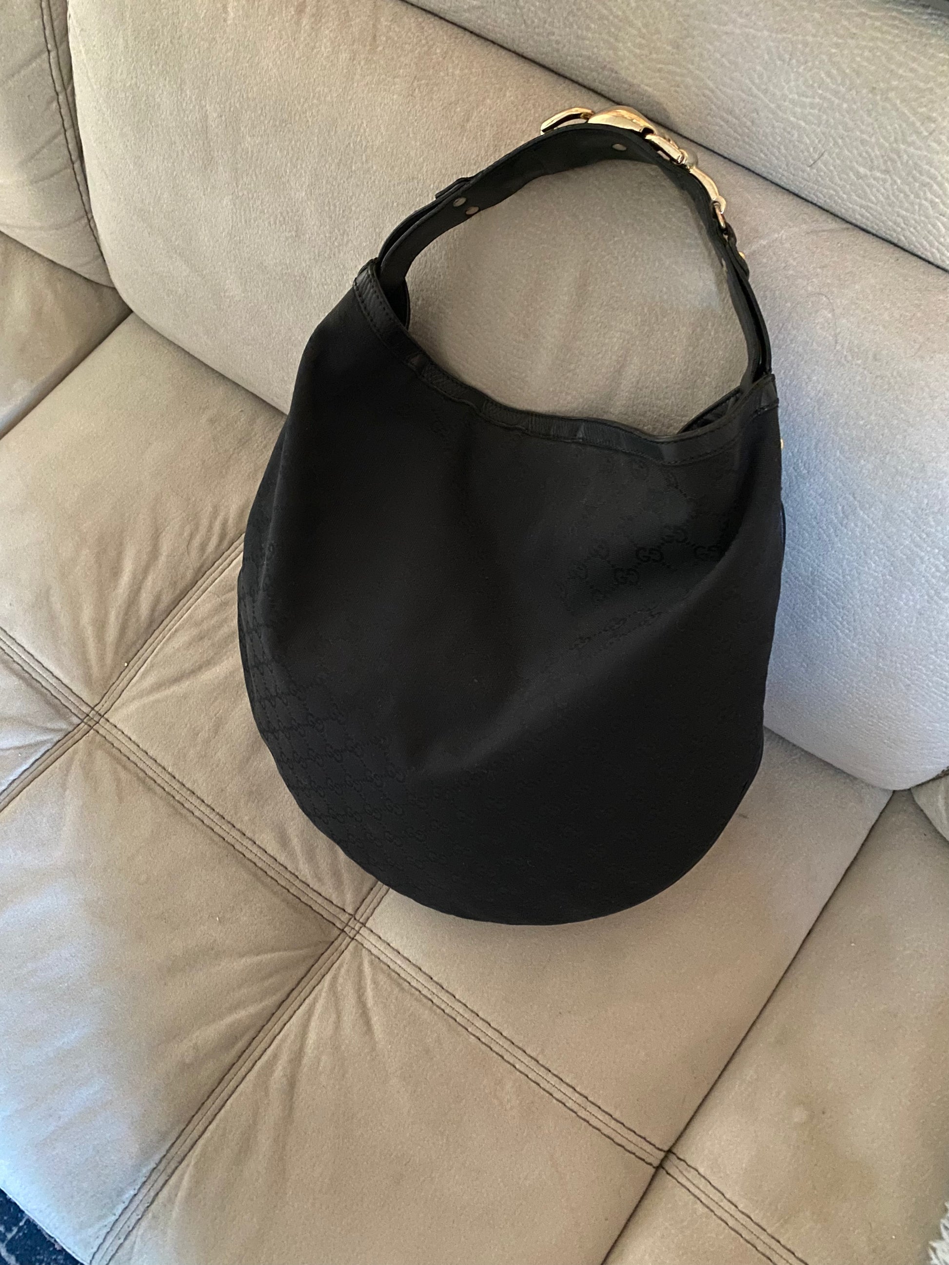 Stupenda e spaziosissima Gucci wave horsebit in tessuto monogram nera e dettagli in pelle. Hardware brillante, presenti leggerissimi segni. Ottime condizioni. Tela intatta. Perfetta come borsa di tutti i giorni.