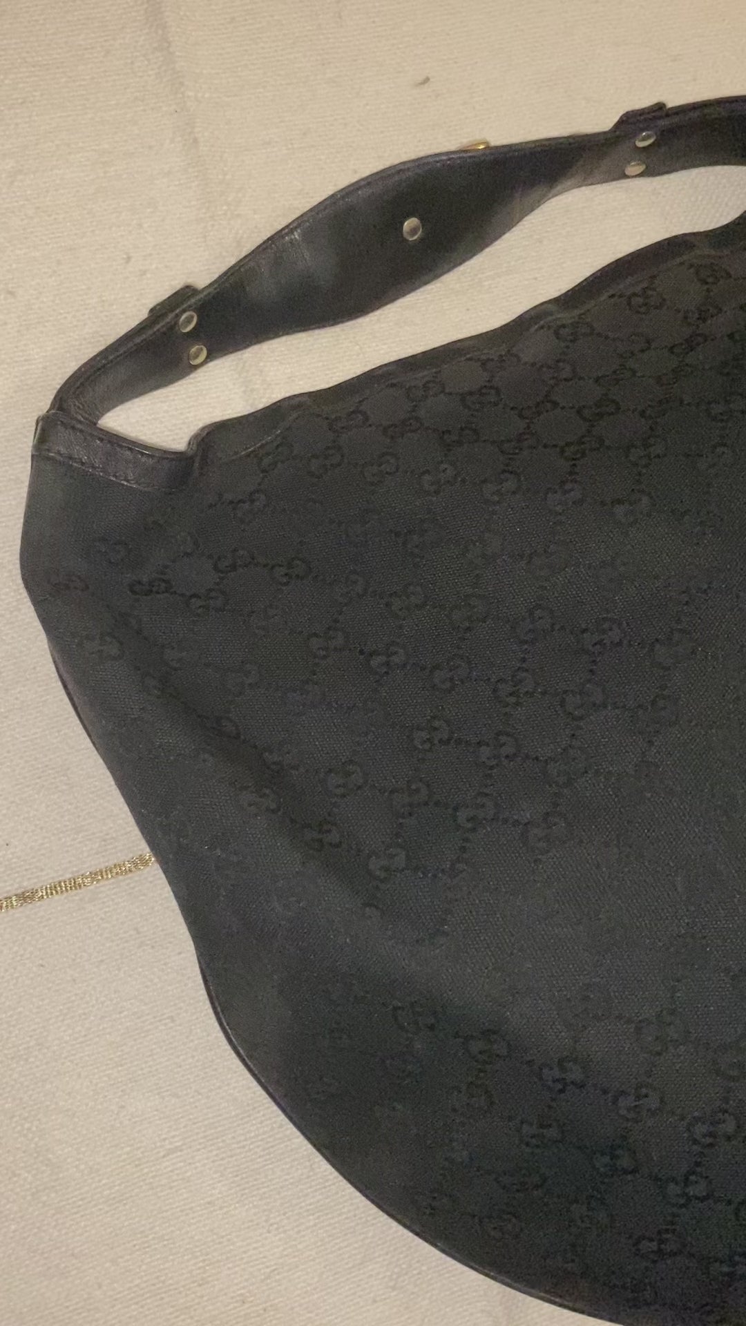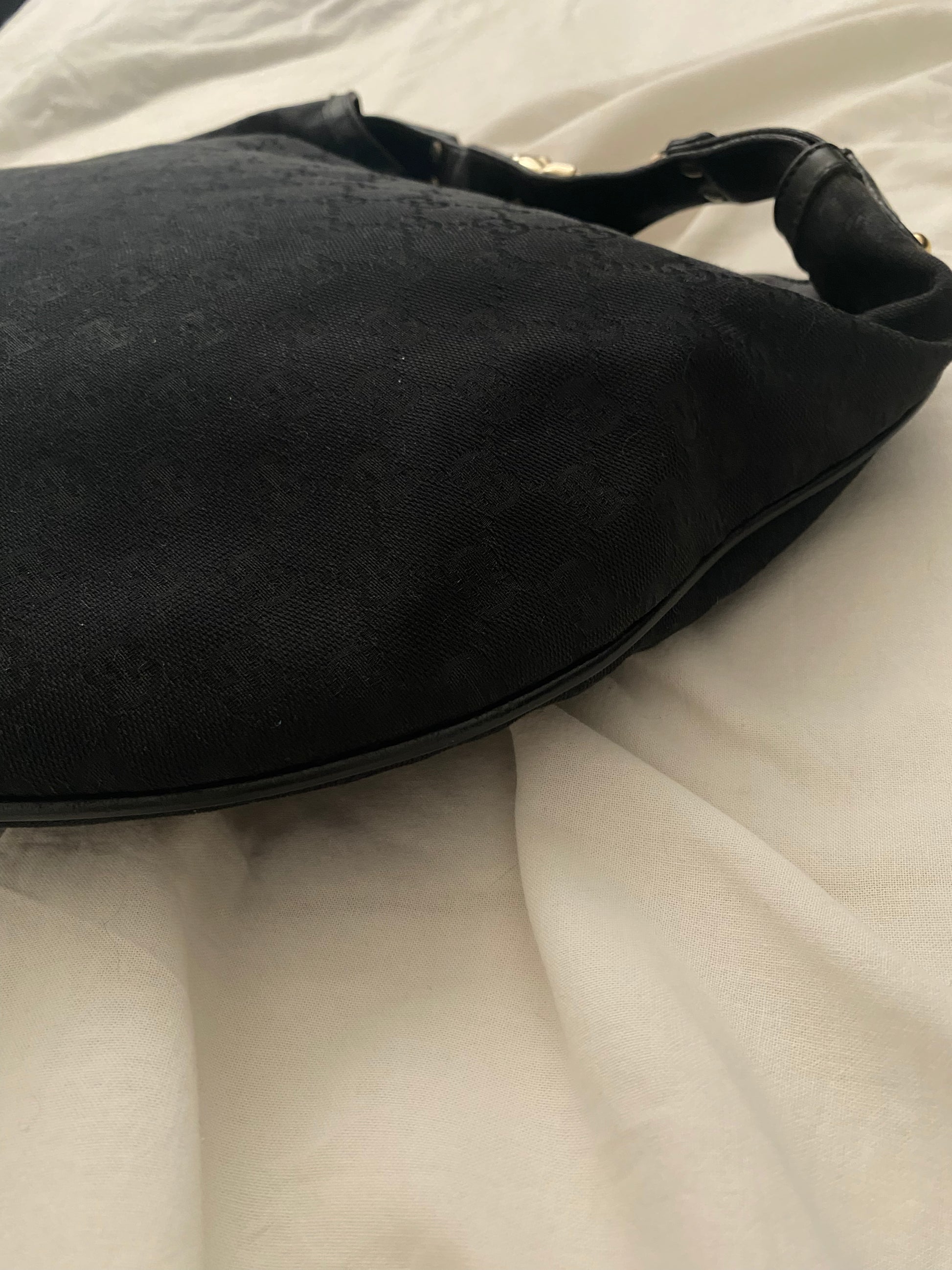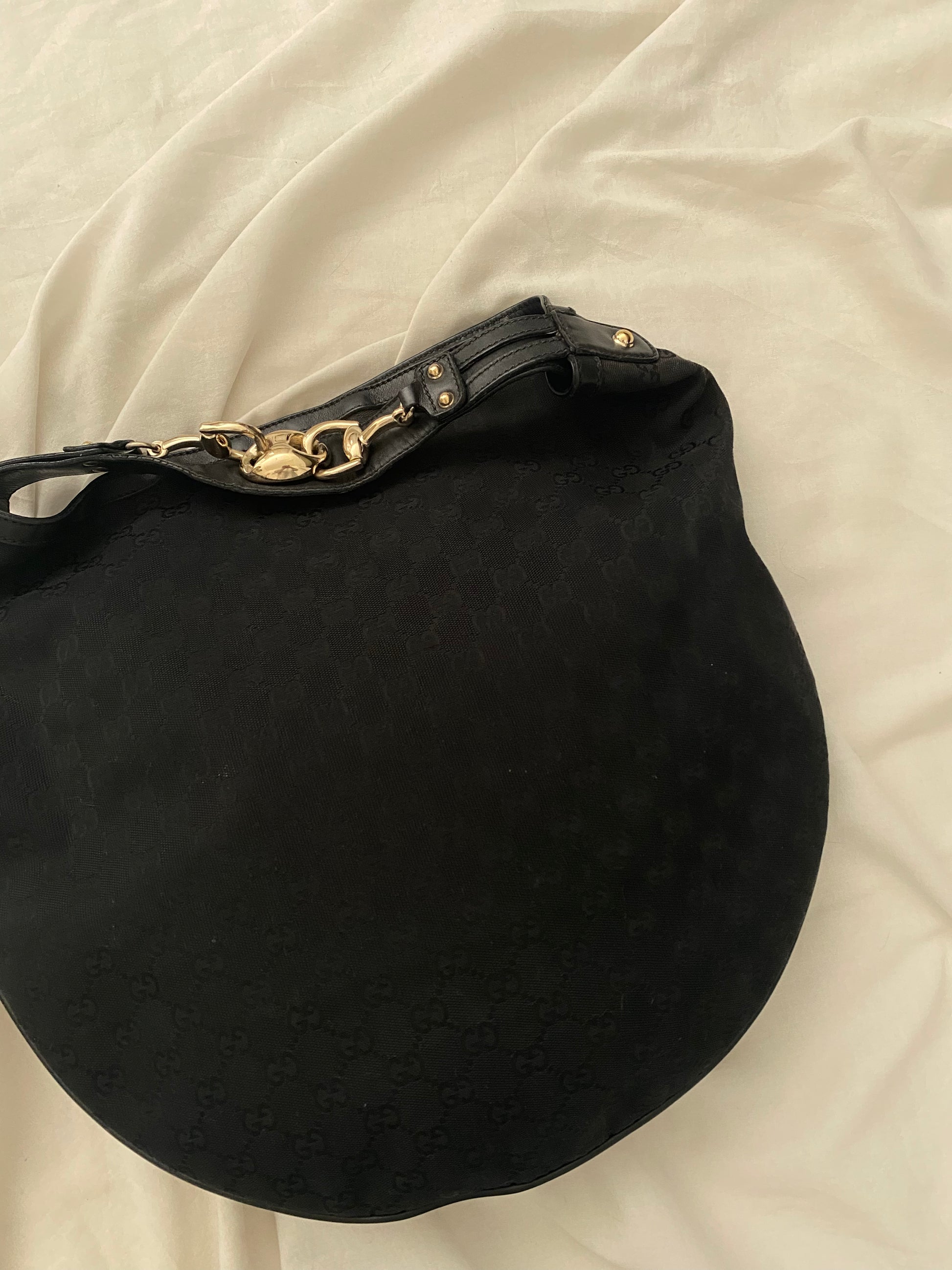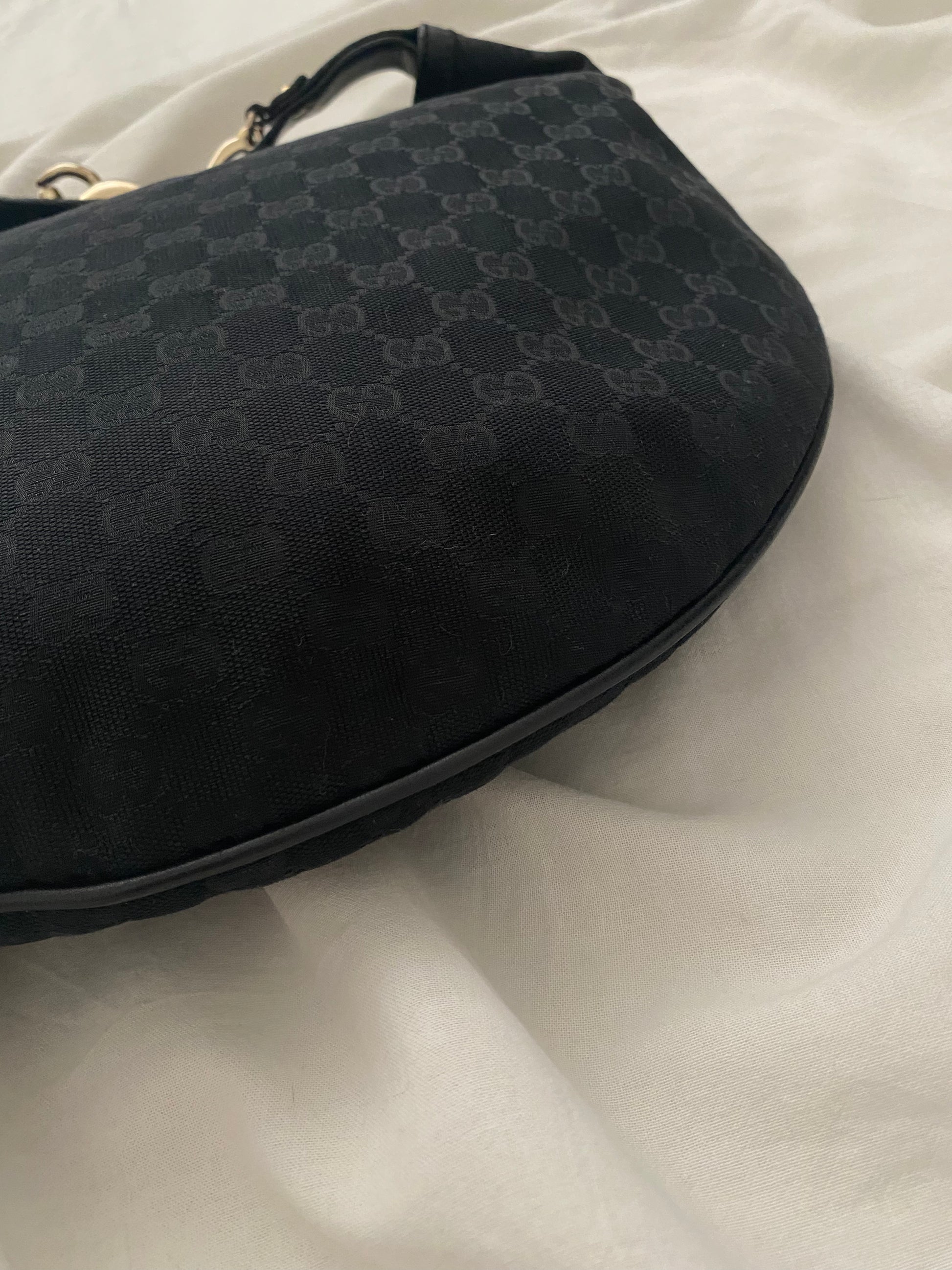 Stupenda e spaziosissima Gucci wave horsebit in tessuto monogram nera e dettagli in pelle. Hardware brillante, presenti leggerissimi segni. Ottime condizioni. Tela intatta. Perfetta come borsa di tutti i giorni.
