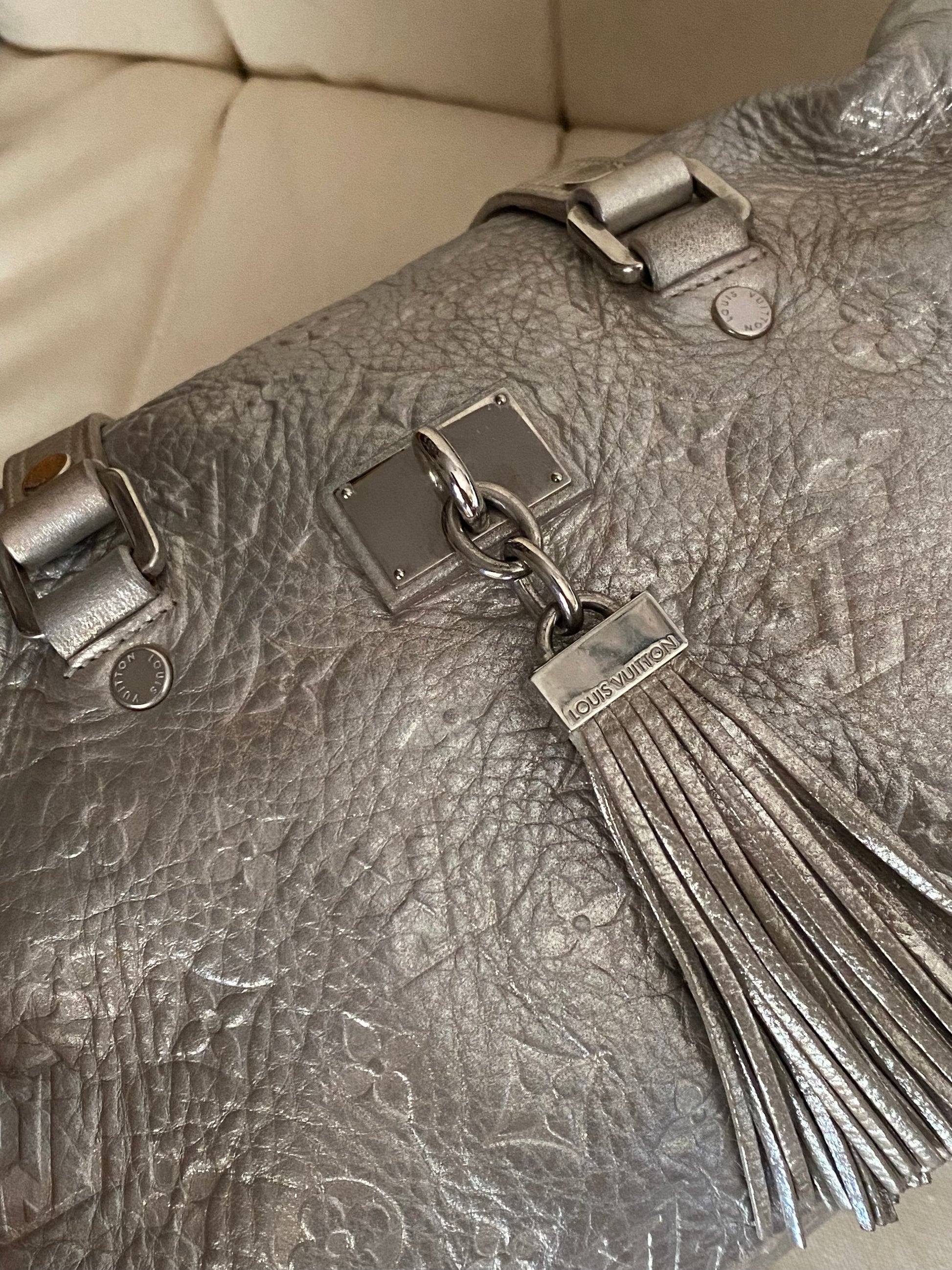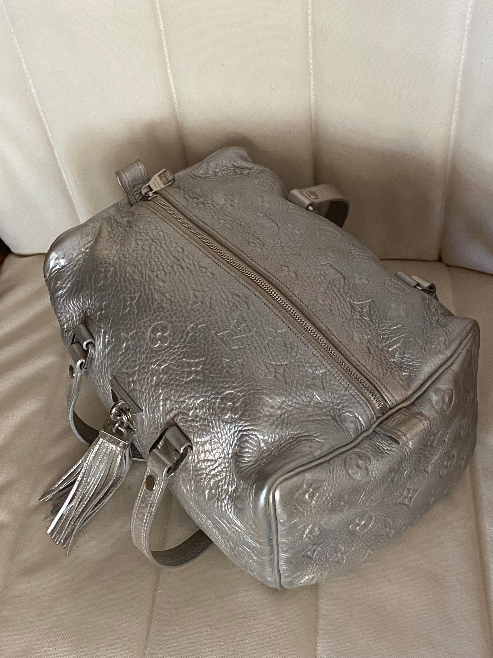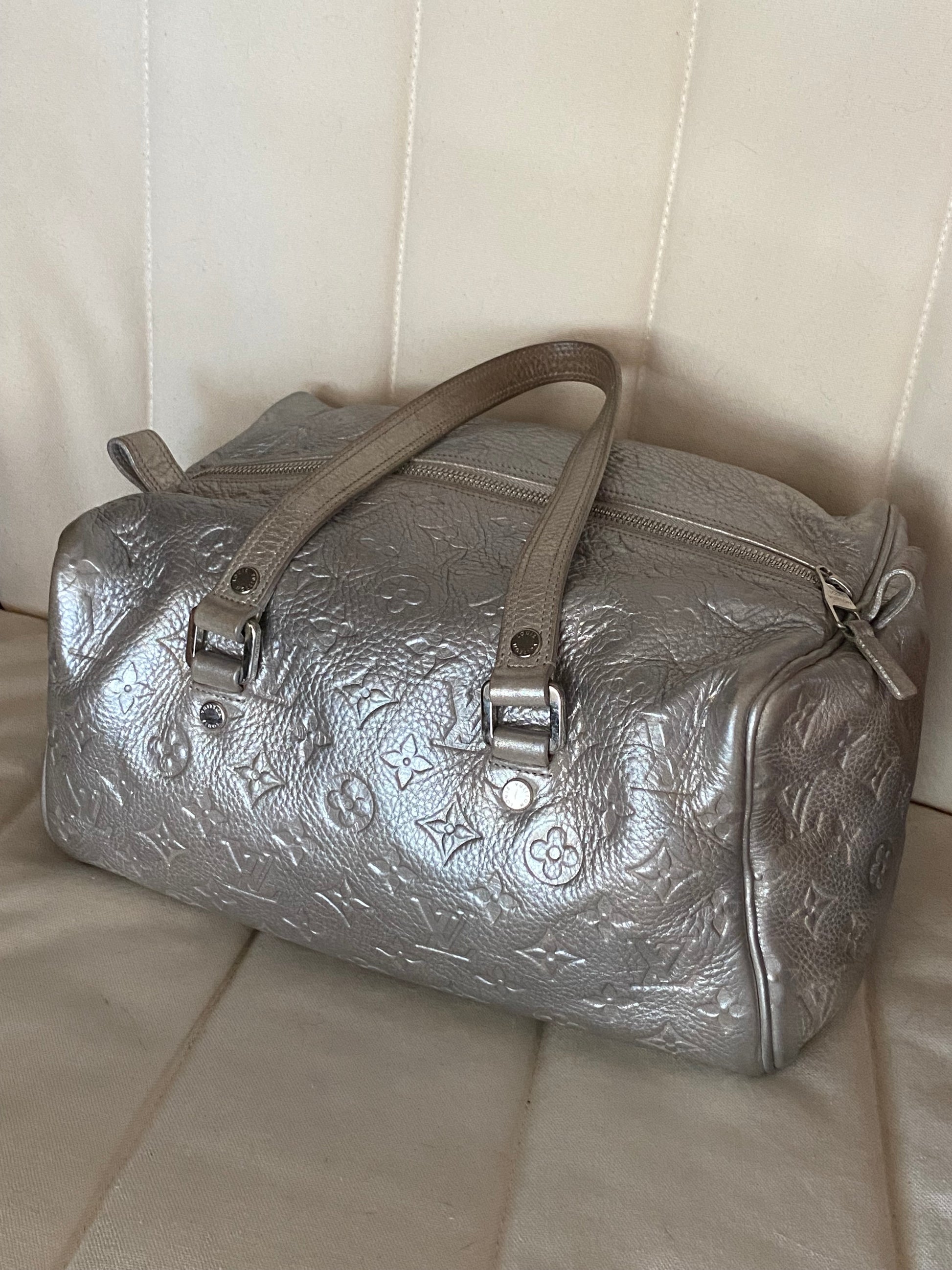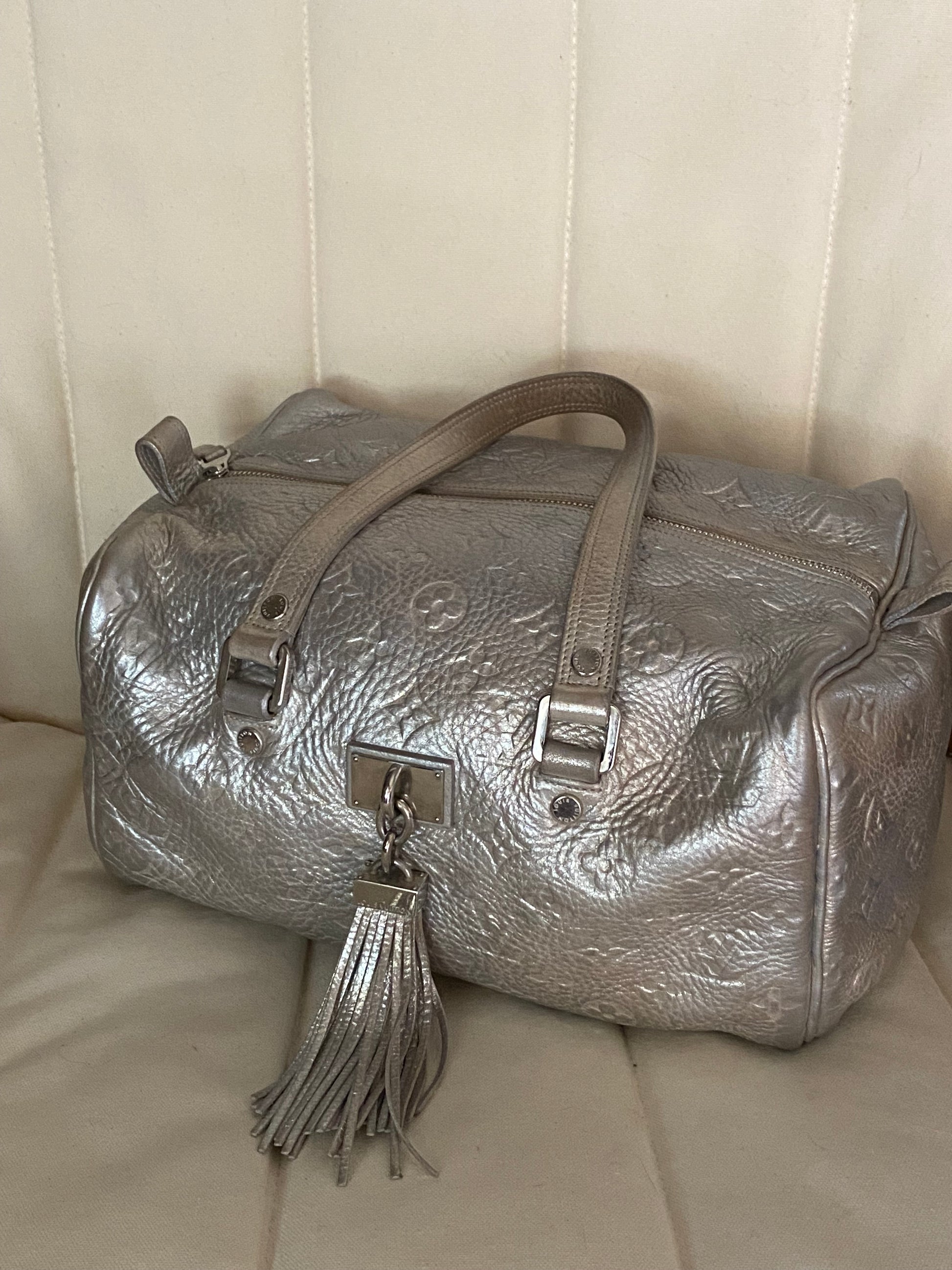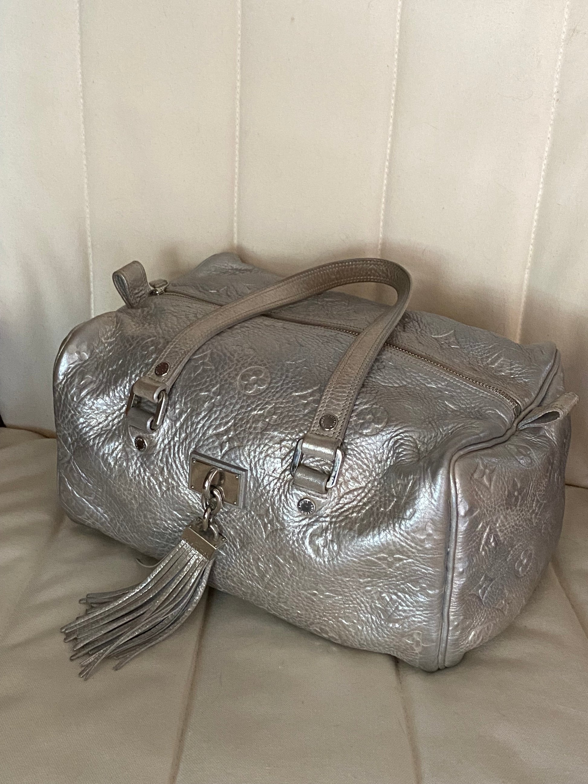 Pazzesco bauletto comète della collezione mono shimmer del f/w 2008. Edizione limitata in pelle di vitello argento metallizzato con brillantini. Usata con qualche segno sulla pelle e sui manici ma buonissime condizioni generali.