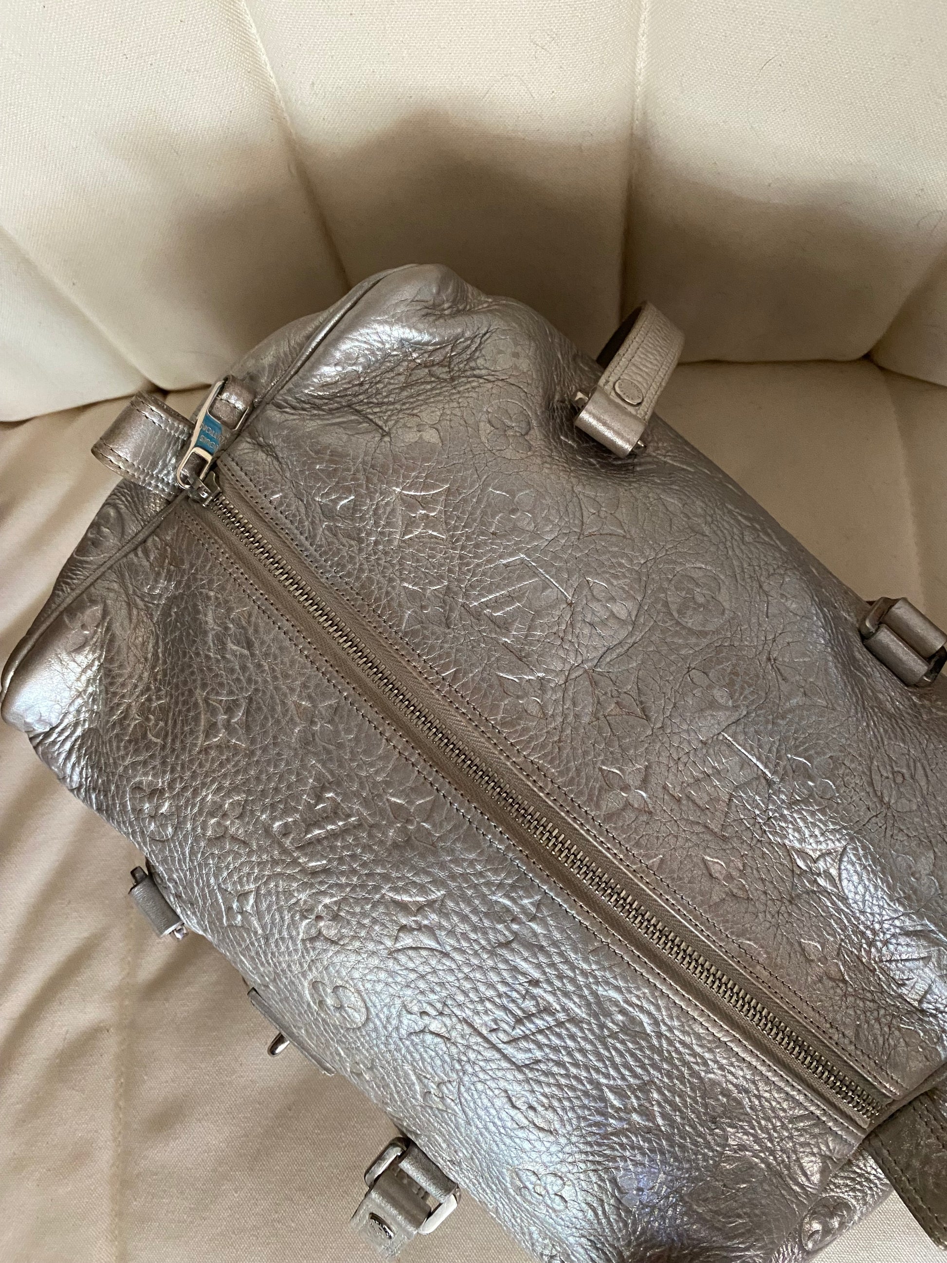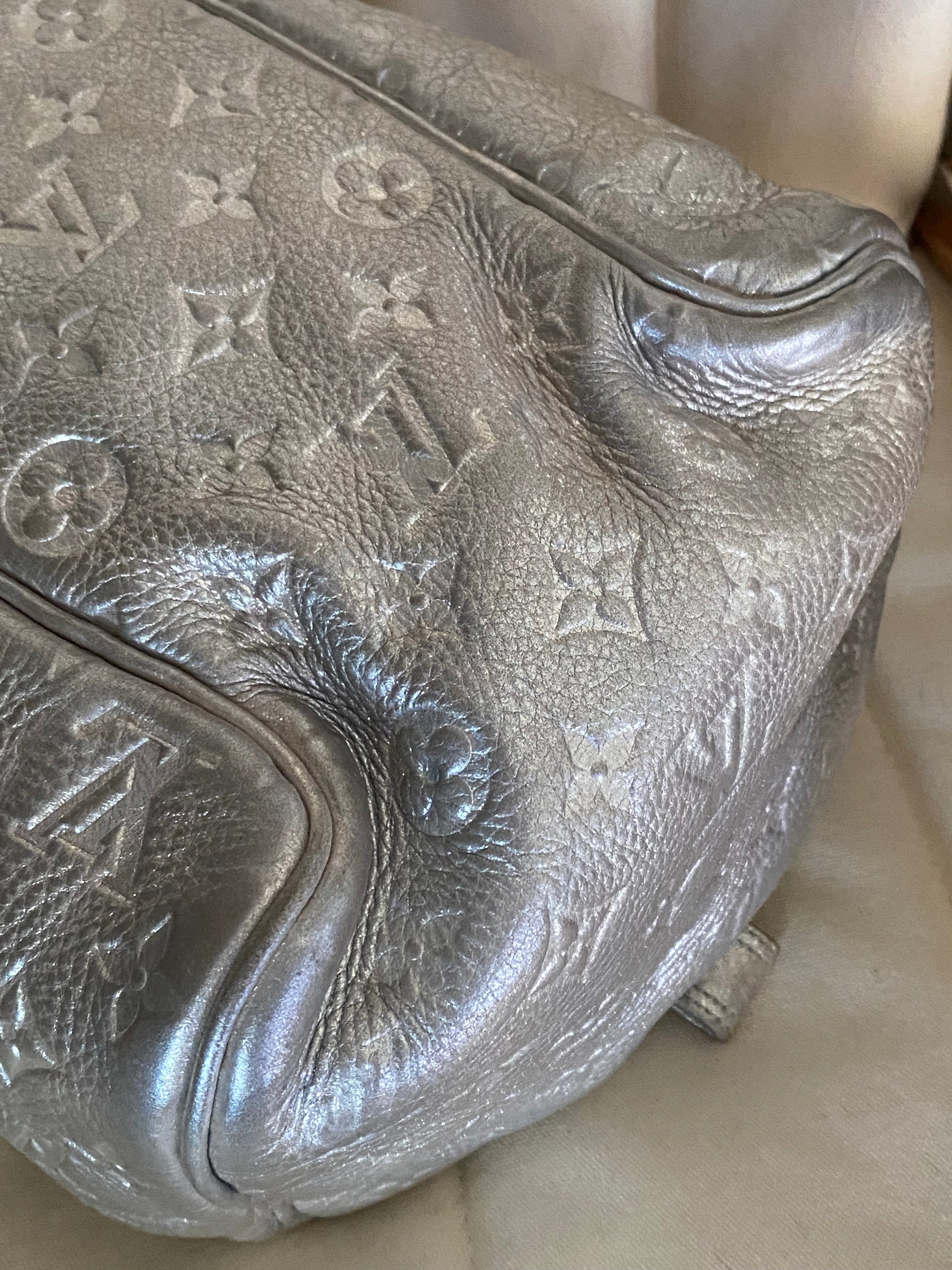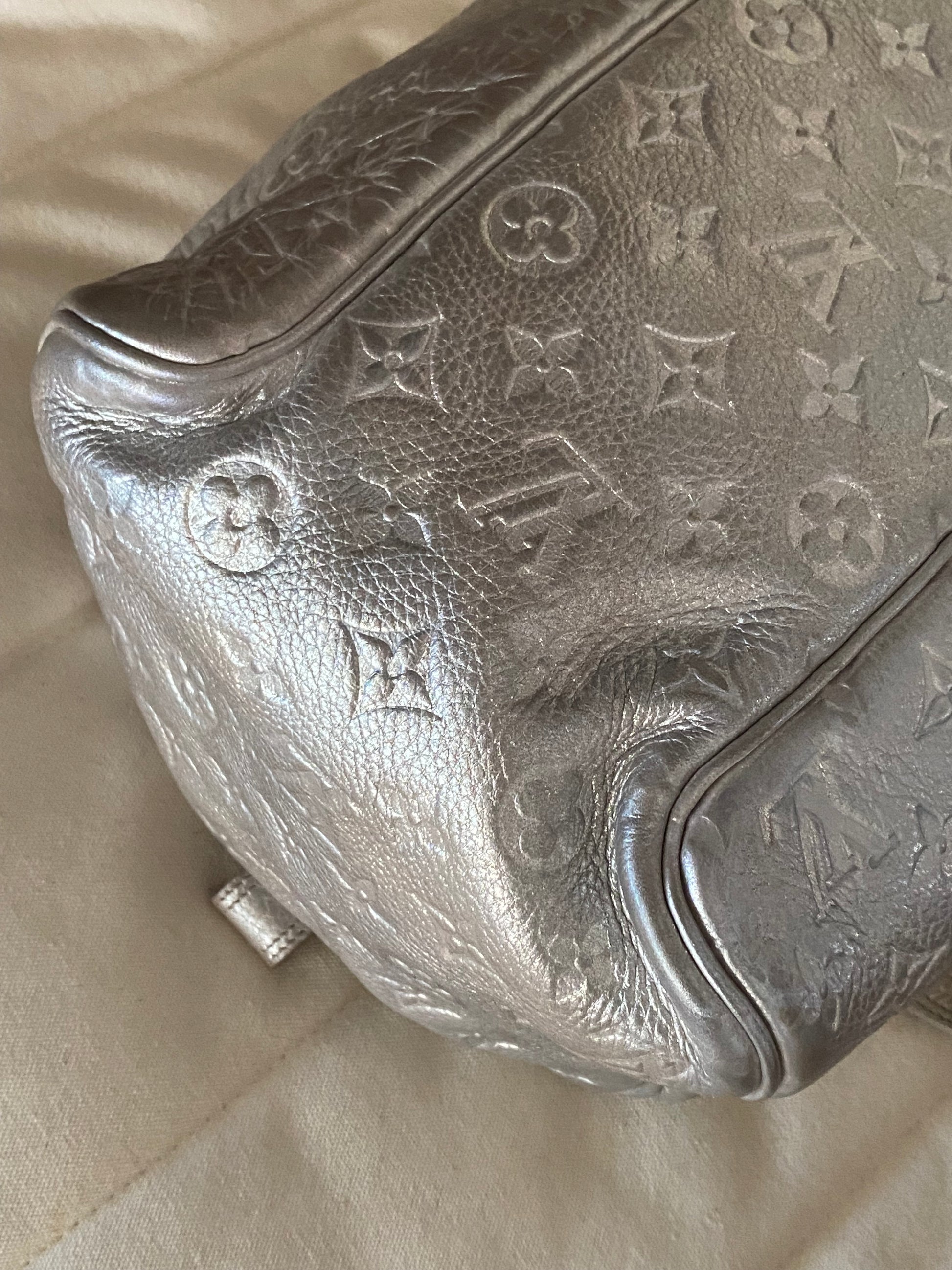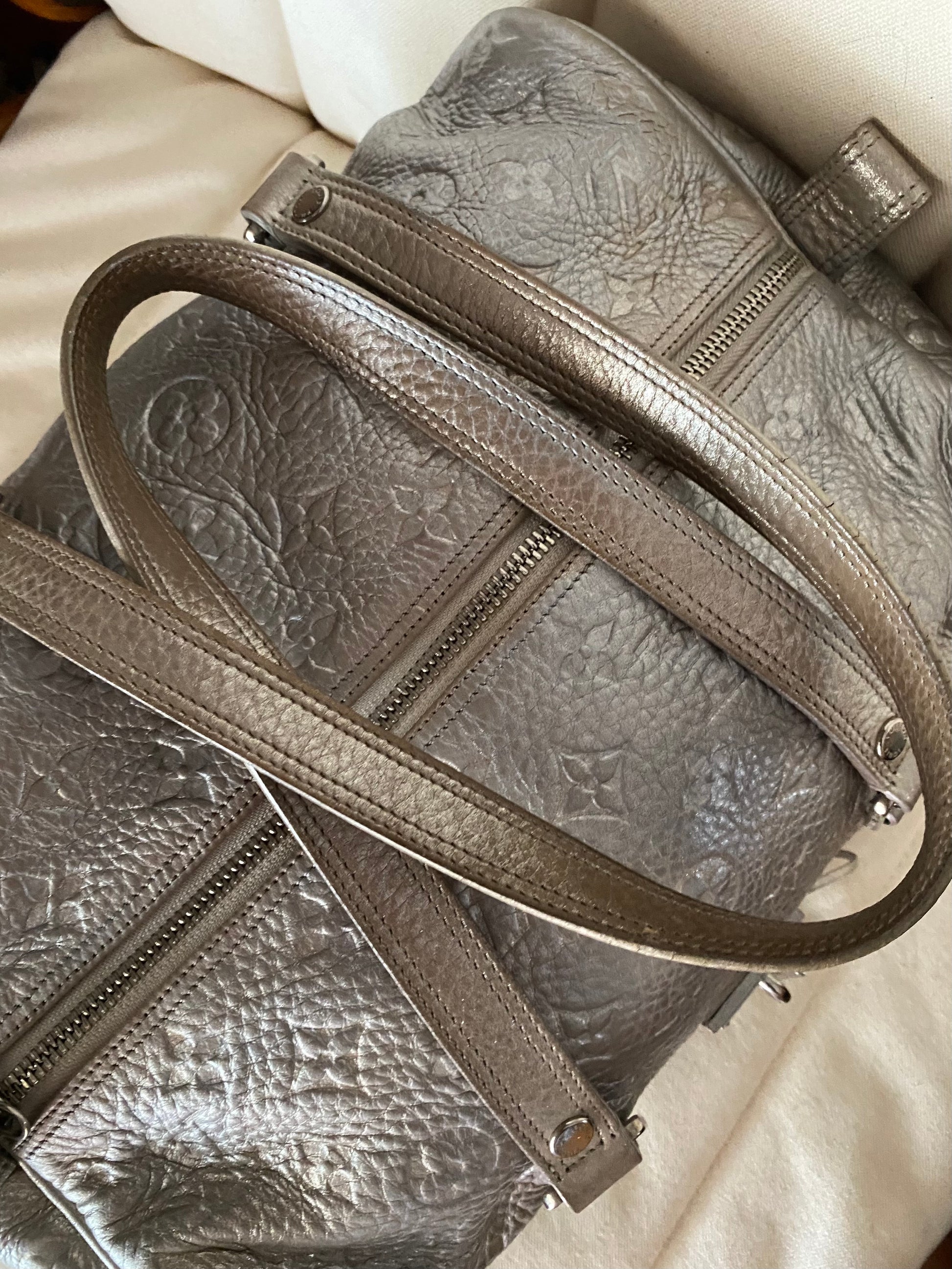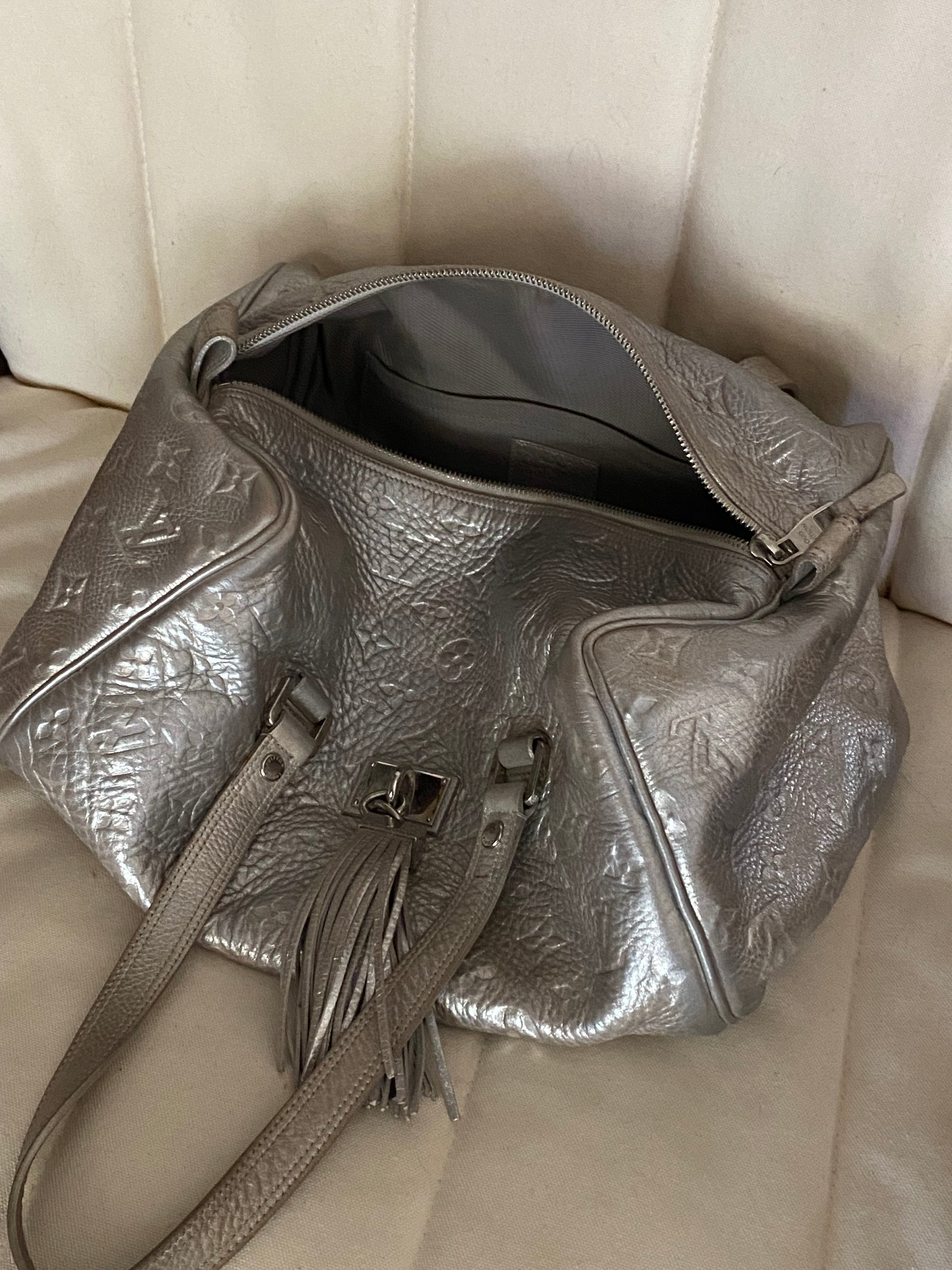 Pazzesco bauletto comète della collezione mono shimmer del f/w 2008. Edizione limitata in pelle di vitello argento metallizzato con brillantini. Usata con qualche segno sulla pelle e sui manici ma buonissime condizioni generali.