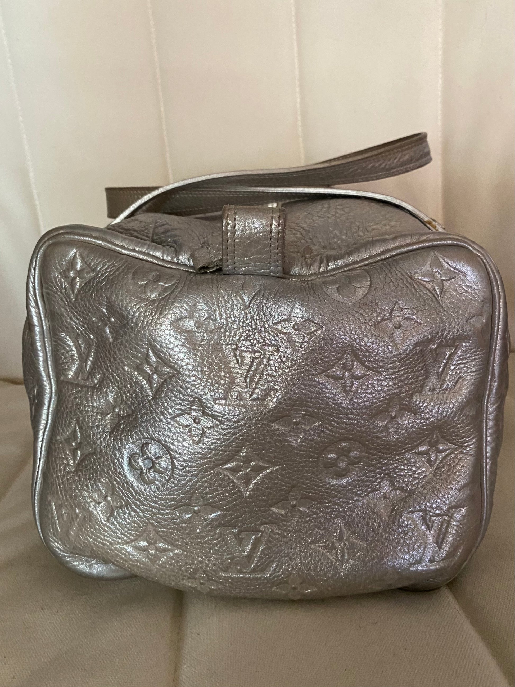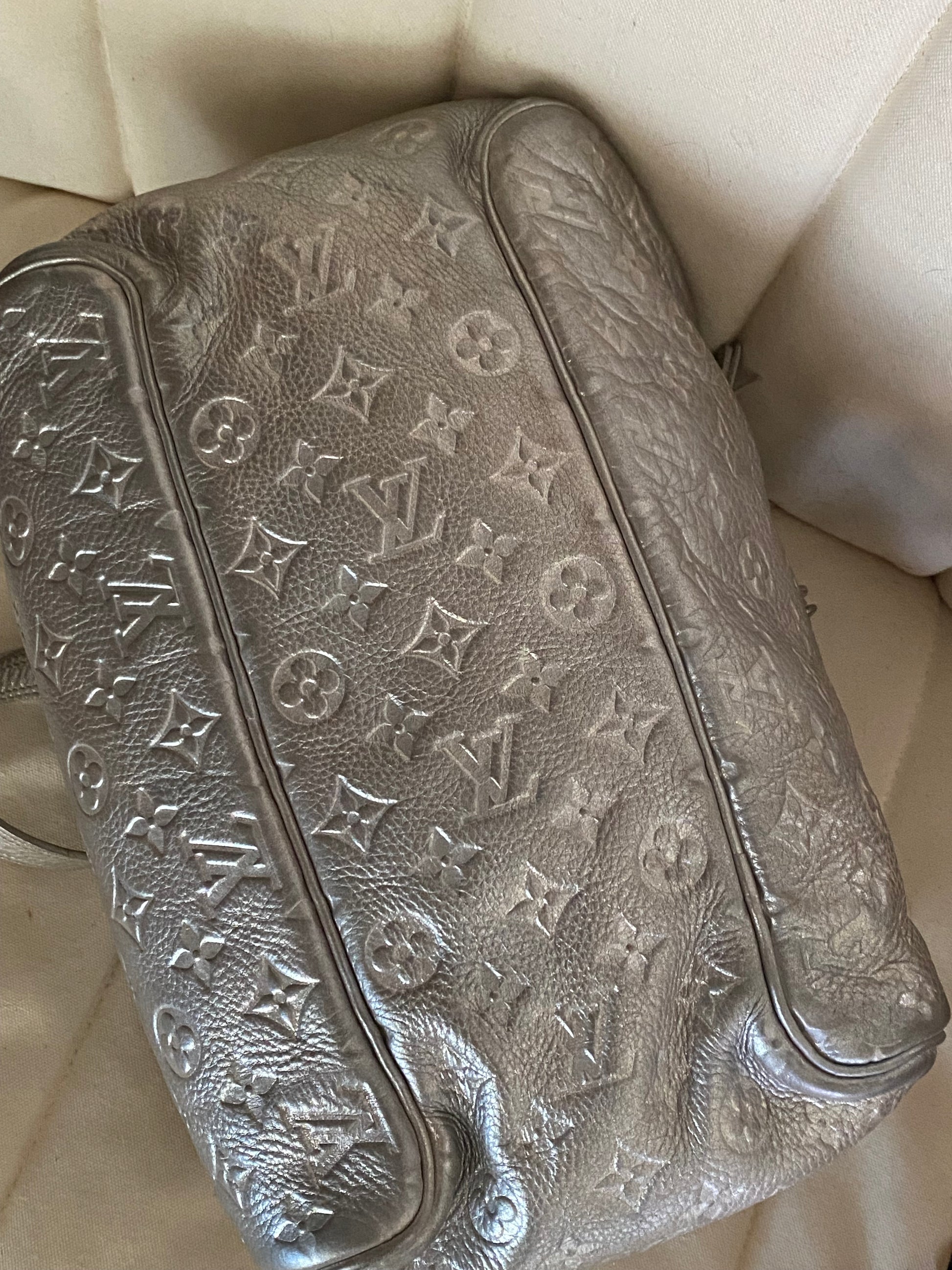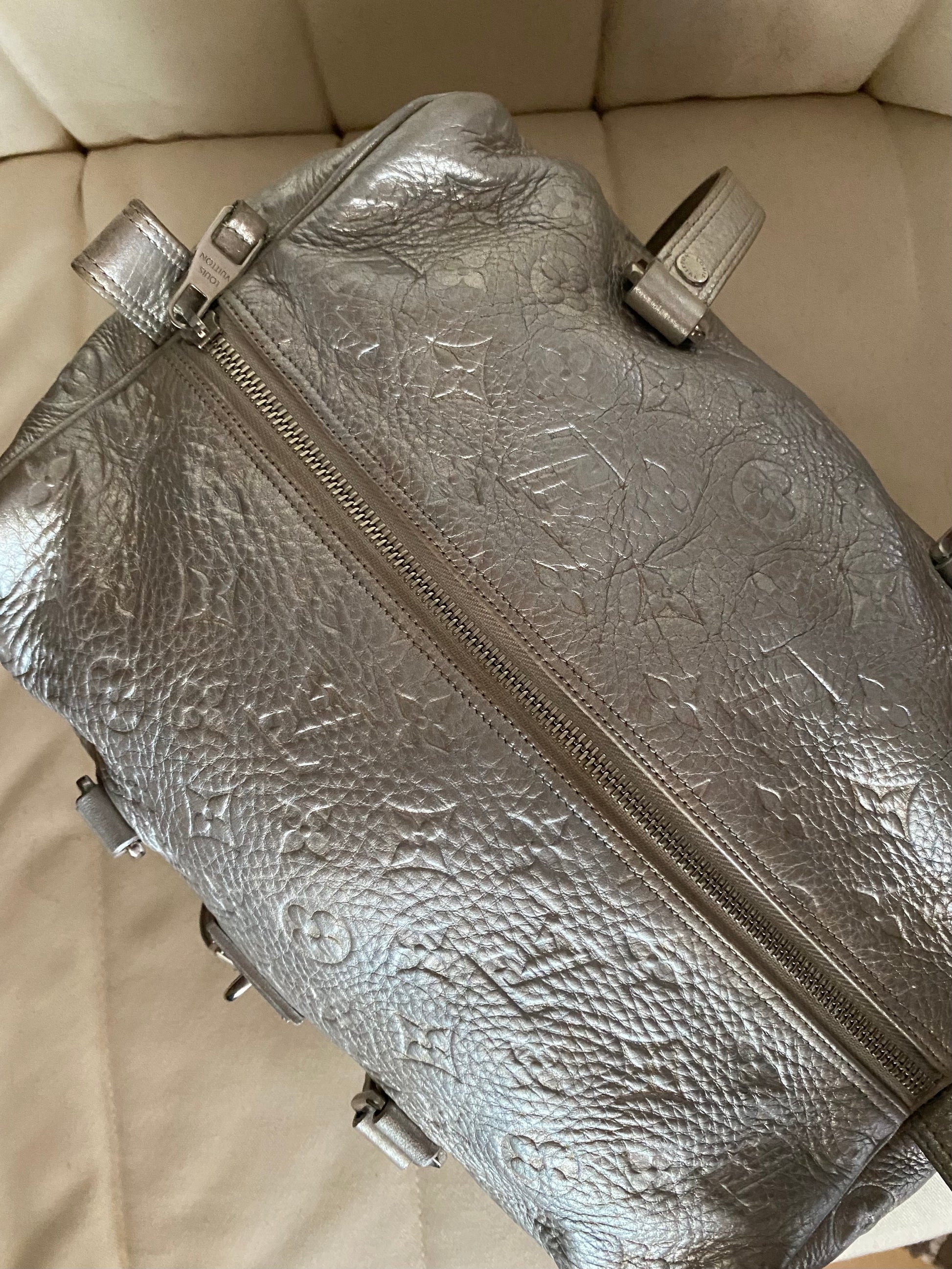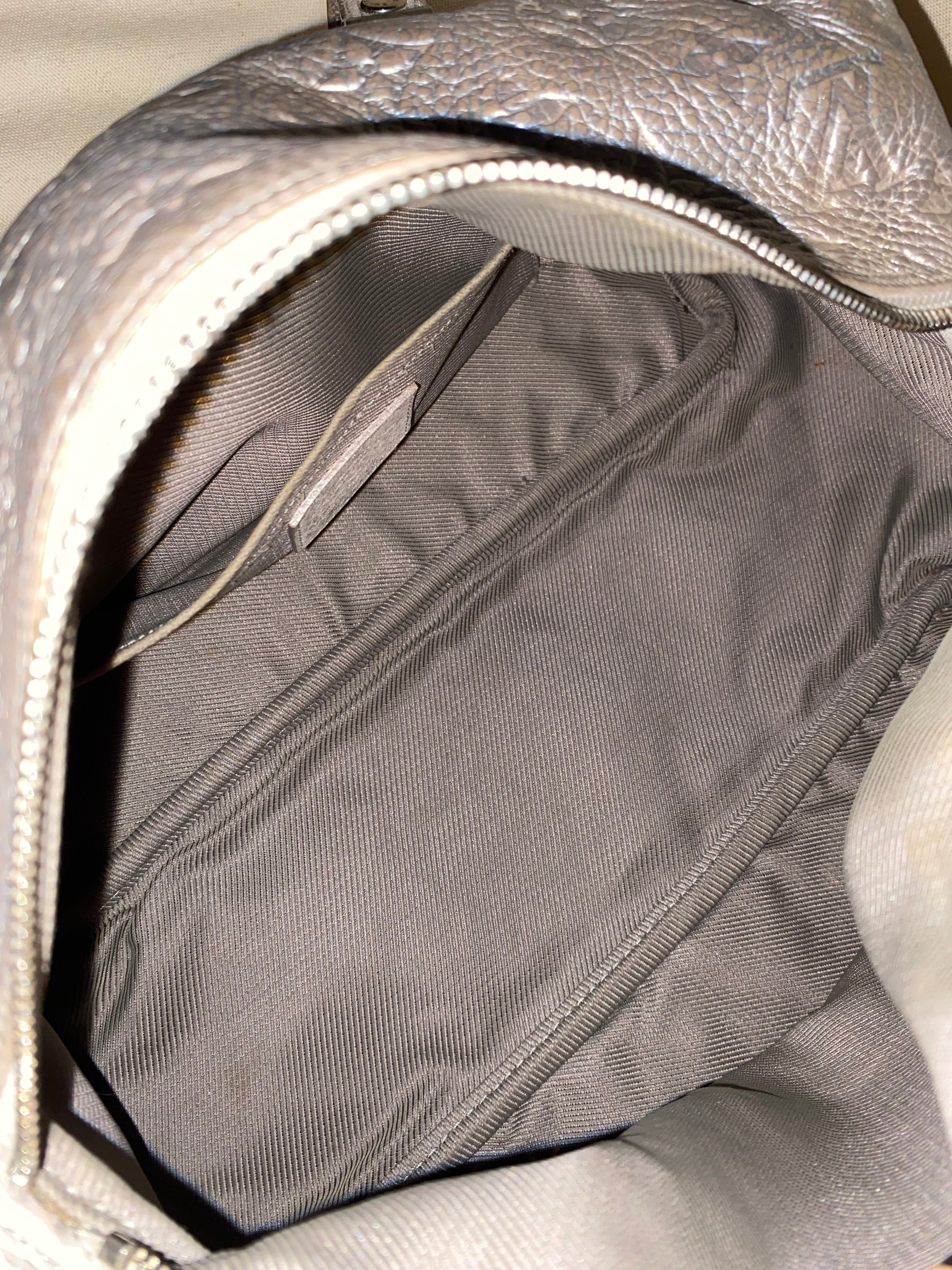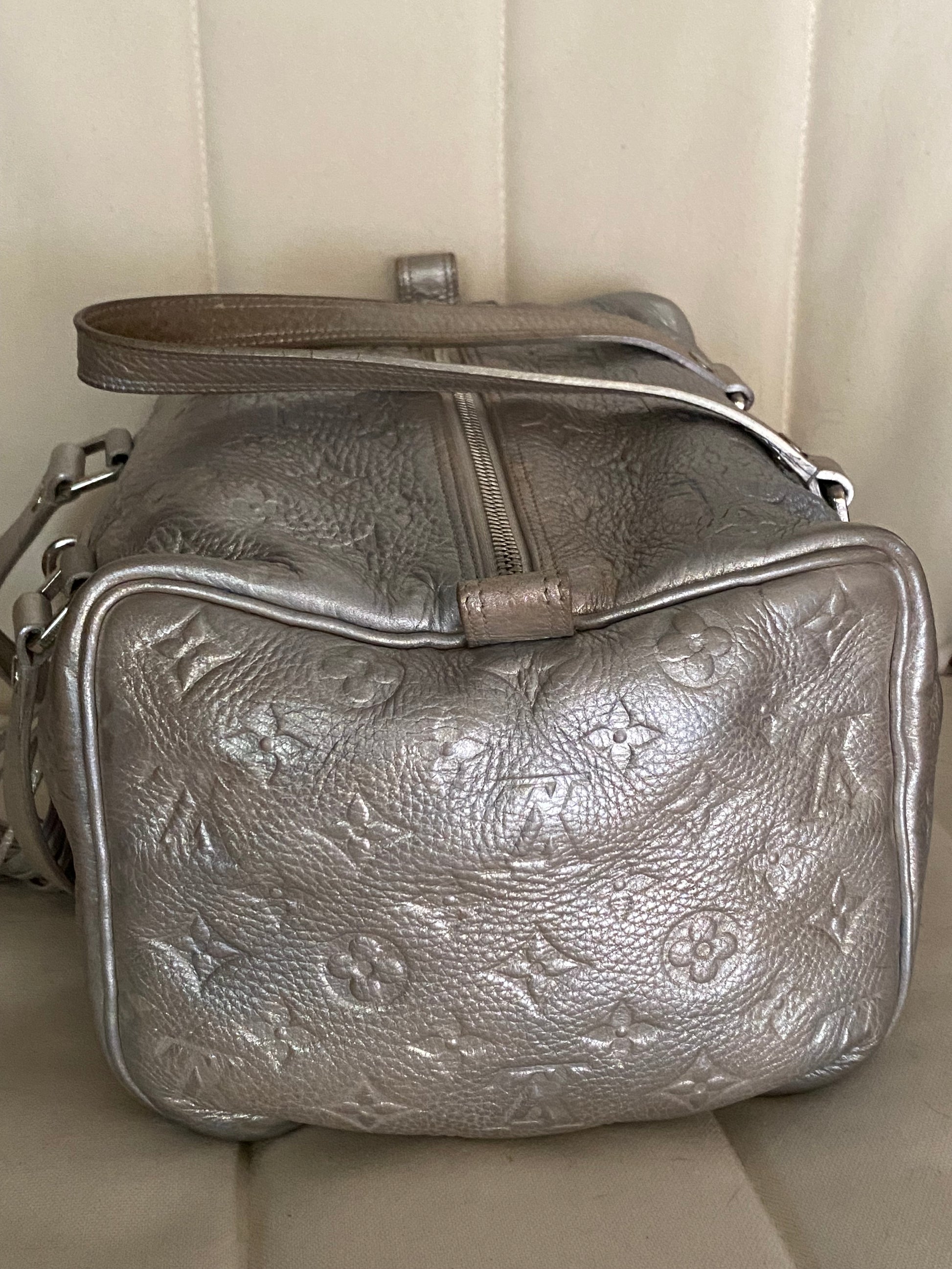 Pazzesco bauletto comète della collezione mono shimmer del f/w 2008. Edizione limitata in pelle di vitello argento metallizzato con brillantini. Usata con qualche segno sulla pelle e sui manici ma buonissime condizioni generali.