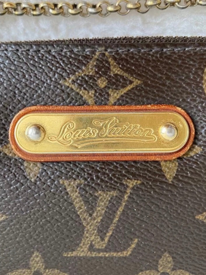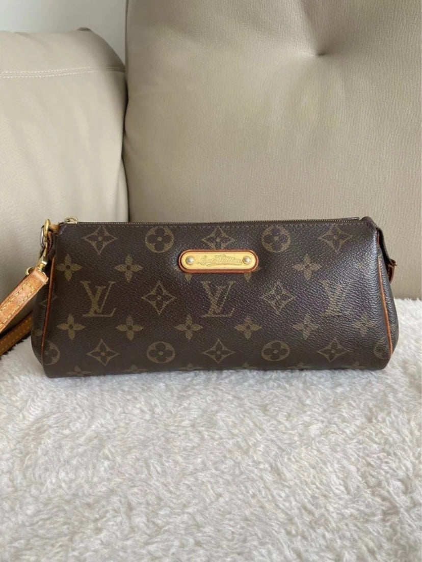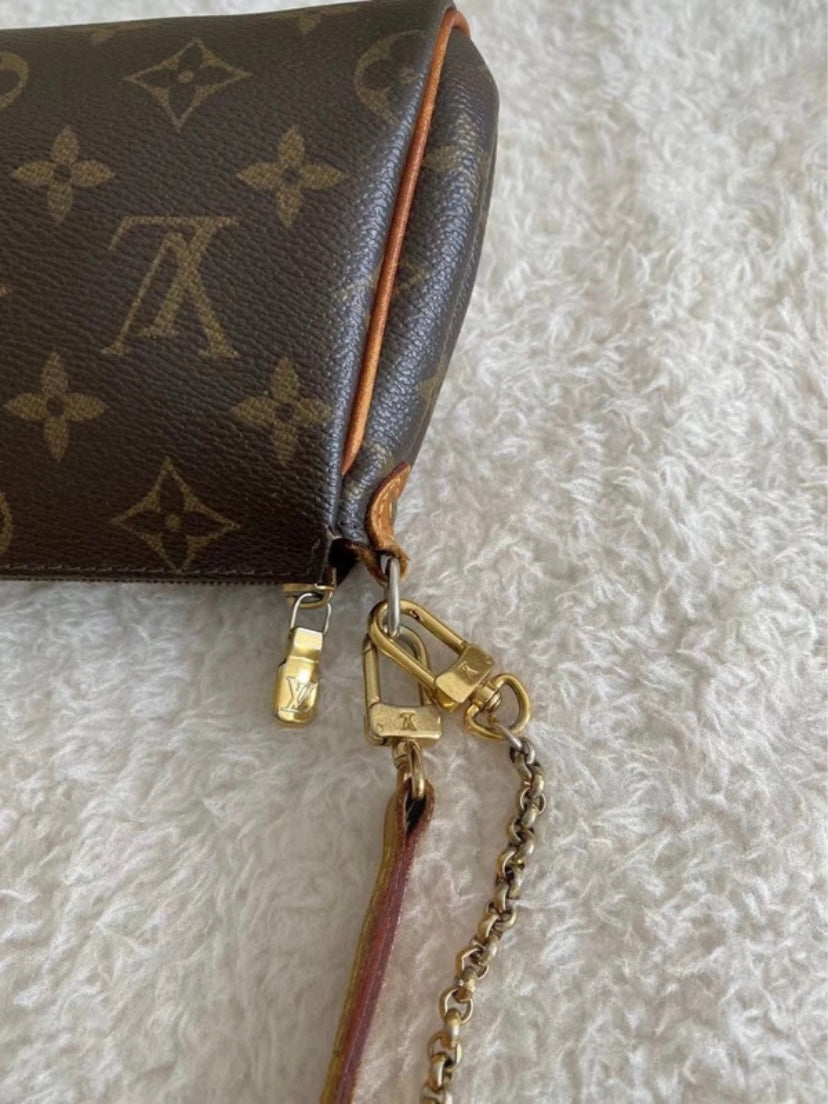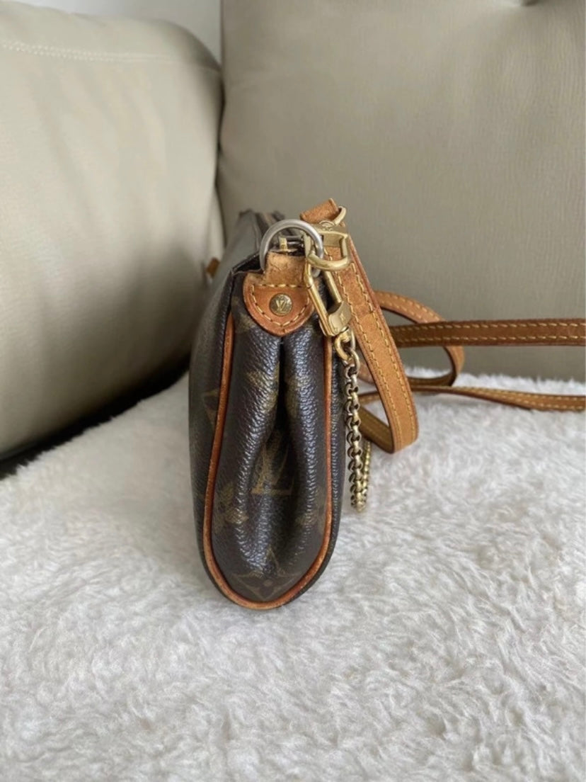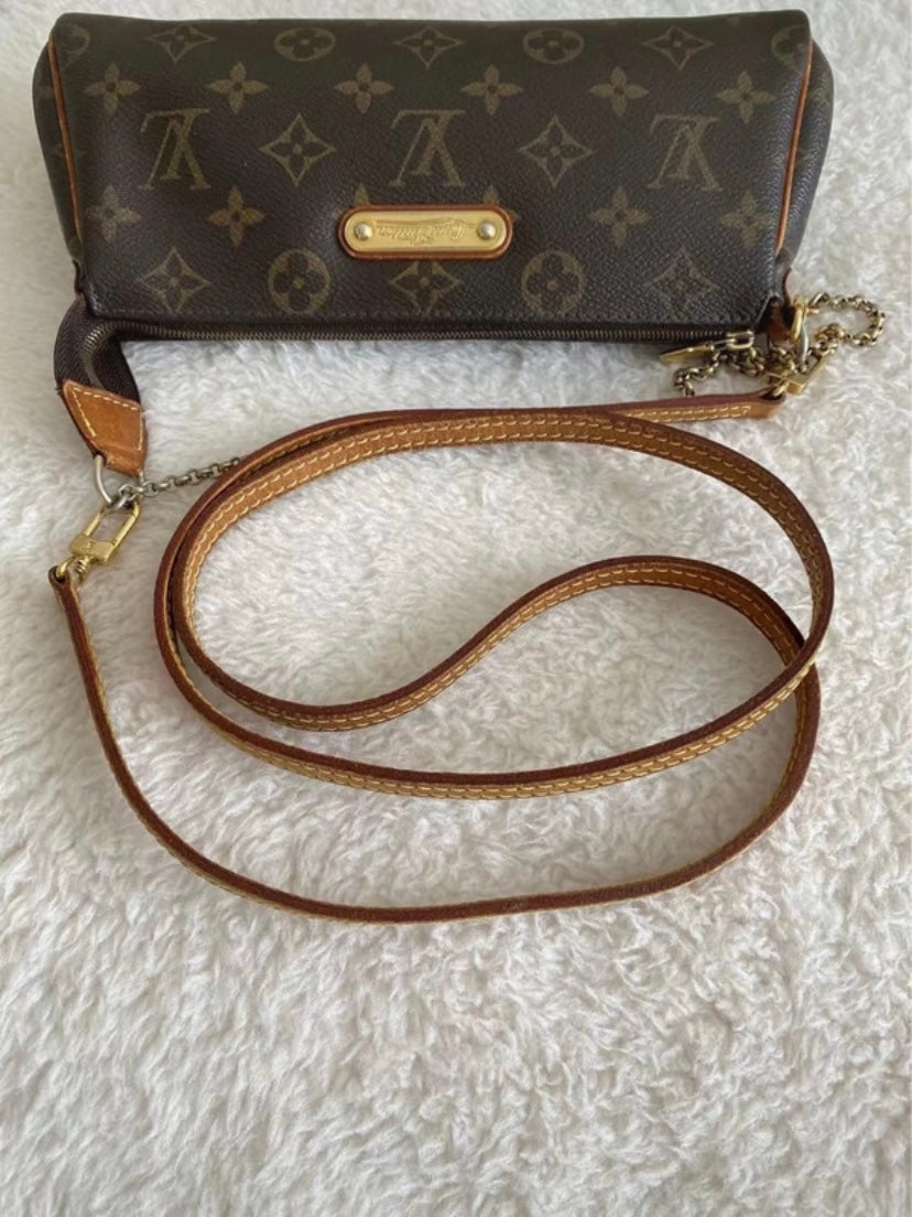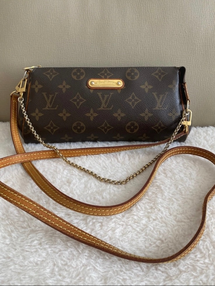 Louis Vuitton Eva con catena e tracolla in pelle (entrambe originali, loggate e caratteristiche di questo modello). La catena permette di portarla a spalla e la fibbia in pelle a tracolla.