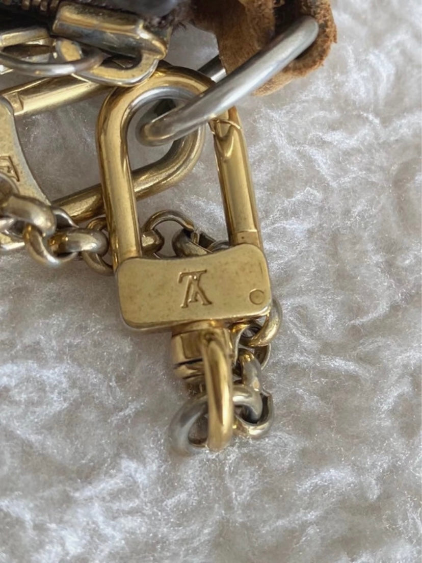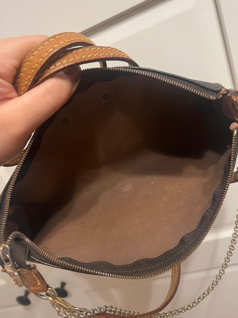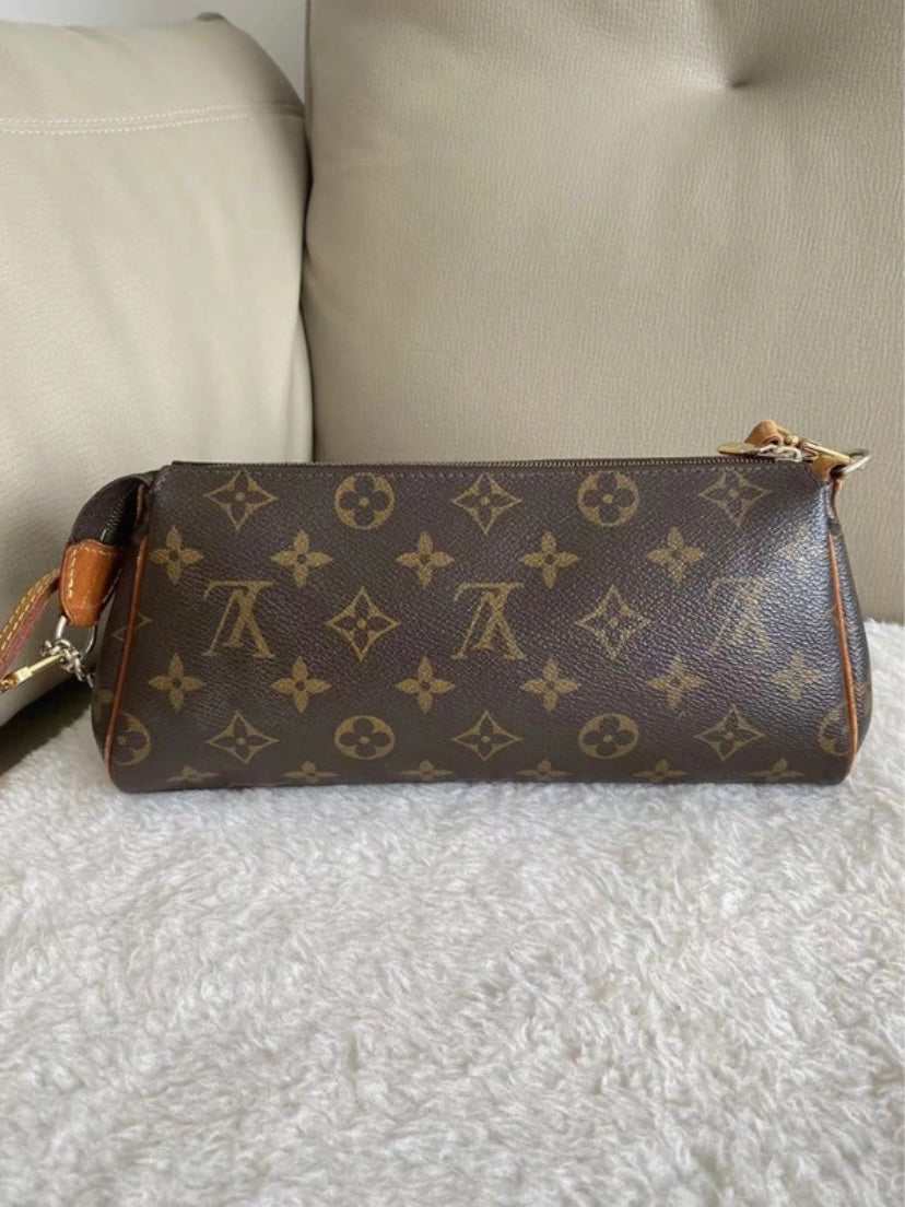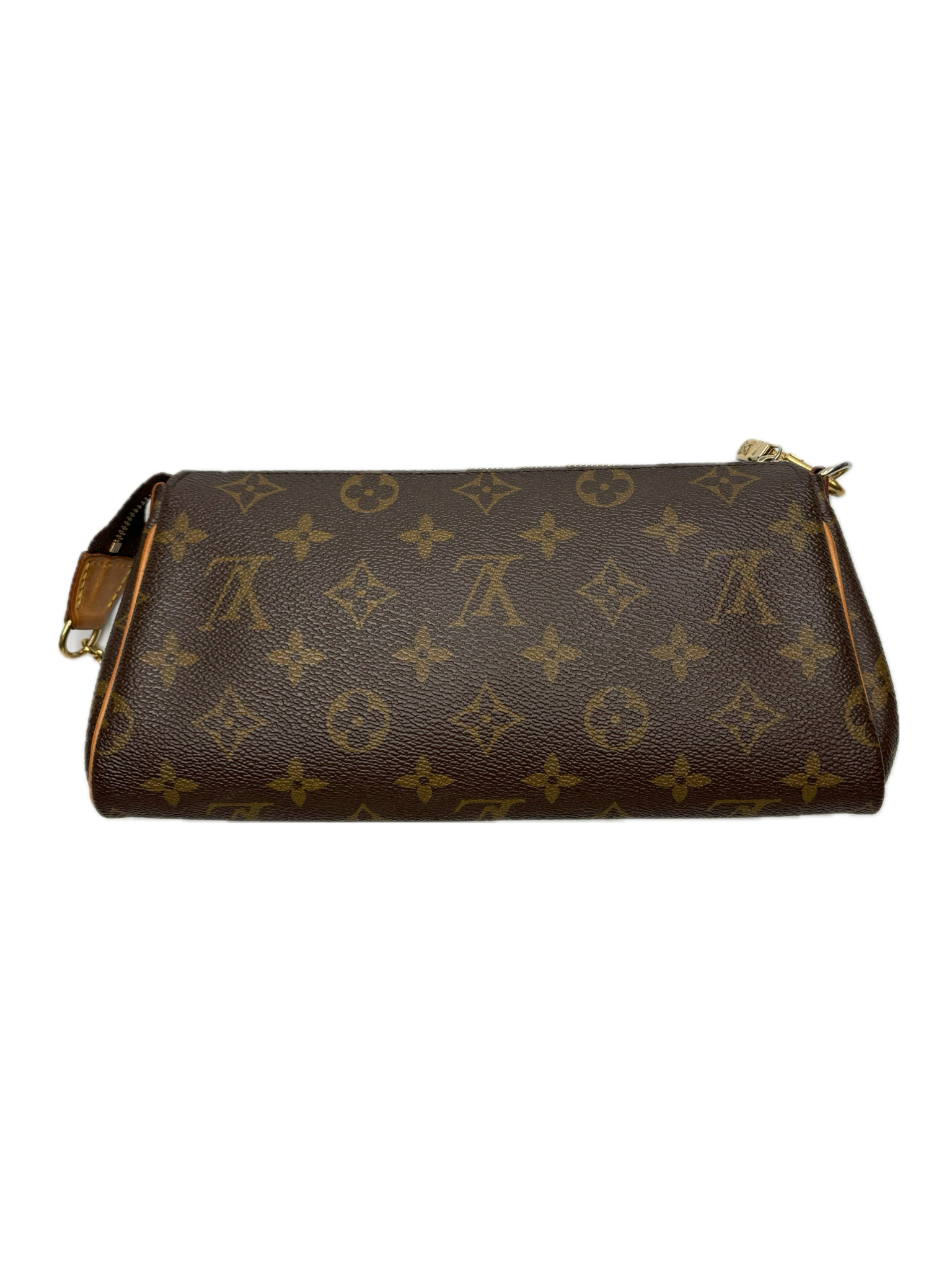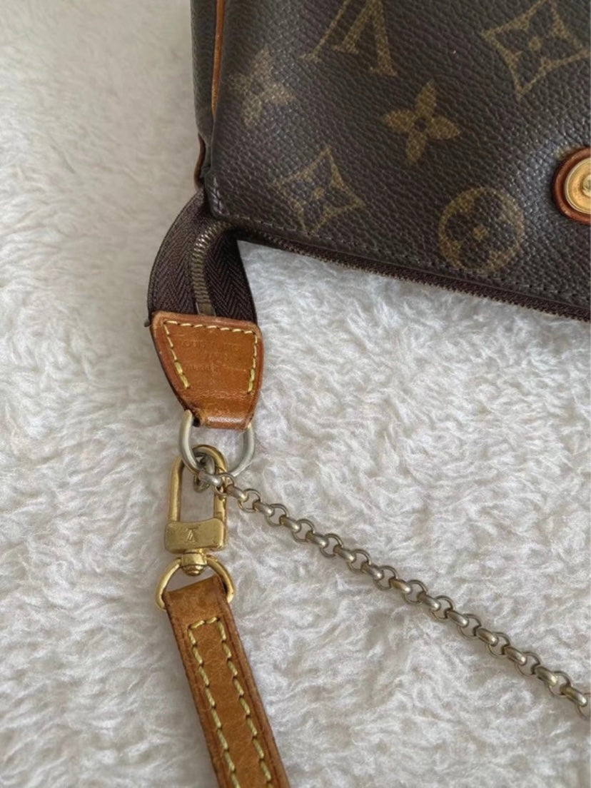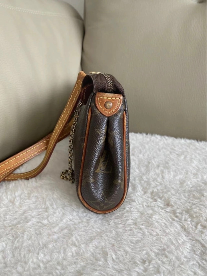 Louis Vuitton Eva con catena e tracolla in pelle (entrambe originali, loggate e caratteristiche di questo modello). La catena permette di portarla a spalla e la fibbia in pelle a tracolla.