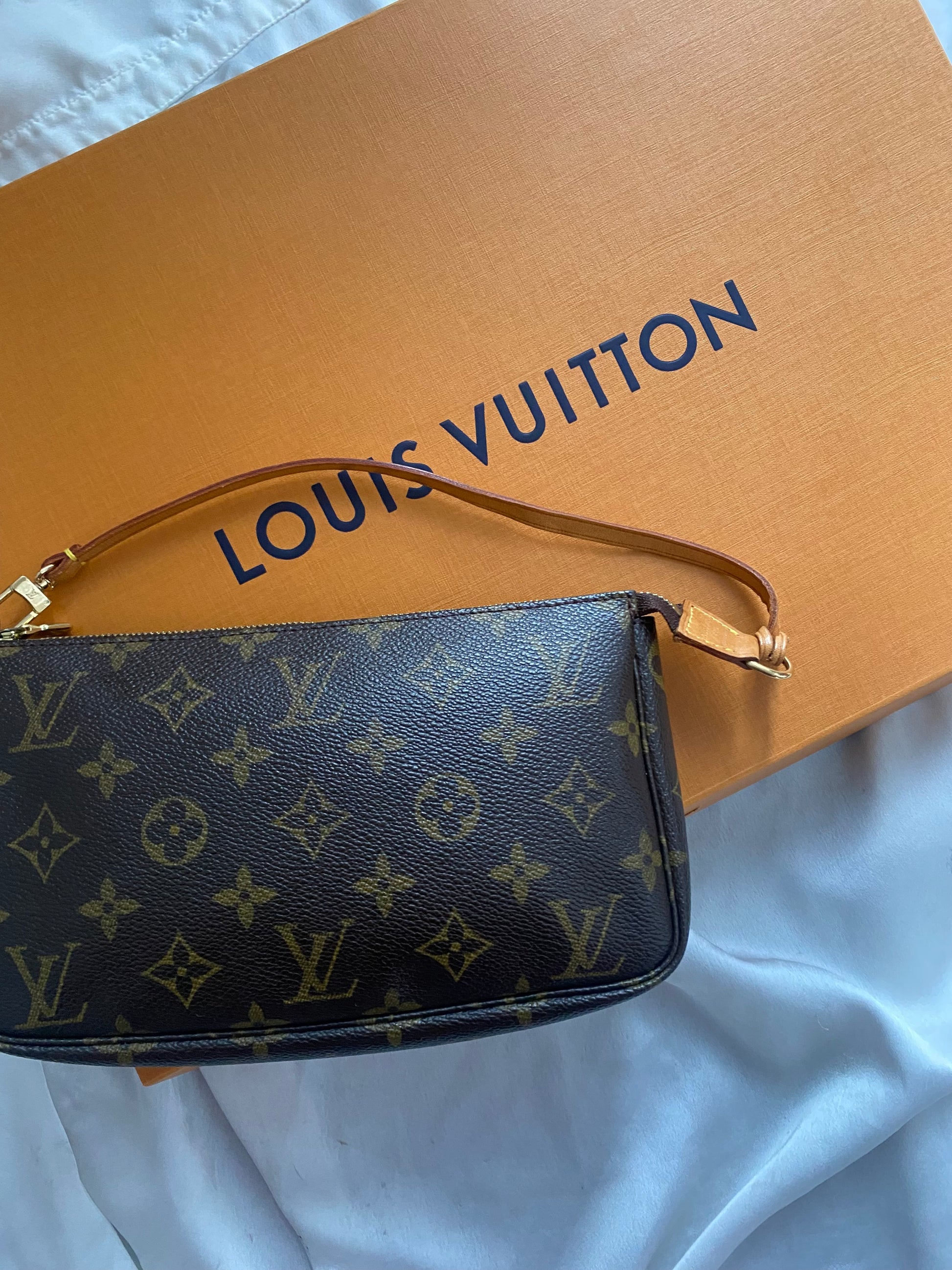 Stupenda e iconica pochette accessoire di Louis Vuitton. Minimi segni sulla tracollina e sull’hardware. Pelle ancora chiara di un bellissimo color miele, angoli e tela stupendi.