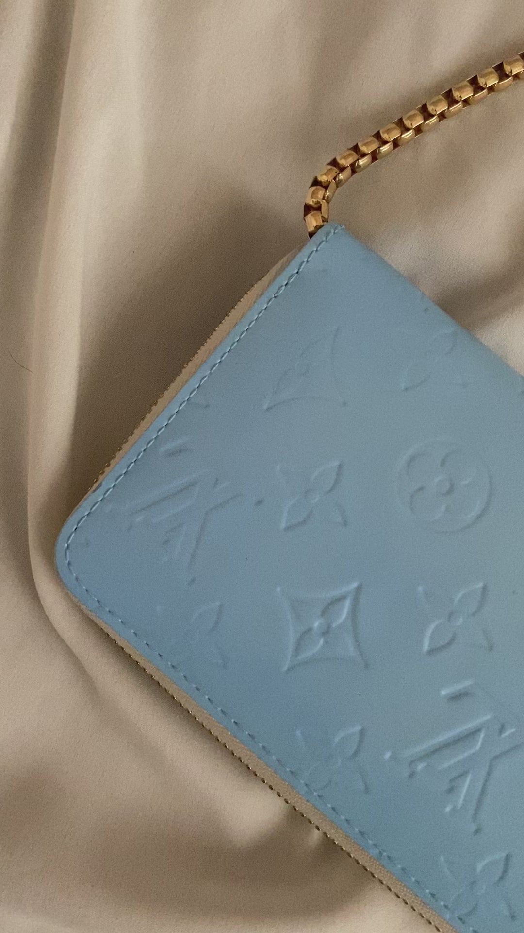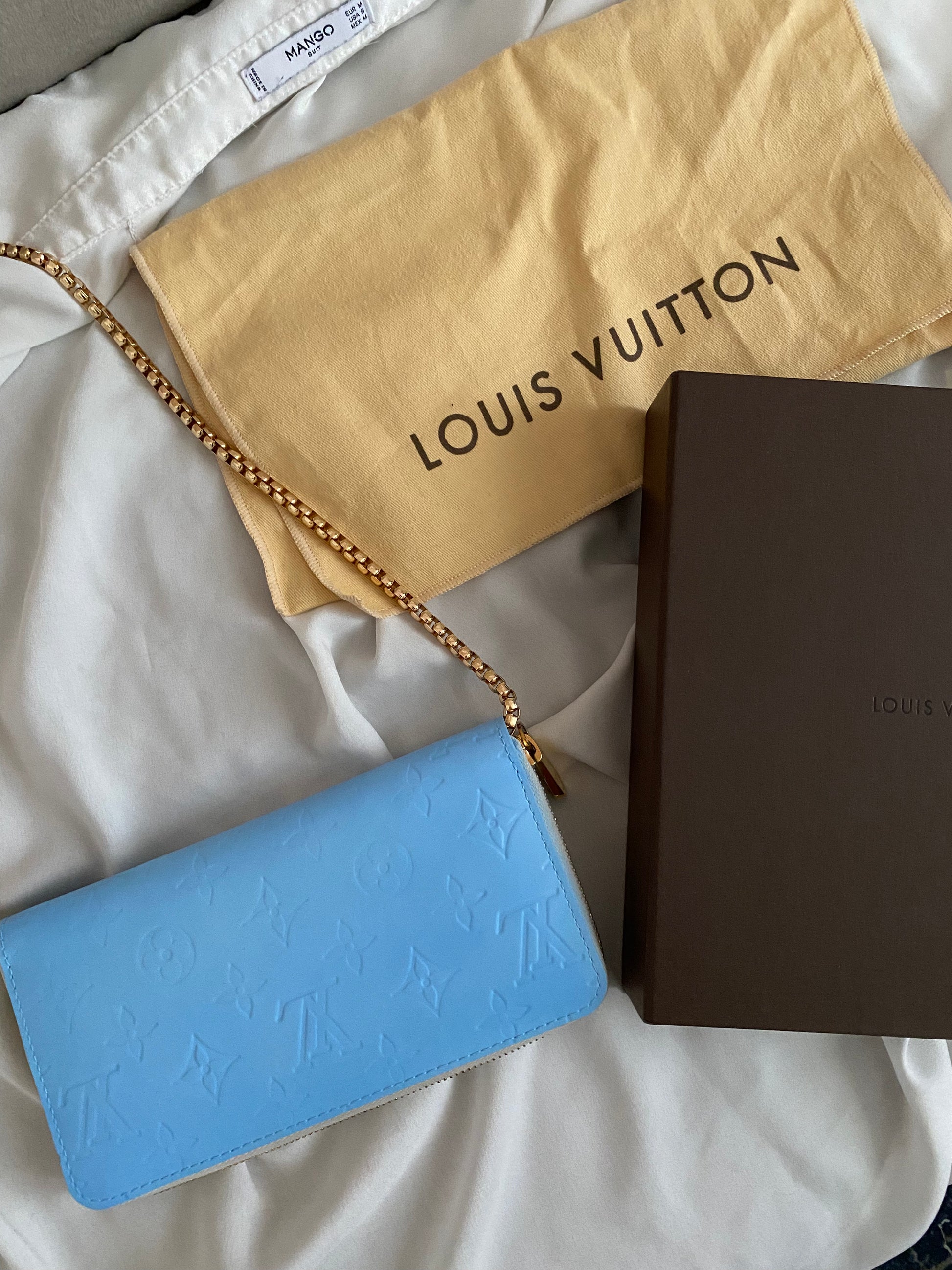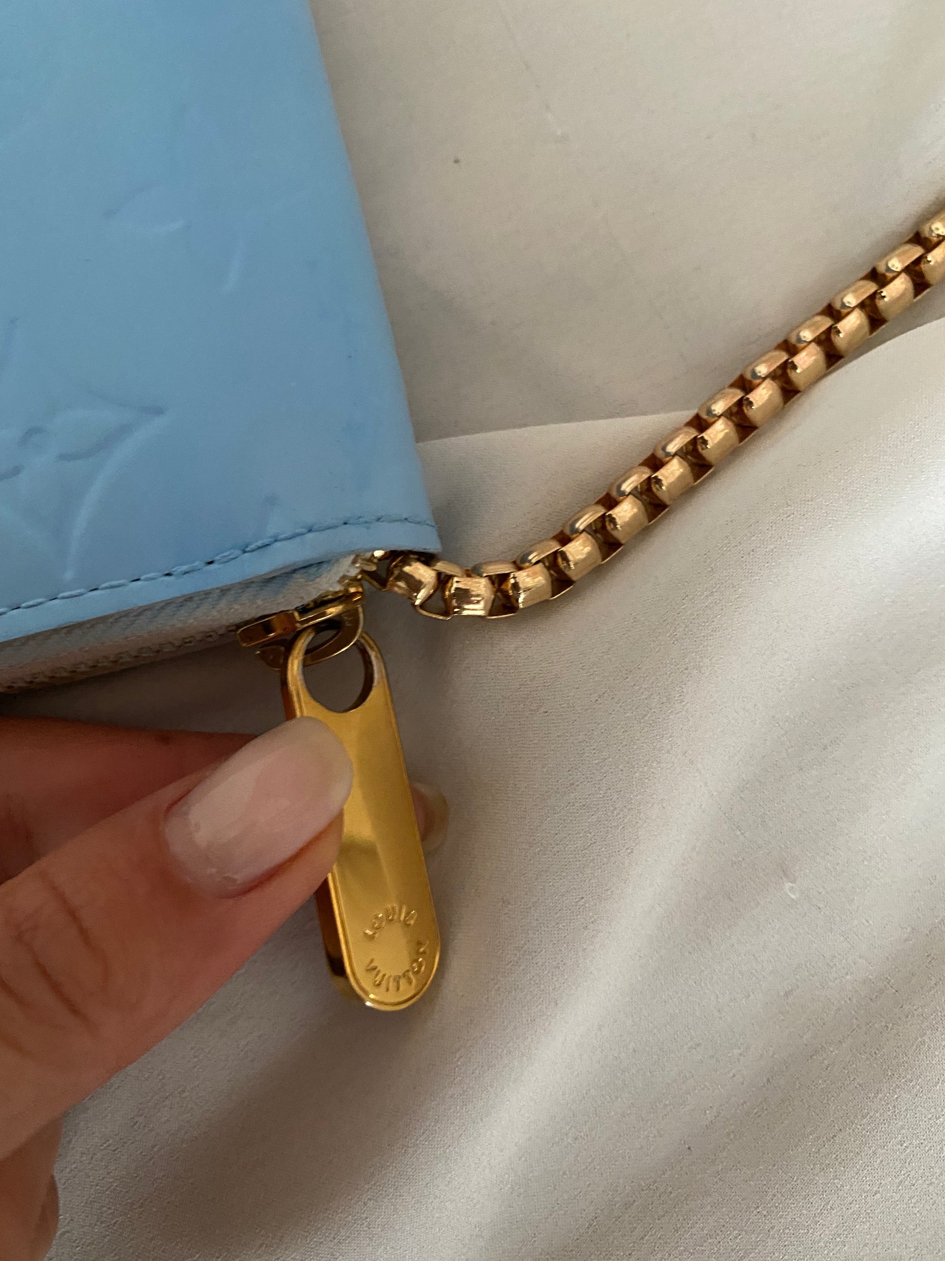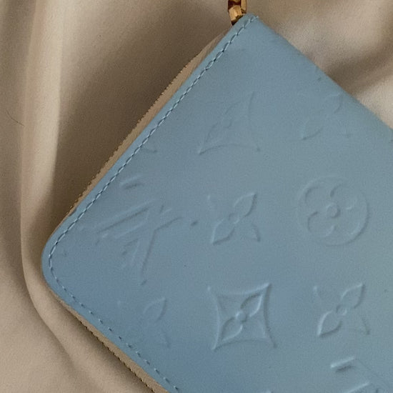 Meravigliosa pochette a spalla o a polso Louis Vuitton colore blu ghiacciaio. In pelle vernis e bordi bianchi.