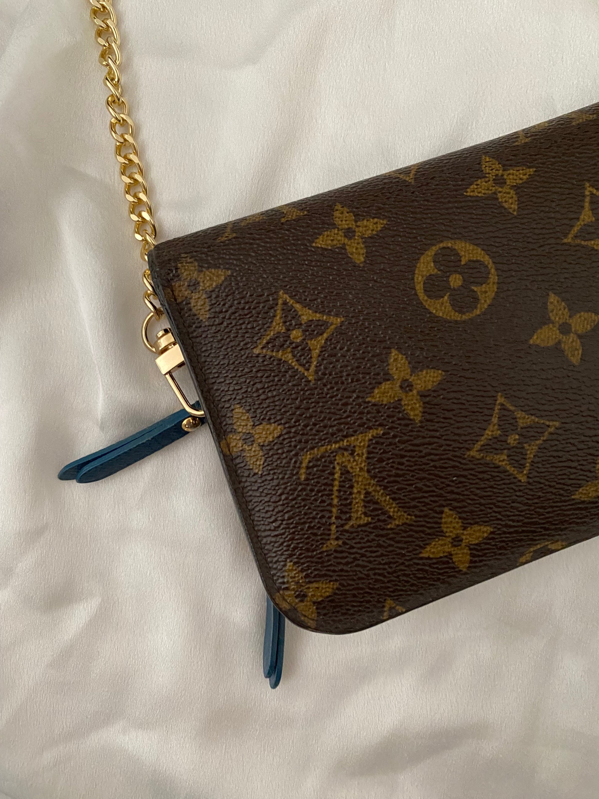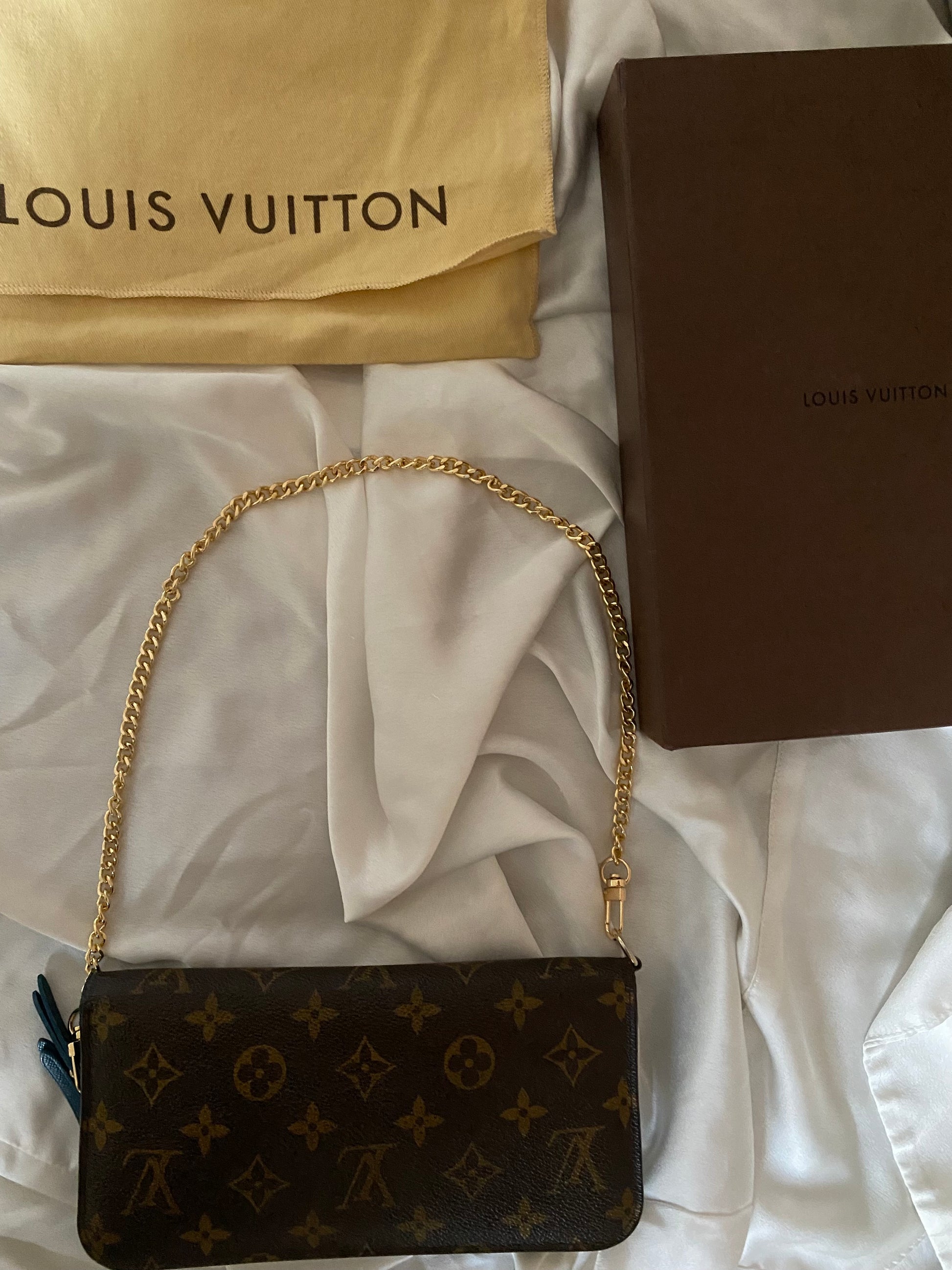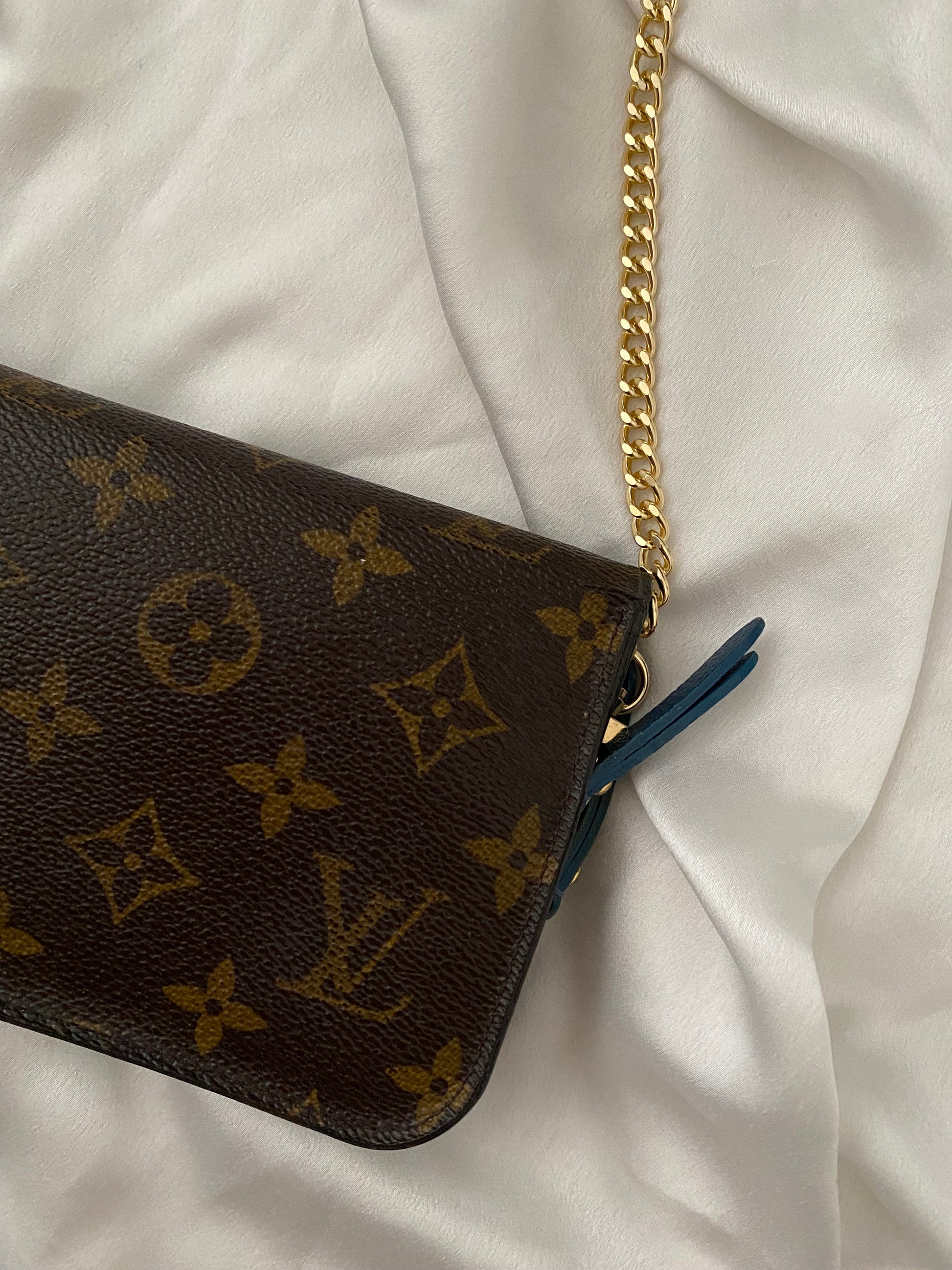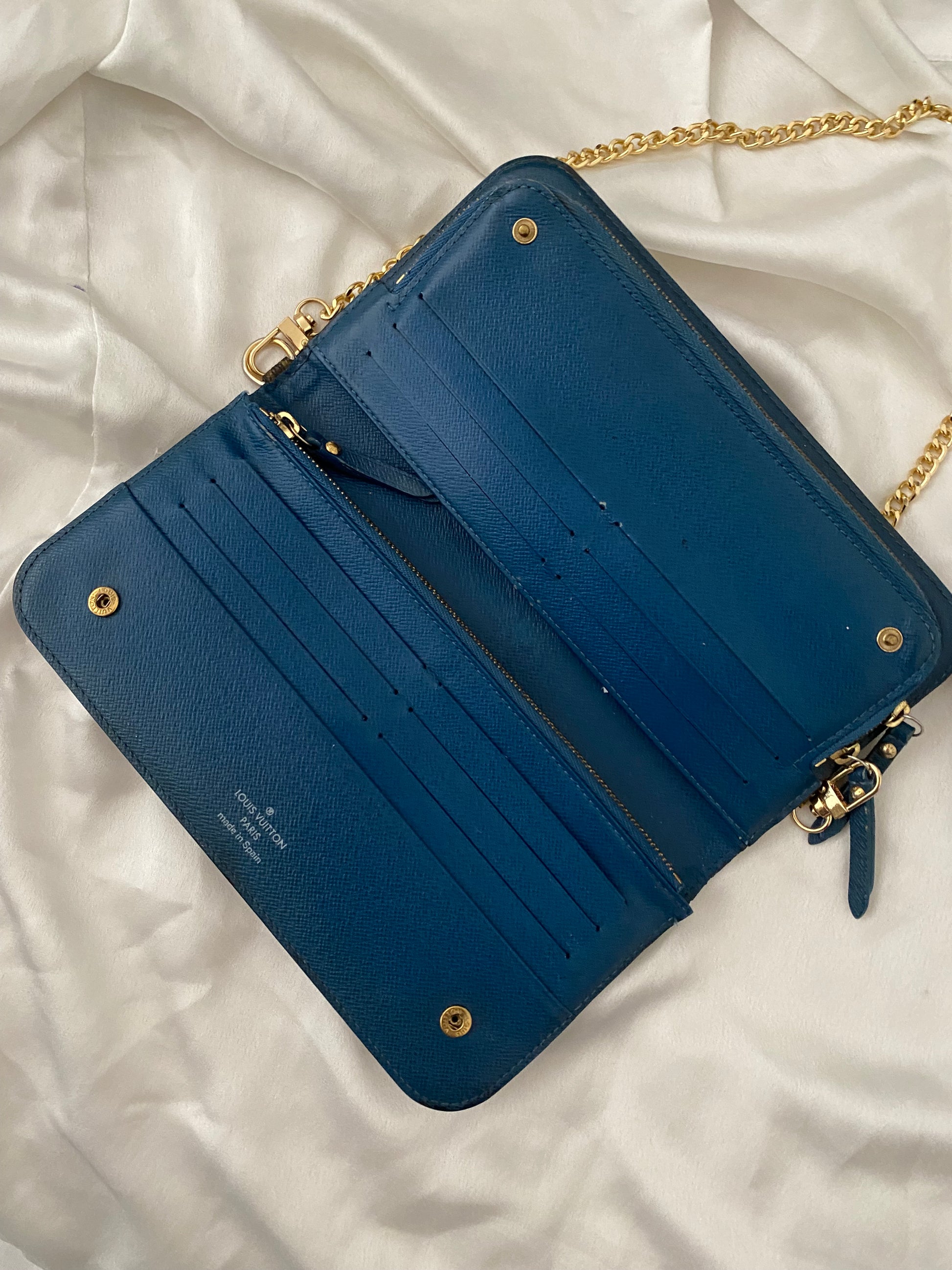 Pochette Louis Vuitton insolite. Catena aggiunta. Alcuni segni sui bordi. Buonissime condizioni generali. Interno in pelle blu pazzesco.