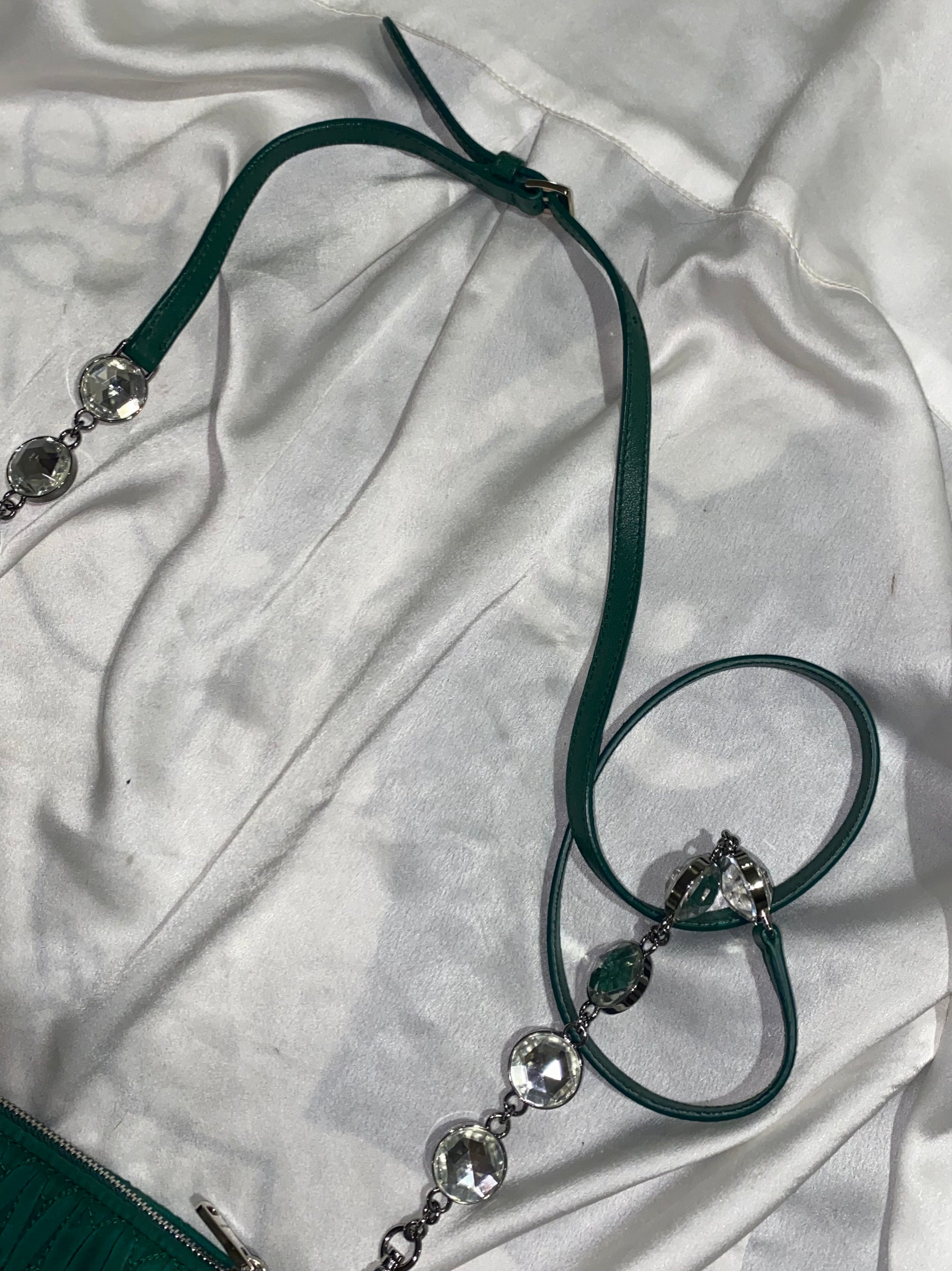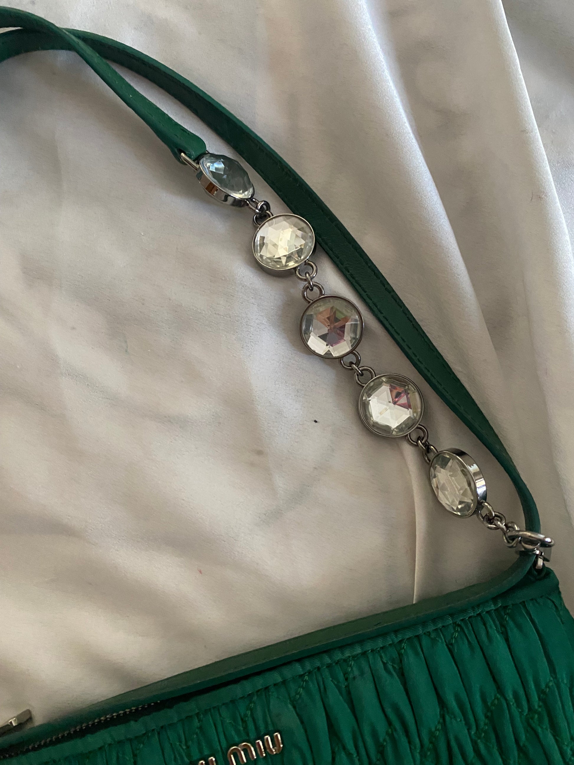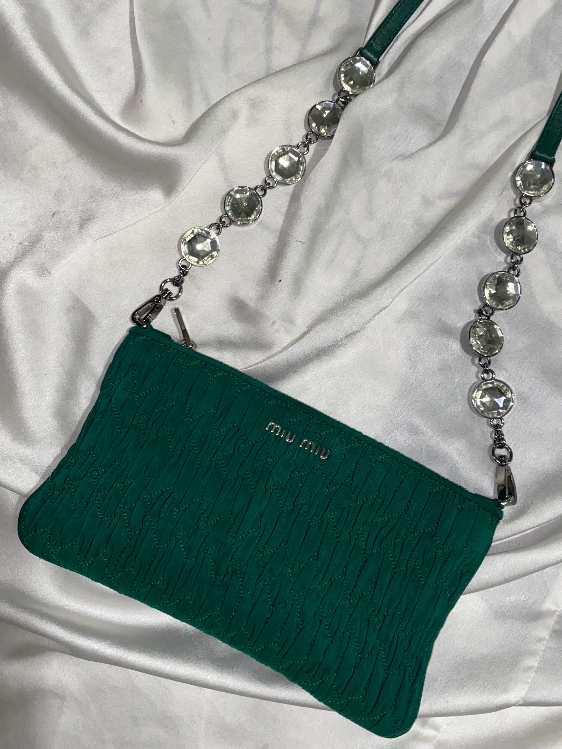Meravigliosa miu miu verde con tracolla con cristalli. Qualche segno sul tessuto. Hardware brillante. Buonissime condizioni generali e completa di dustbag.
