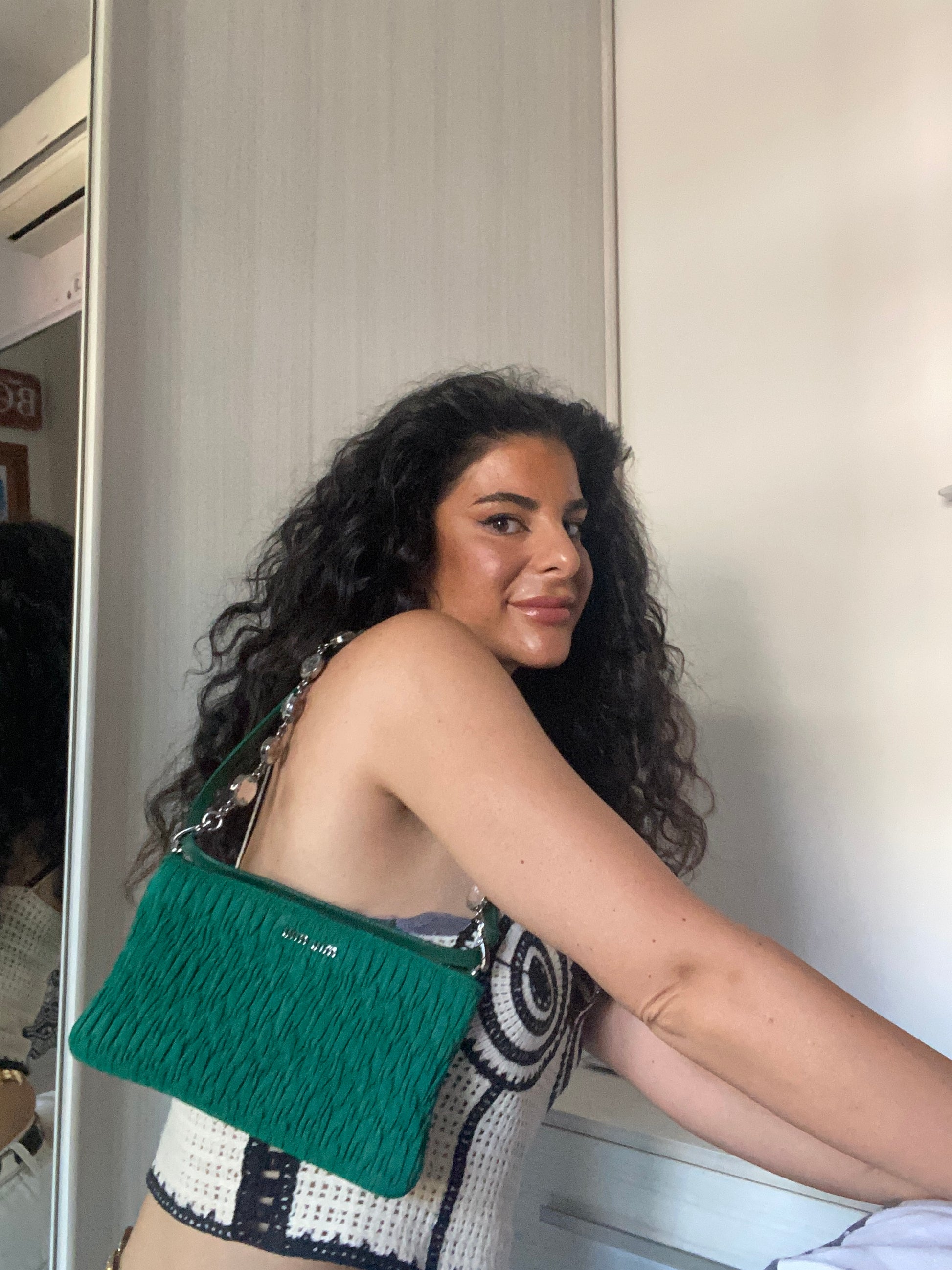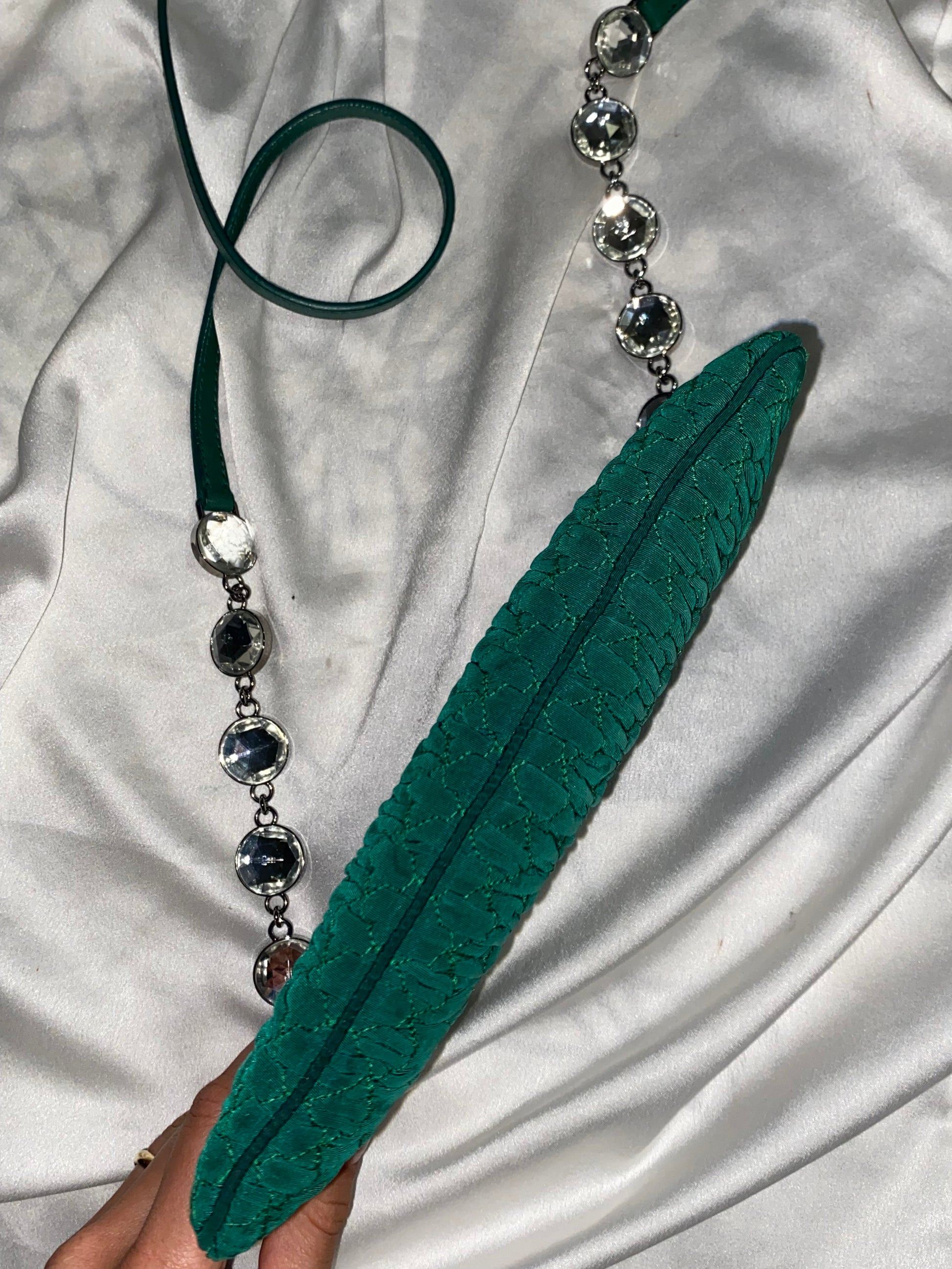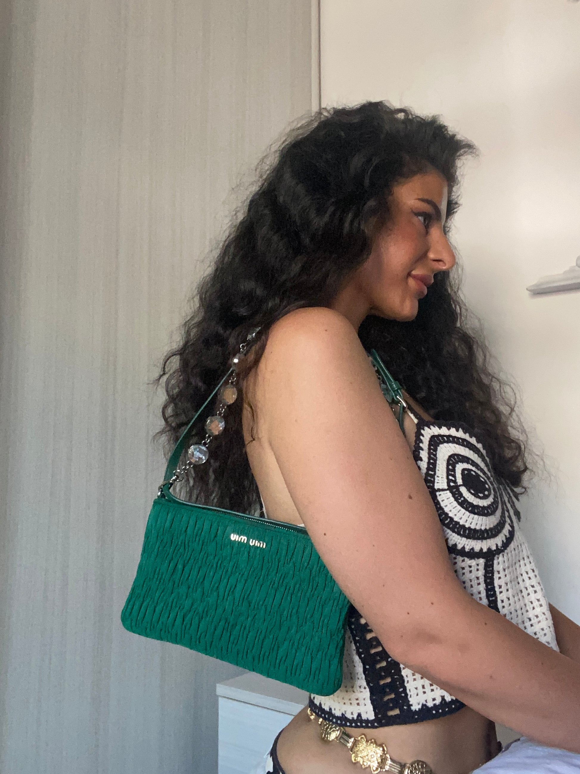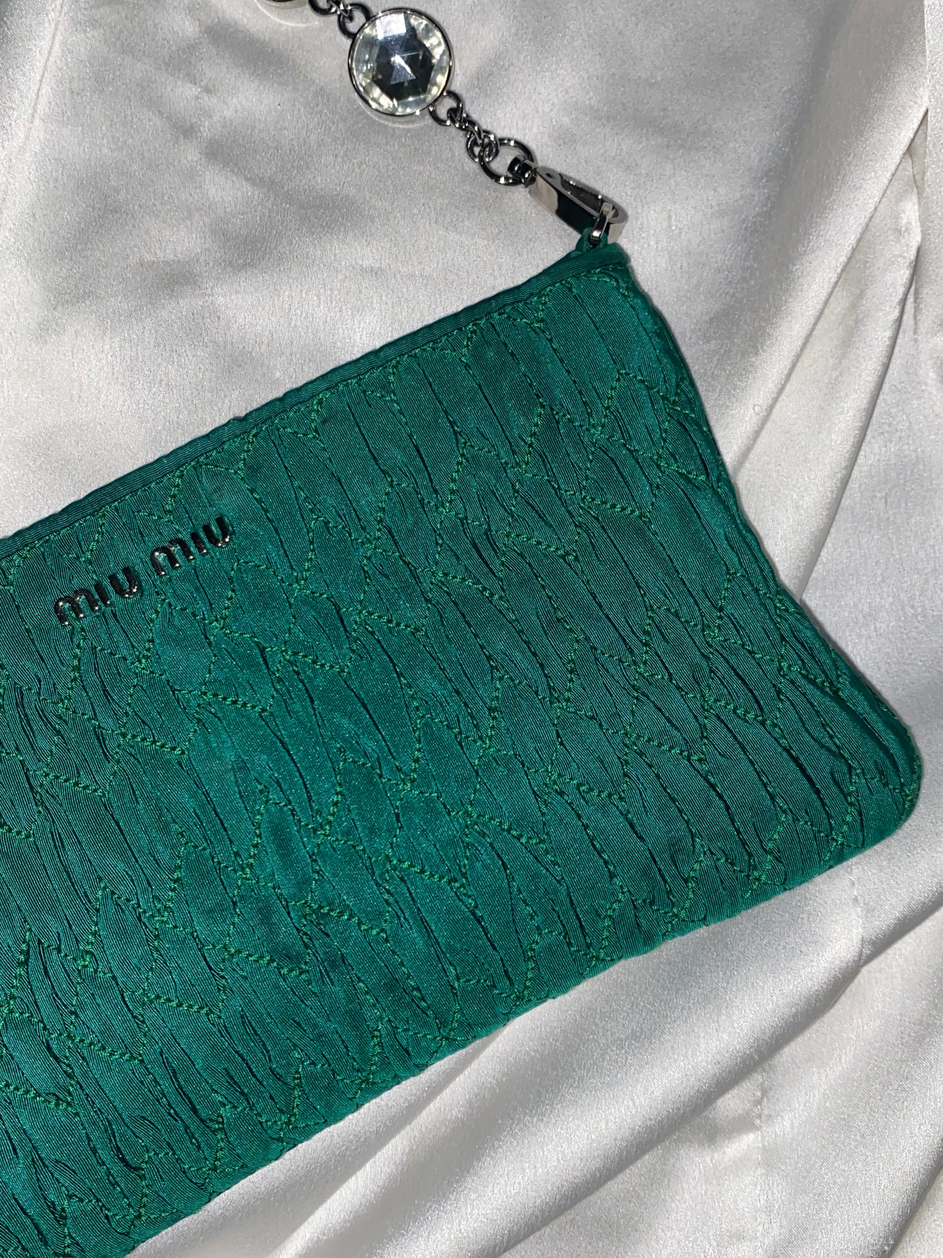 Meravigliosa miu miu verde con tracolla con cristalli. Qualche segno sul tessuto. Hardware brillante. Buonissime condizioni generali e completa di dustbag.