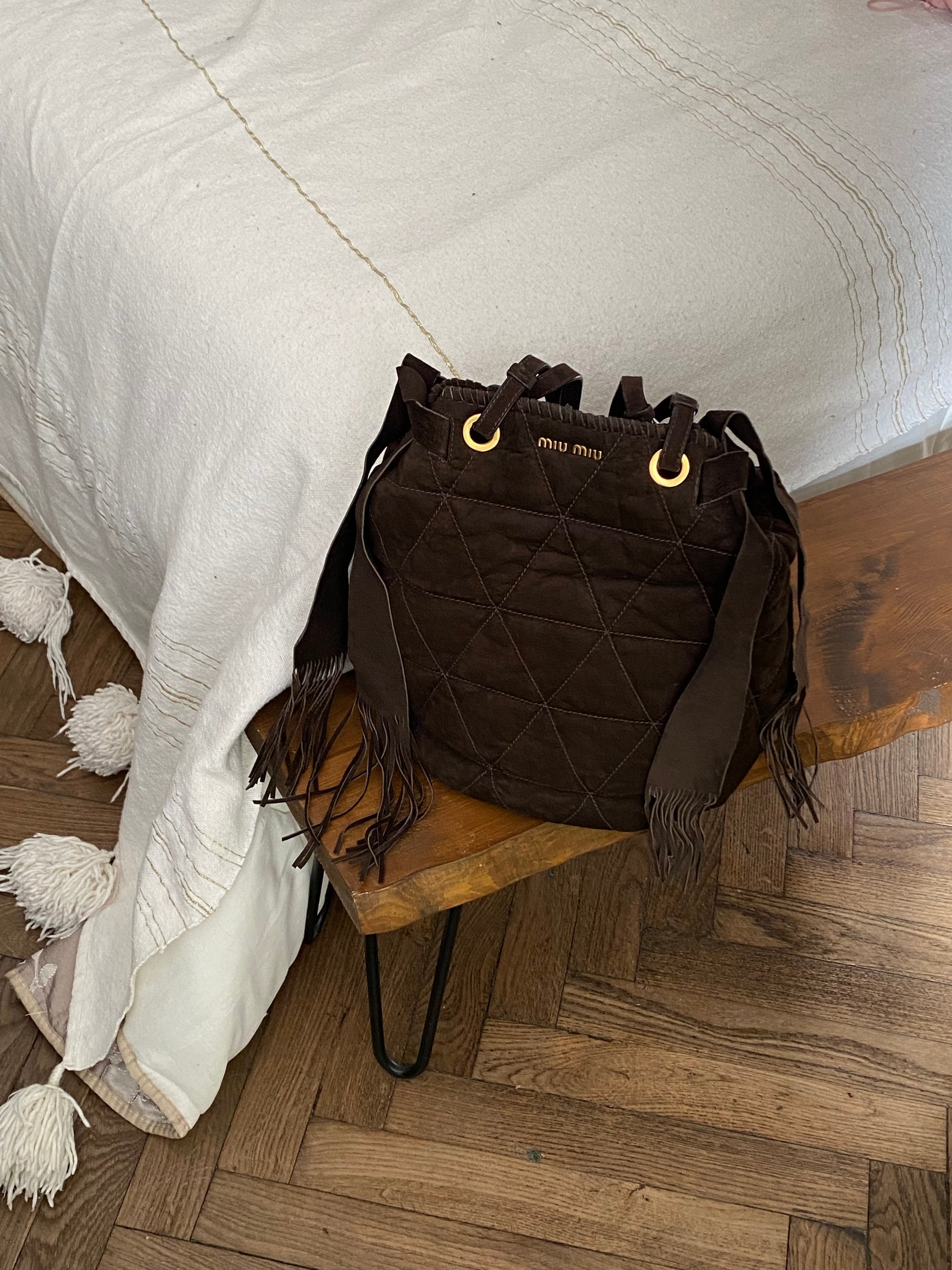 Pazzesca Miu Miu maxi bag in camoscio cioccolato 🍫 qualche lieve segno sul retro poco visibile, buonissime condizioni generali. Usata pochissimo e ancora con la sua dustbag e cartellino. Perfetta come borsa da lavoro, università o viaggio viste le dimensioni molto generose. Entra anche un MacBook Air 13 pollici.