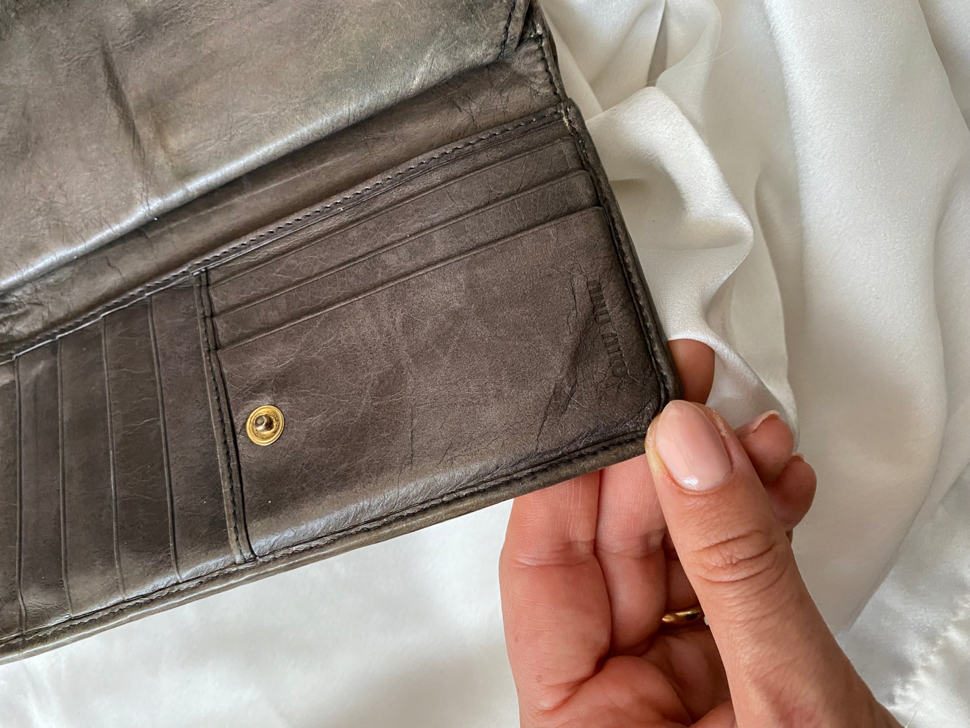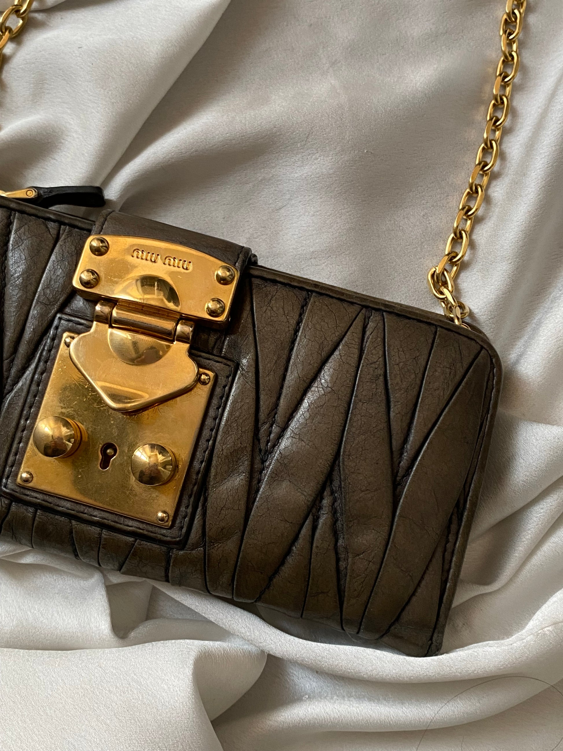 Pochette portafoglio Miu Miu antracite 3 in 1. Catena aggiunta: possibile portarla a spalla, a tracolla e come cintura.