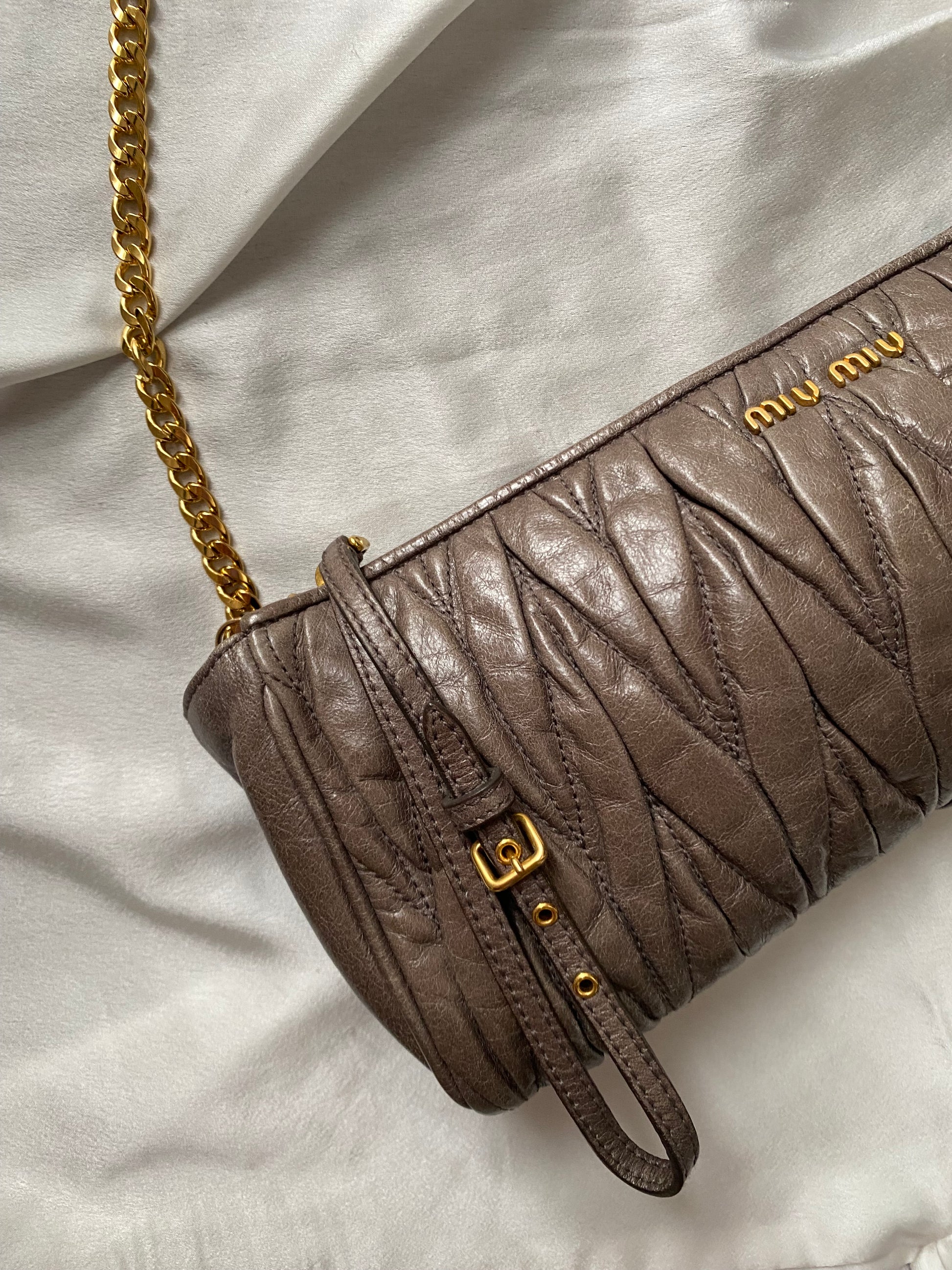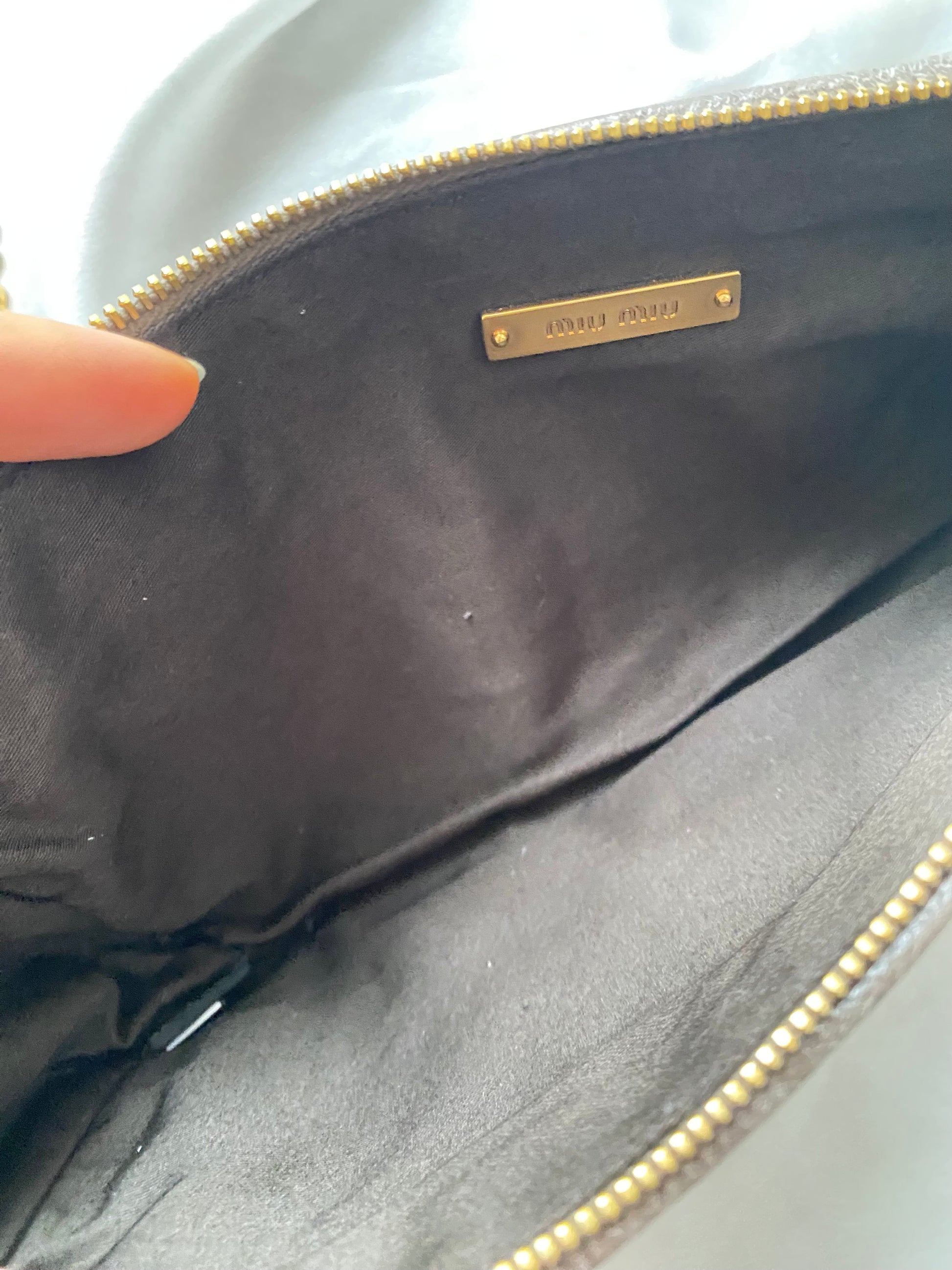 Pochette Miu Miu spettacolare in pregiatissima pelle semianilina antracite scuro. Qualche lievissimo segno, ottime condizioni, le venature della pelle sono meravigliose. Catena aggiunta. Si può portare a spalla.