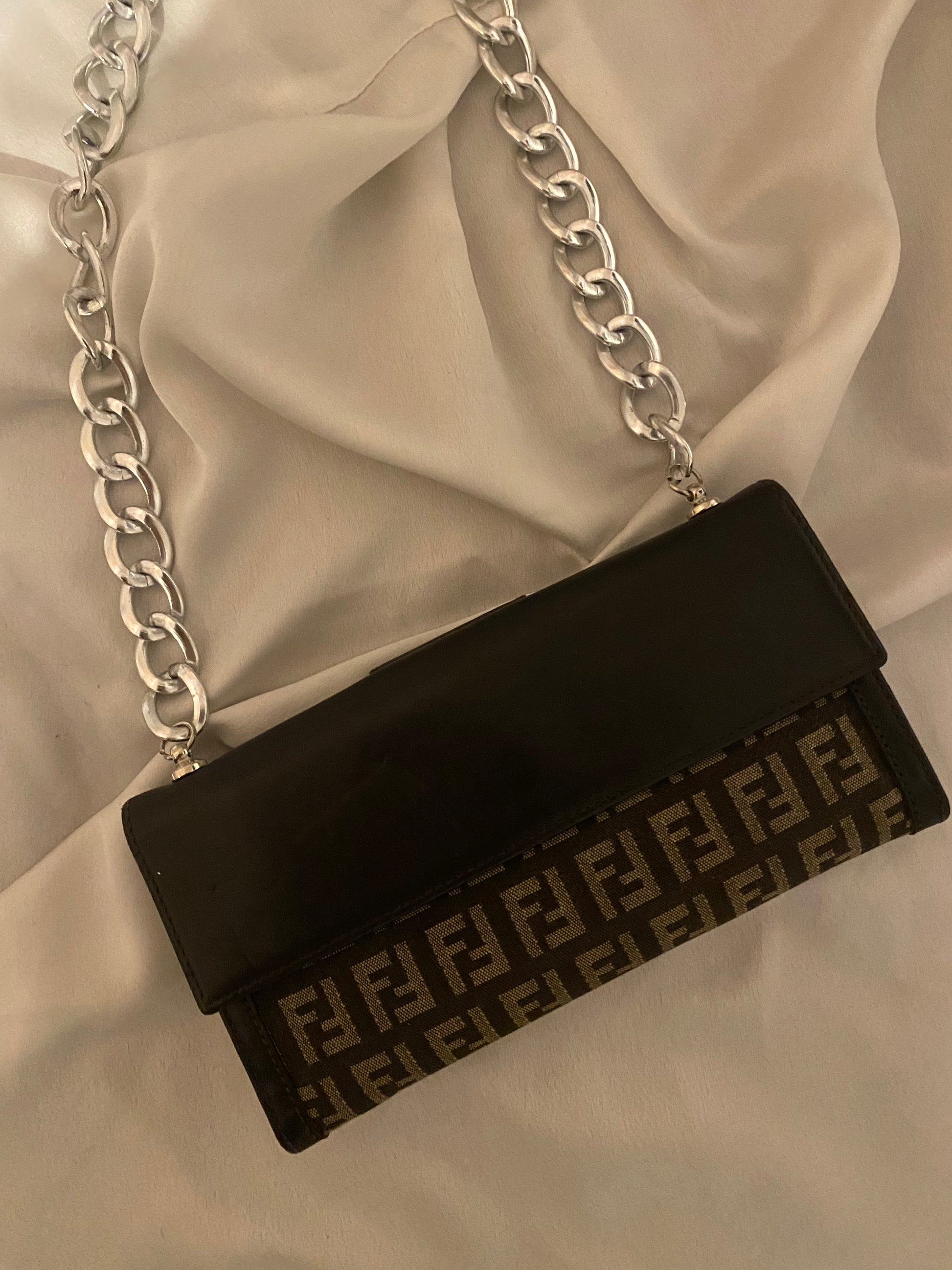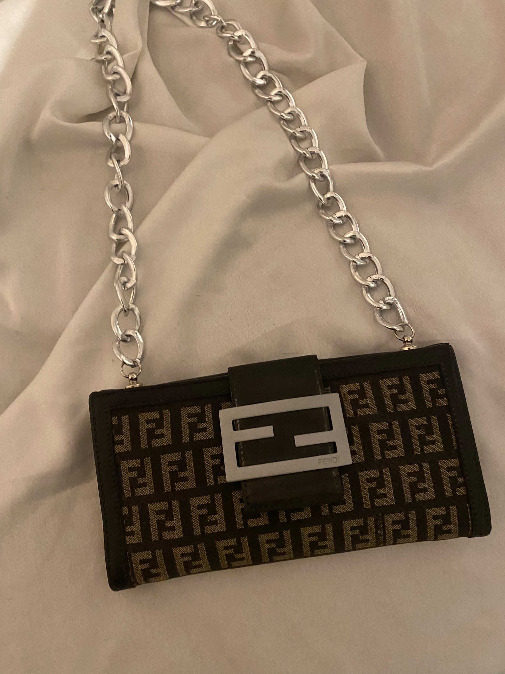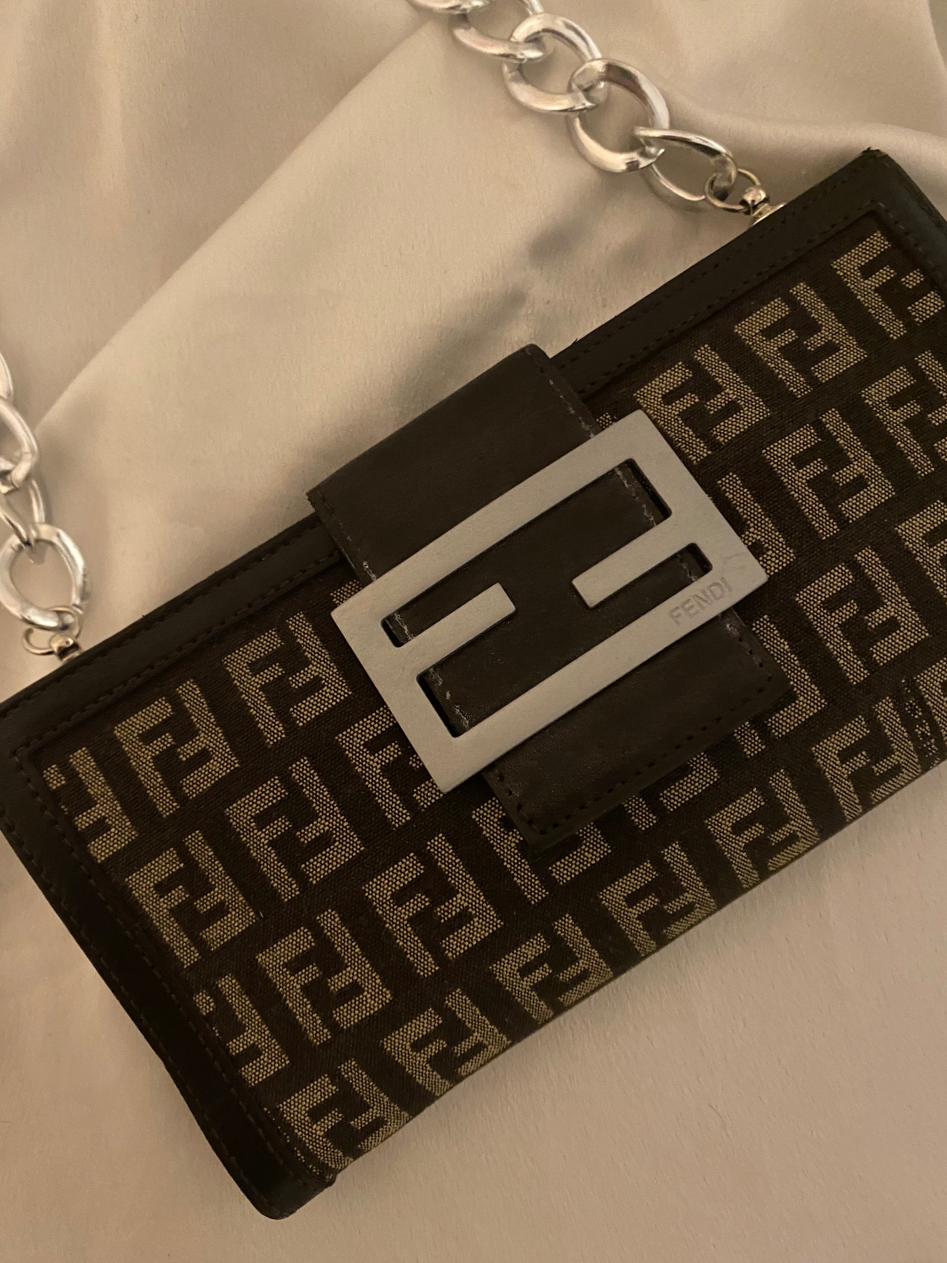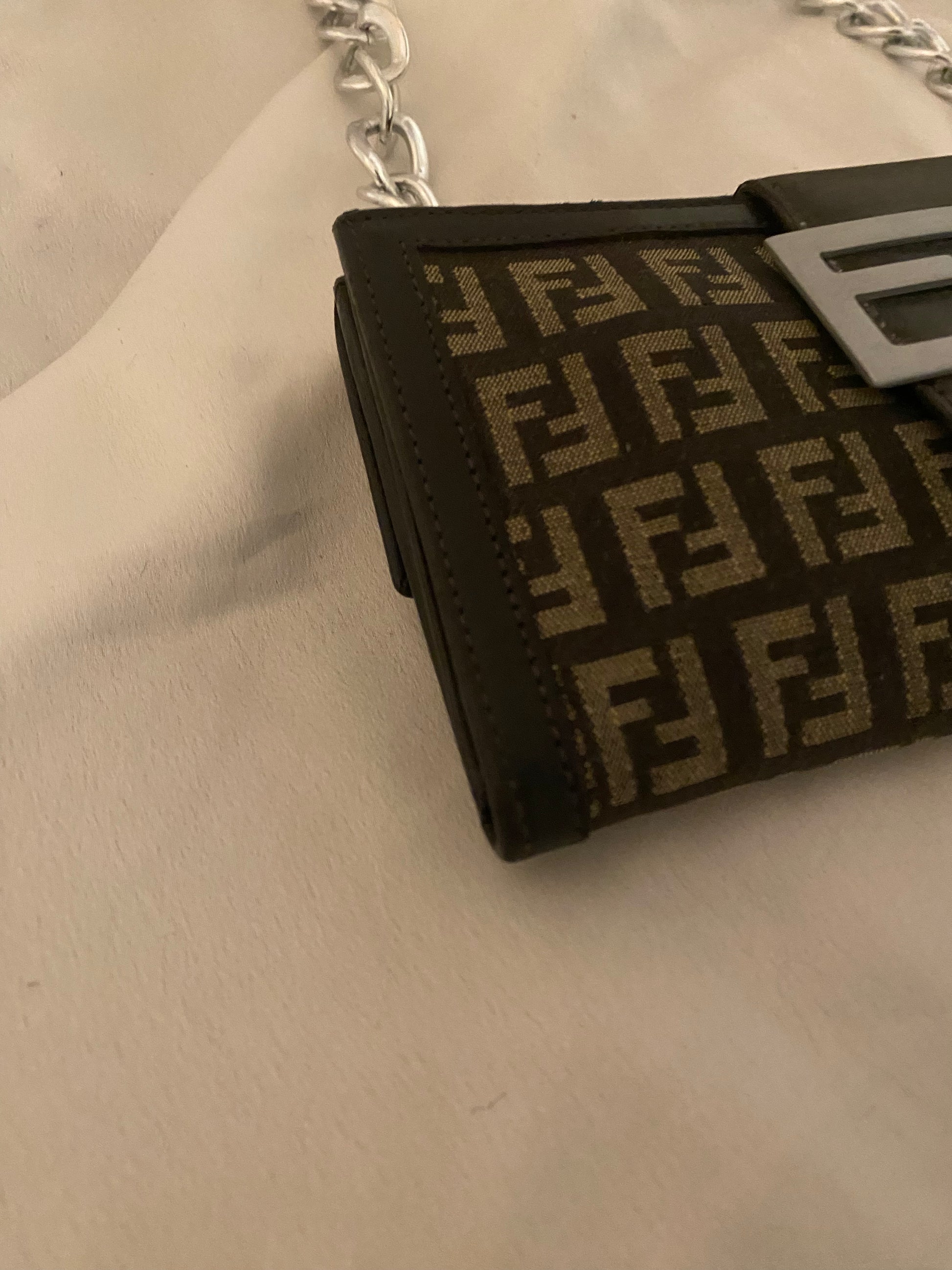 Classico monogram Fendi in tessuto. Segnalo leggero segno sulla pelle della tasca sul retro (visibile in foto), altrimenti perfetta. Catena aggiunta.