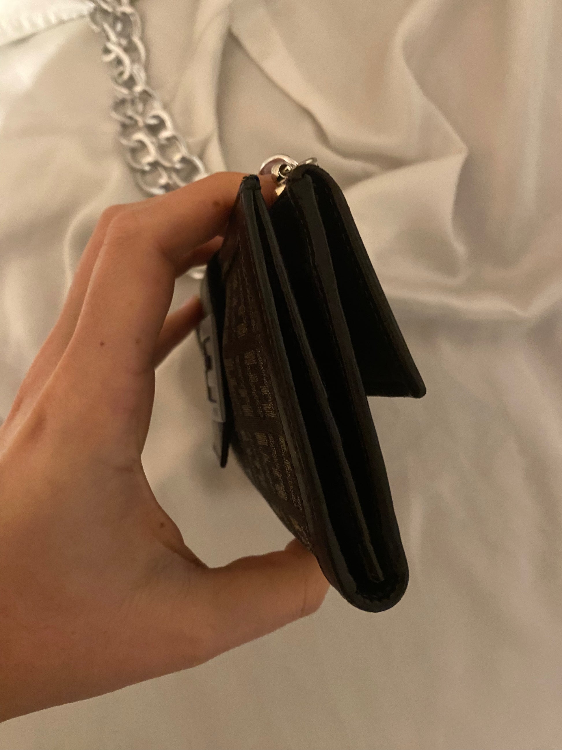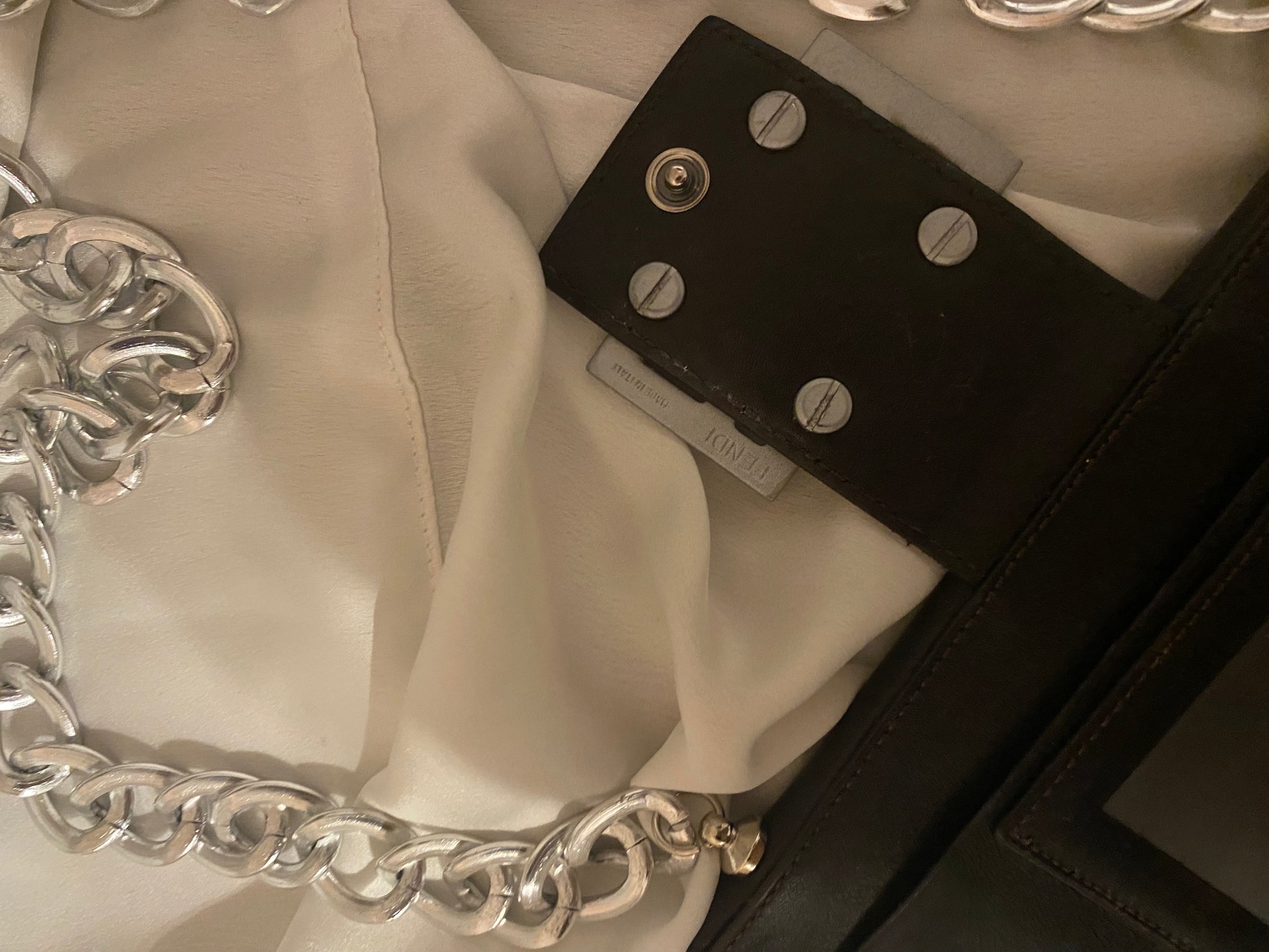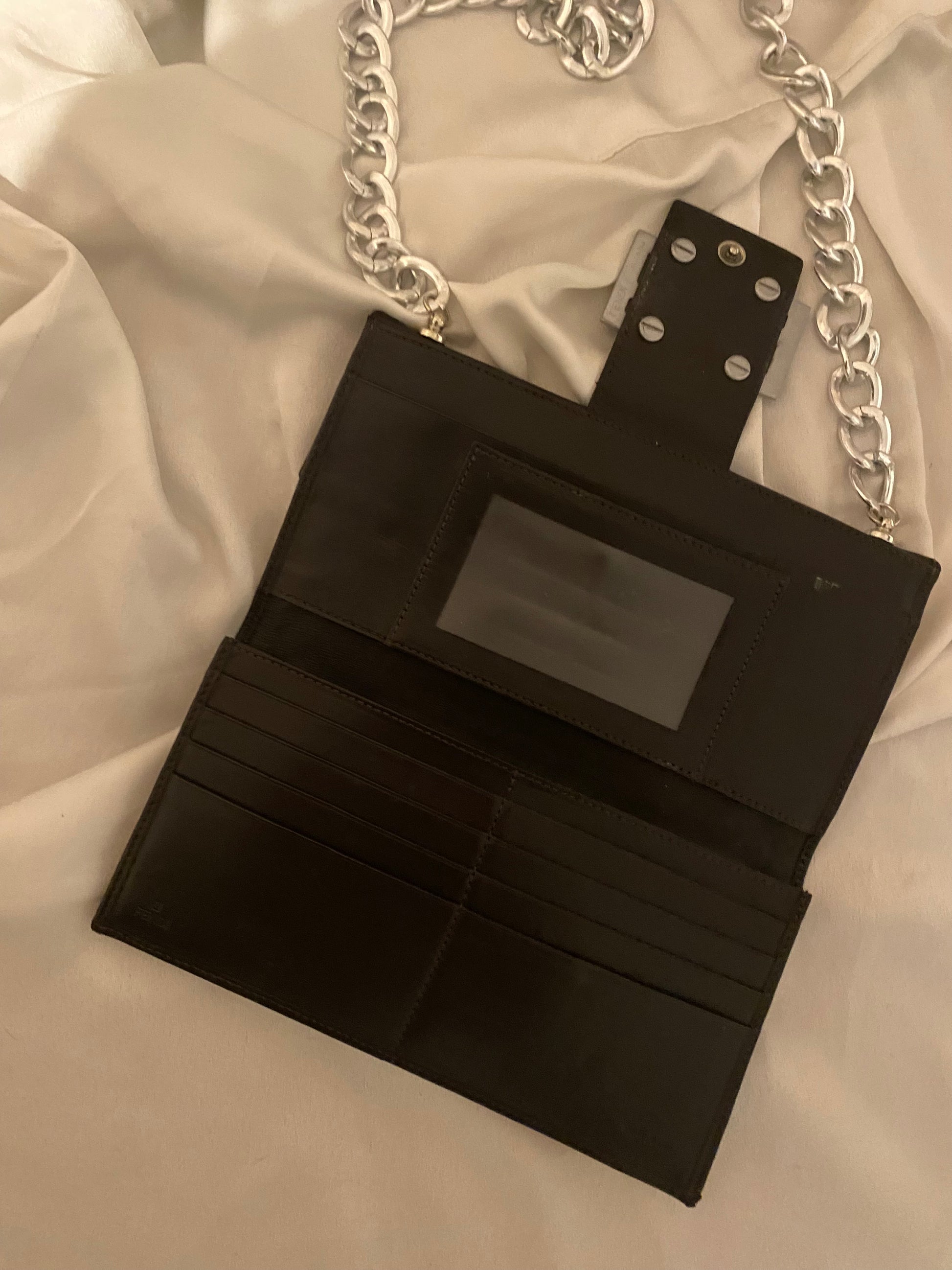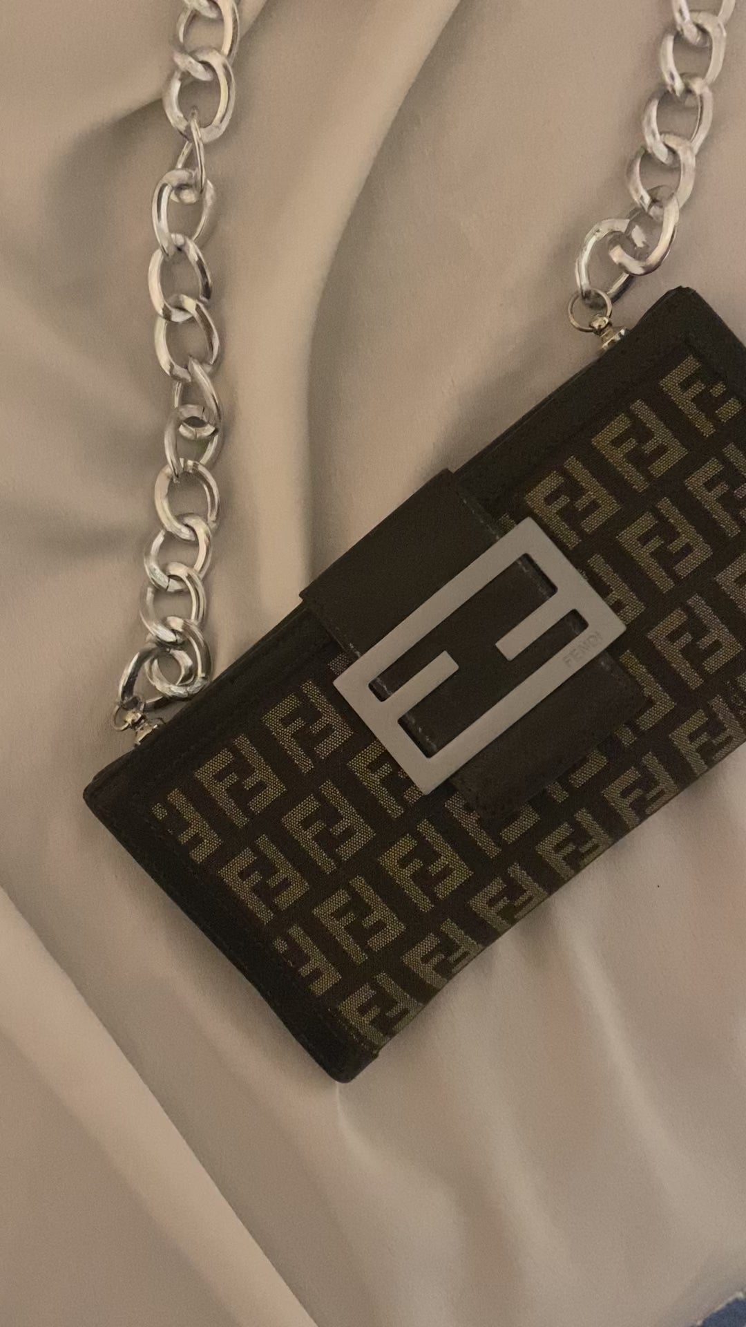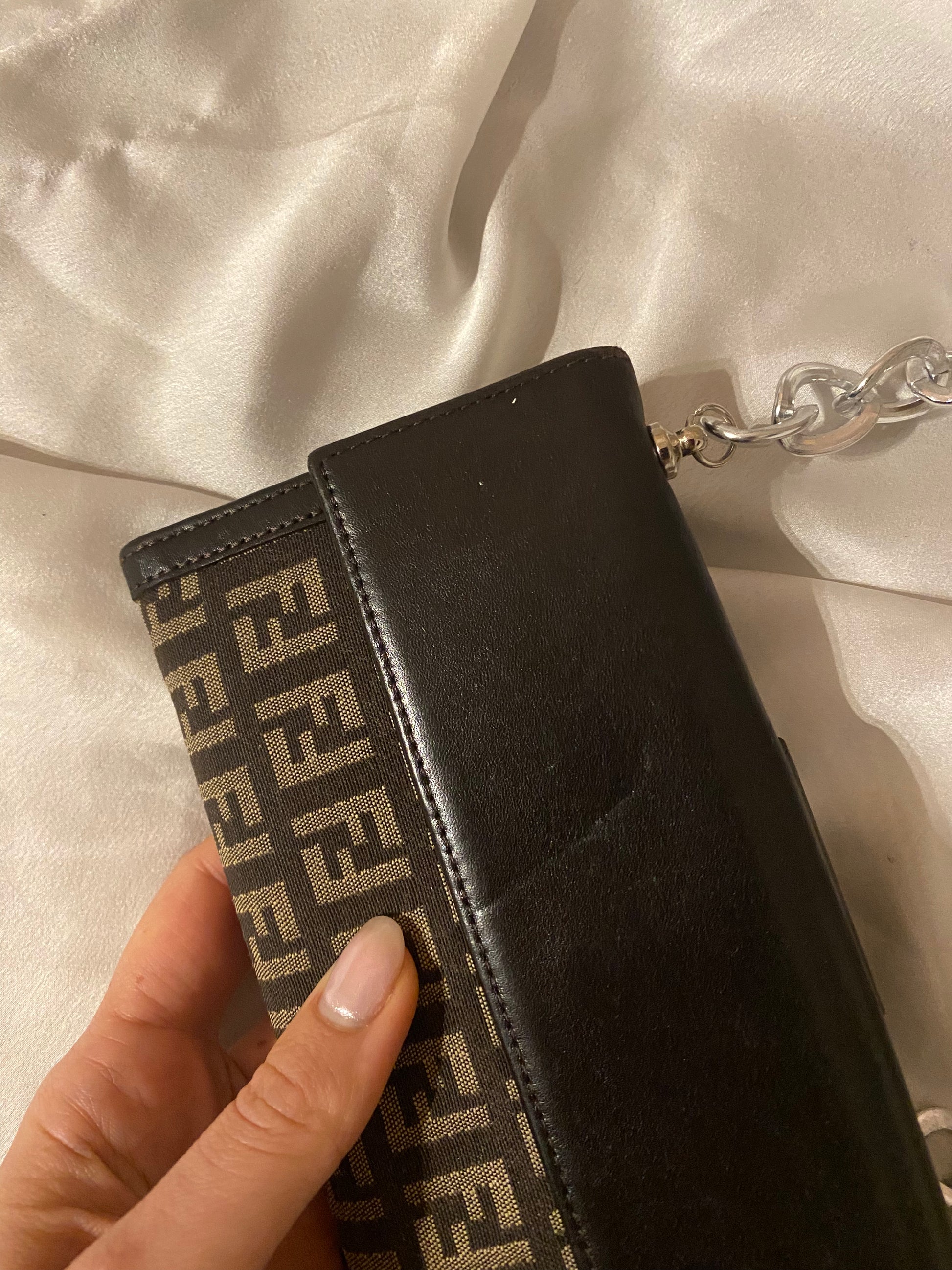 Classico monogram Fendi in tessuto. Segnalo leggero segno sulla pelle della tasca sul retro (visibile in foto), altrimenti perfetta. Catena aggiunta.