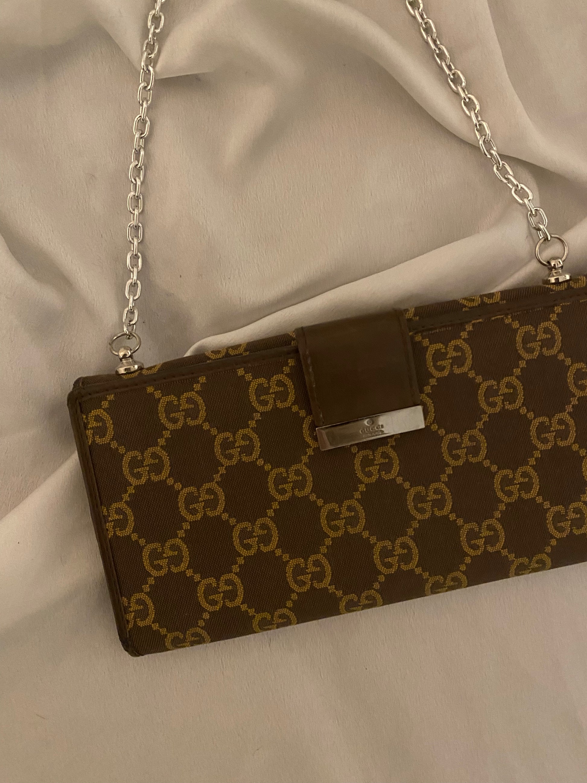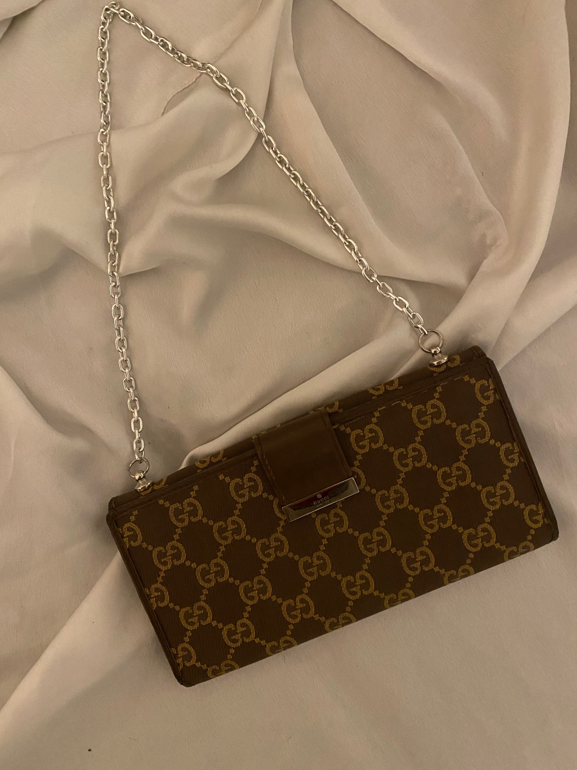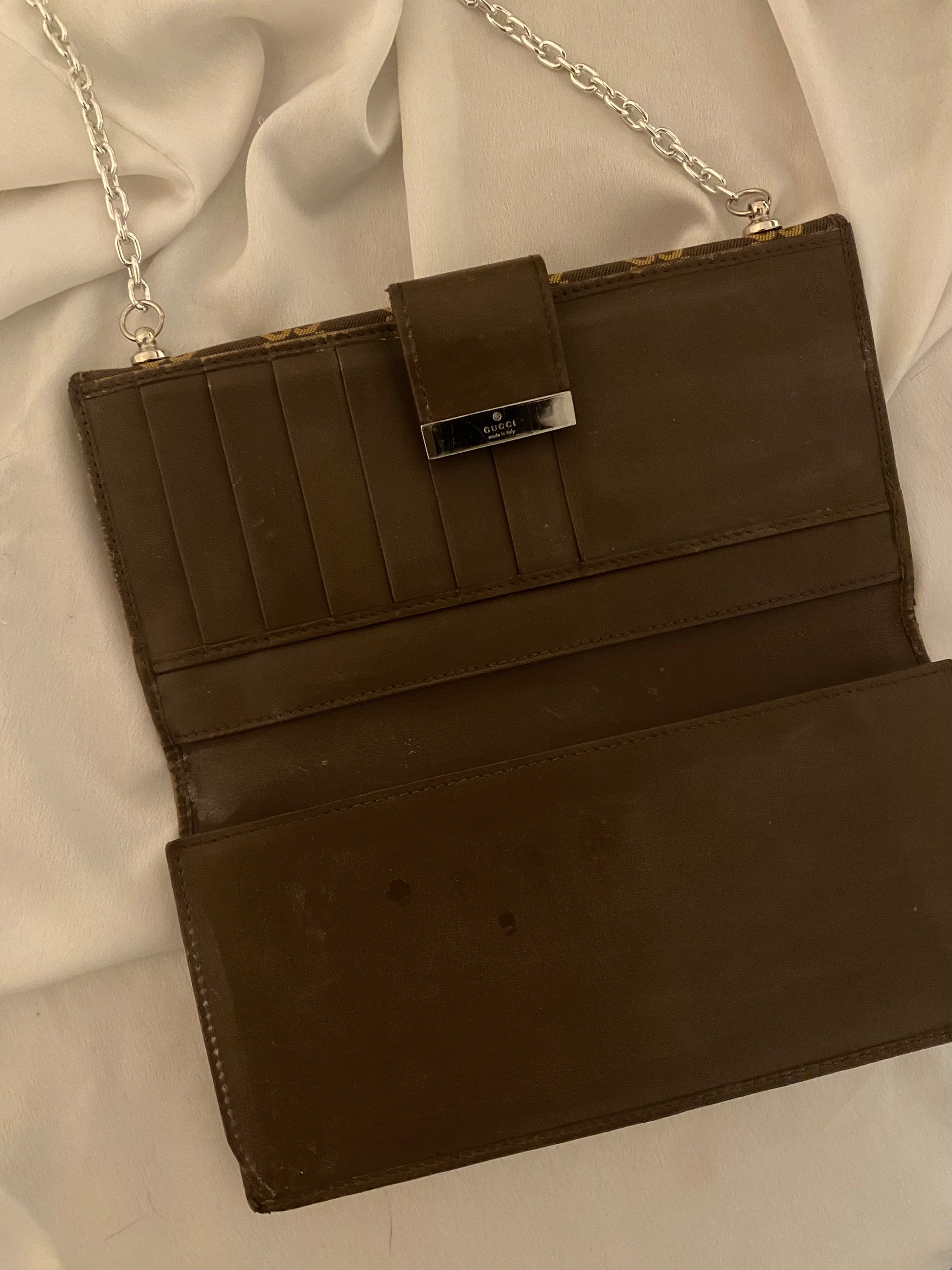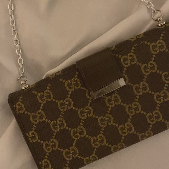pochette Gucci in classico monogram ma in splendido colore cioccolato e beige. Piccole imperfezioni sui bordi e alcuni segni sull’hardware e sulla pelle interna. Buonissime condizioni generali.