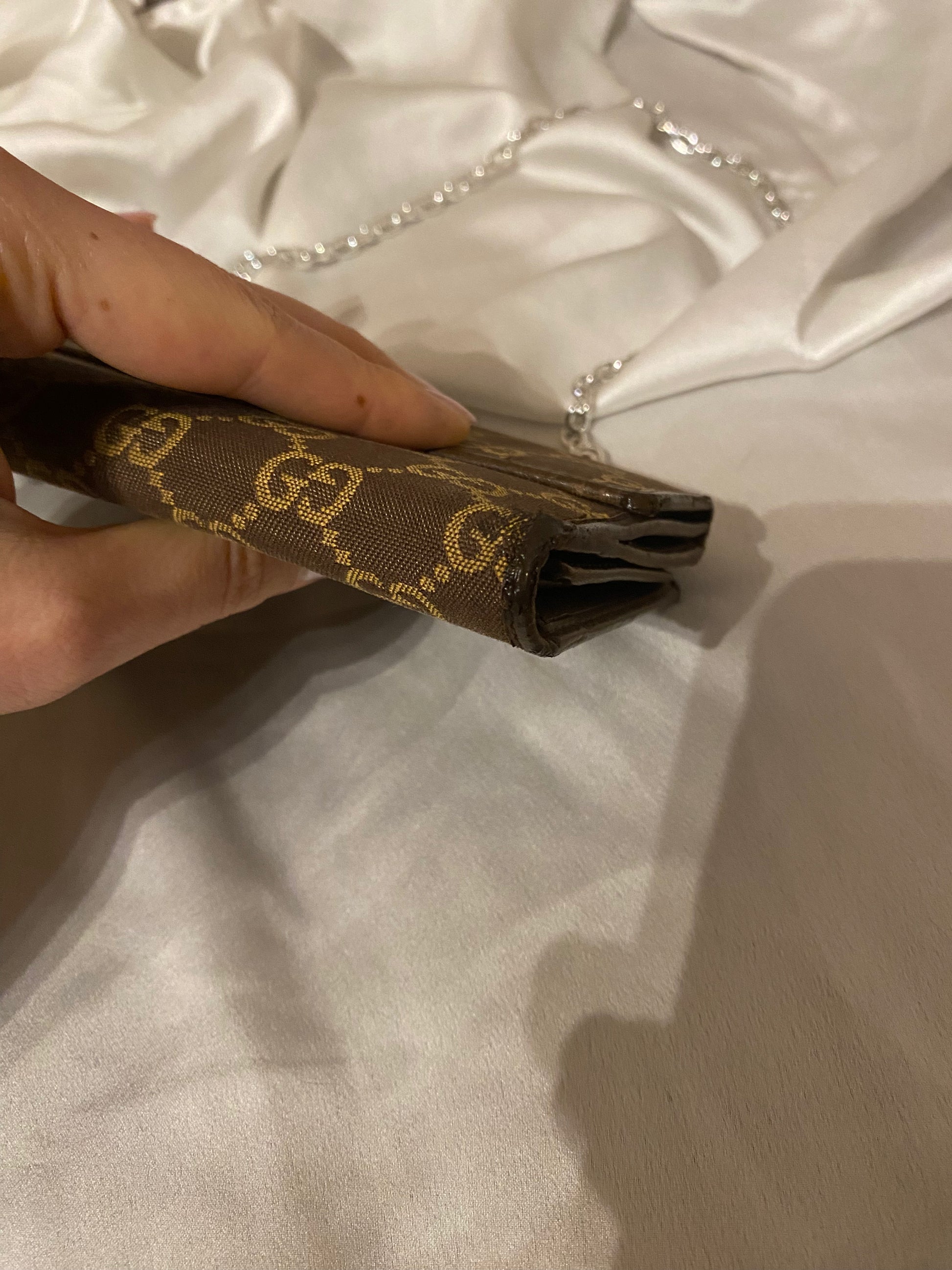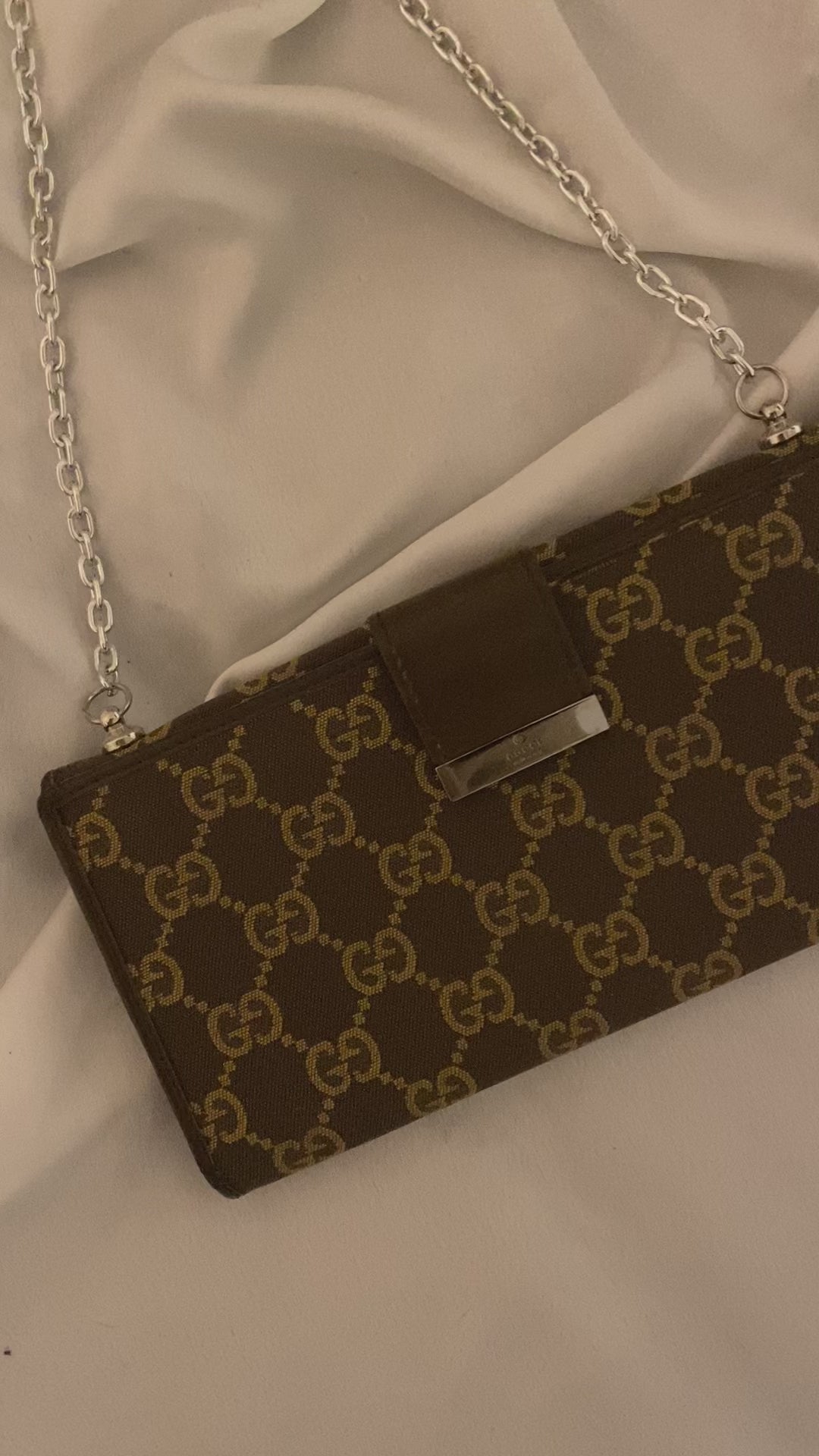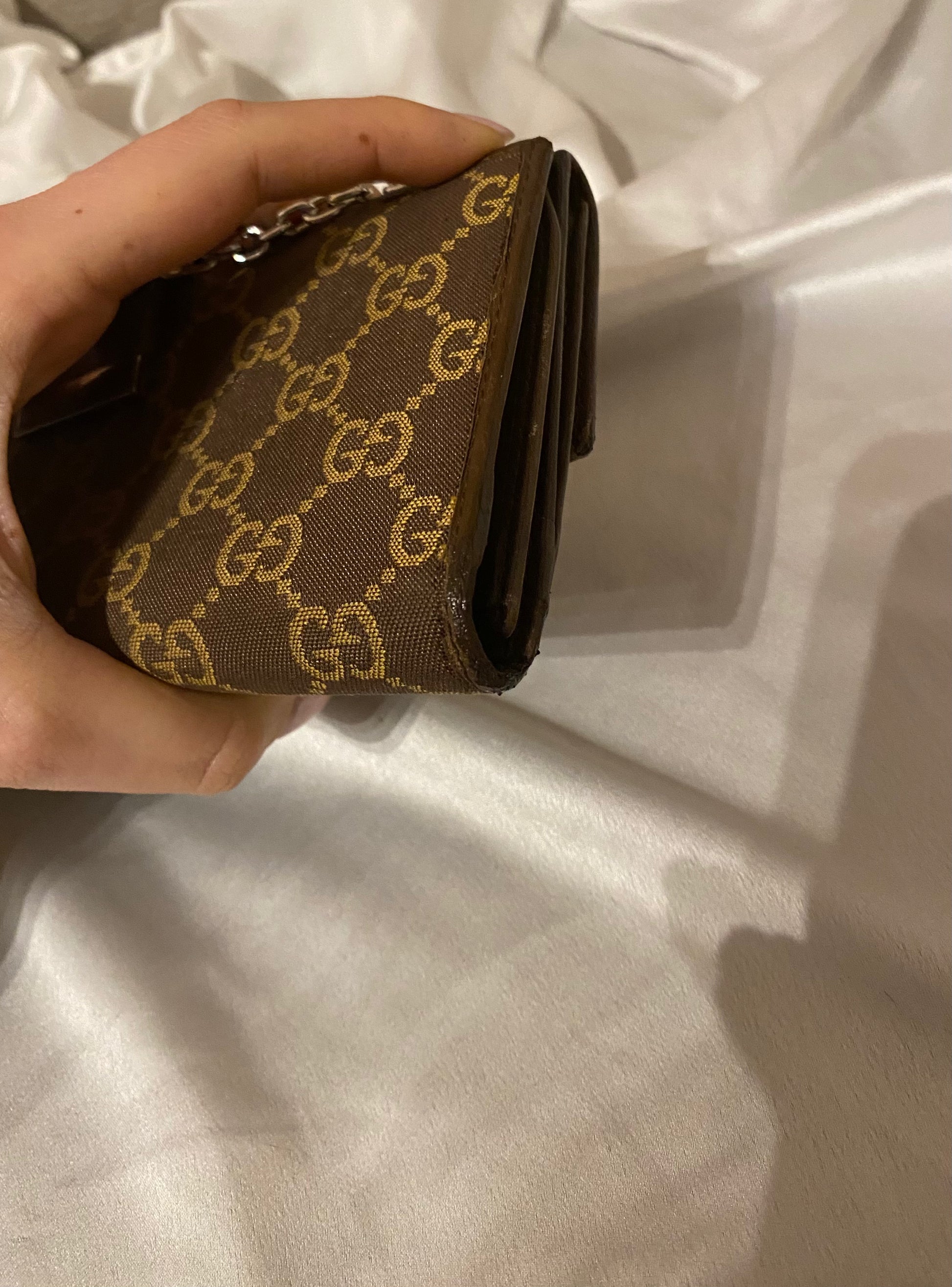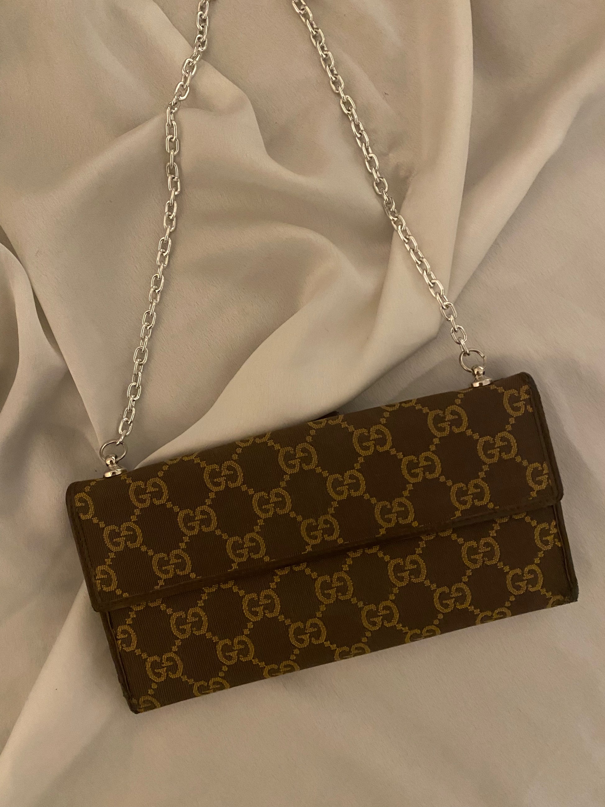 pochette Gucci in classico monogram ma in splendido colore cioccolato e beige. Piccole imperfezioni sui bordi e alcuni segni sull’hardware e sulla pelle interna. Buonissime condizioni generali.