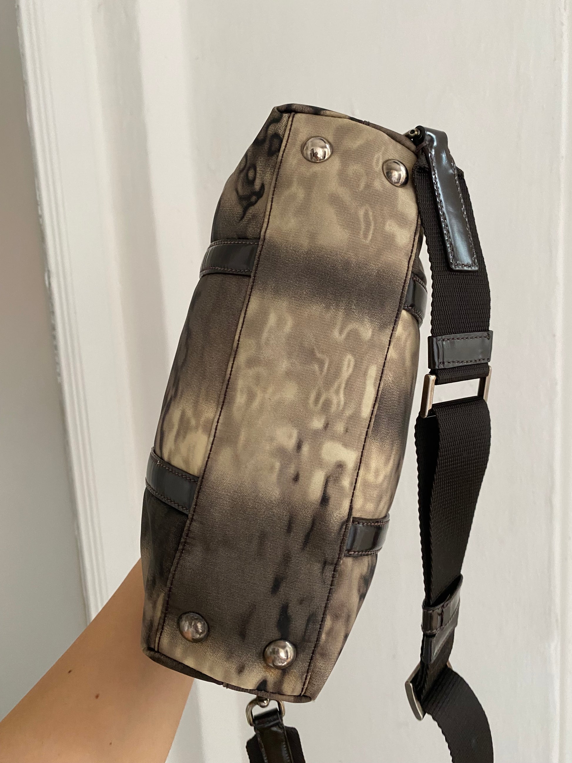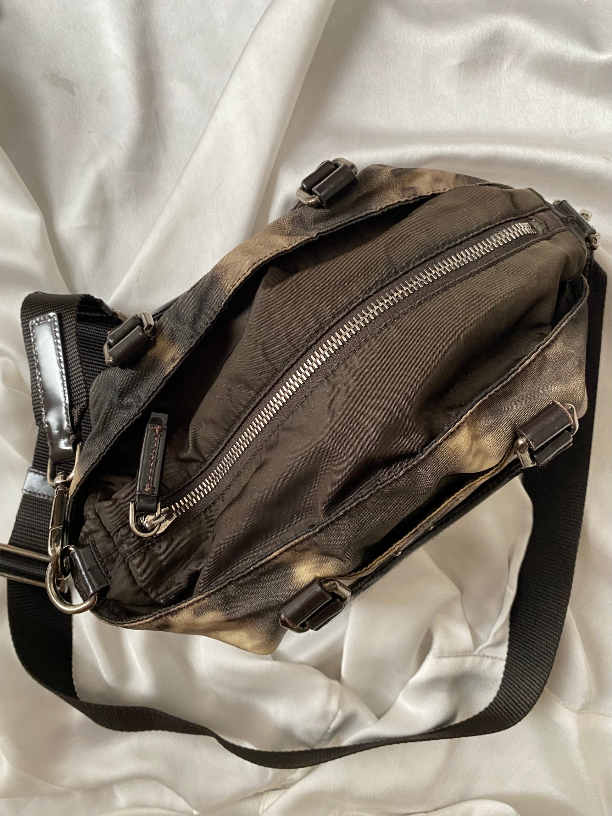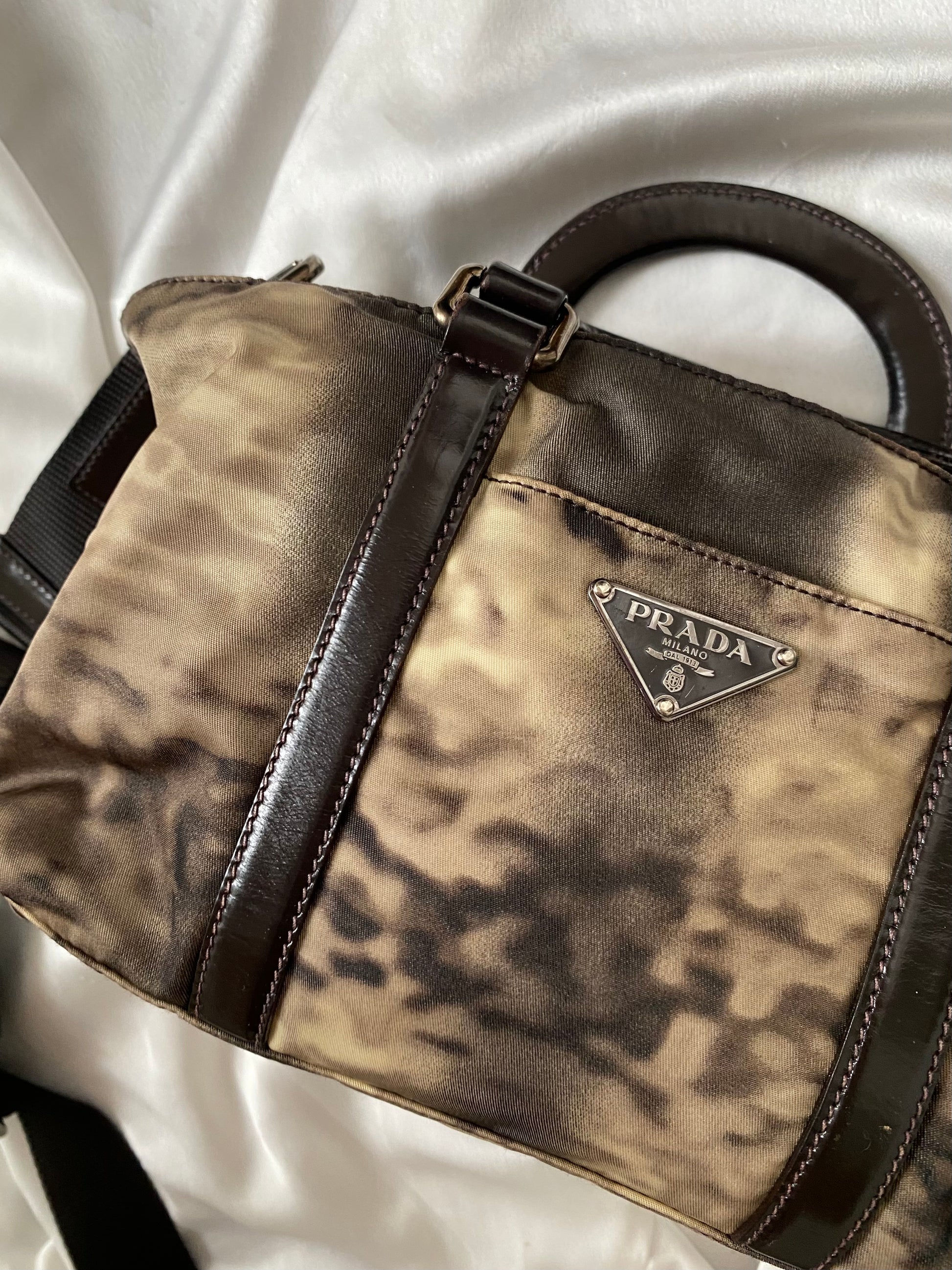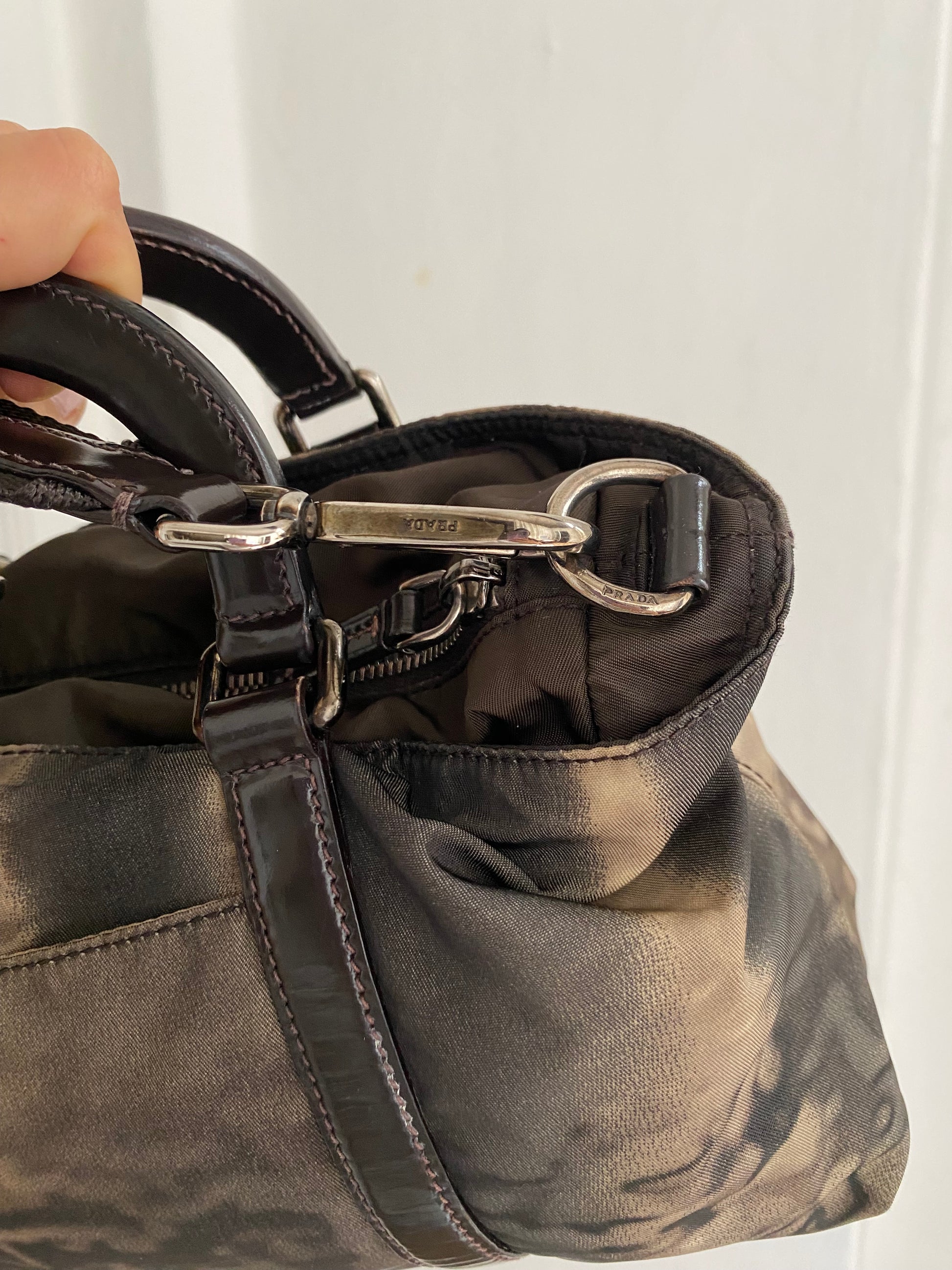 Stupenda prada in edizione limitata in pelle verniciata e nylon con stampa tie-dye. Dimensioni contenute ma super capiente: si porta a mano o a tracolla.