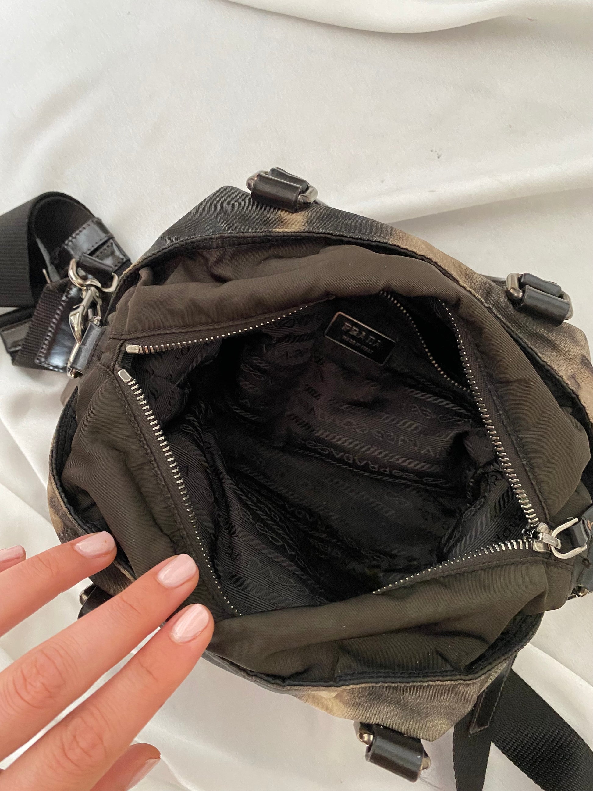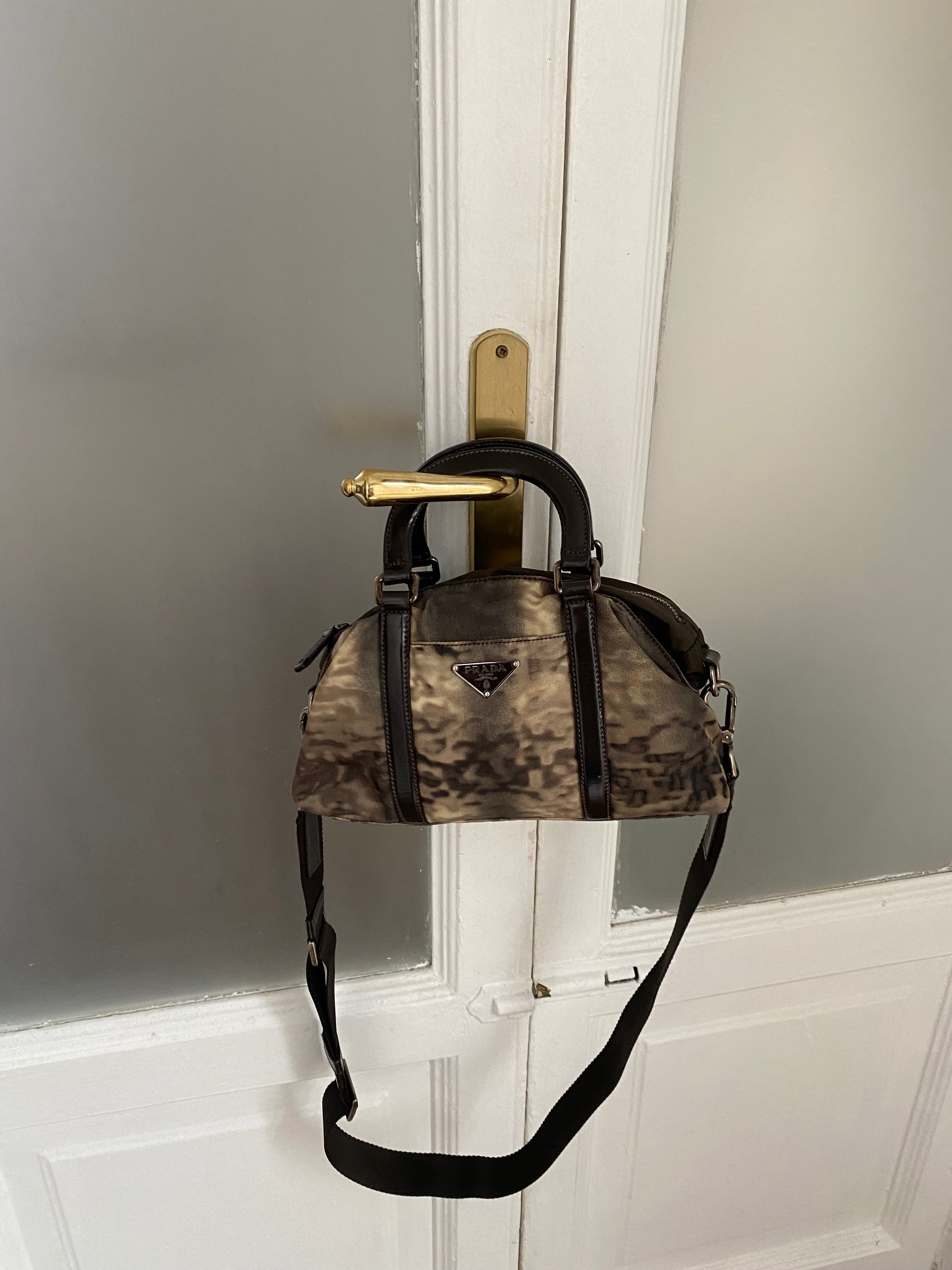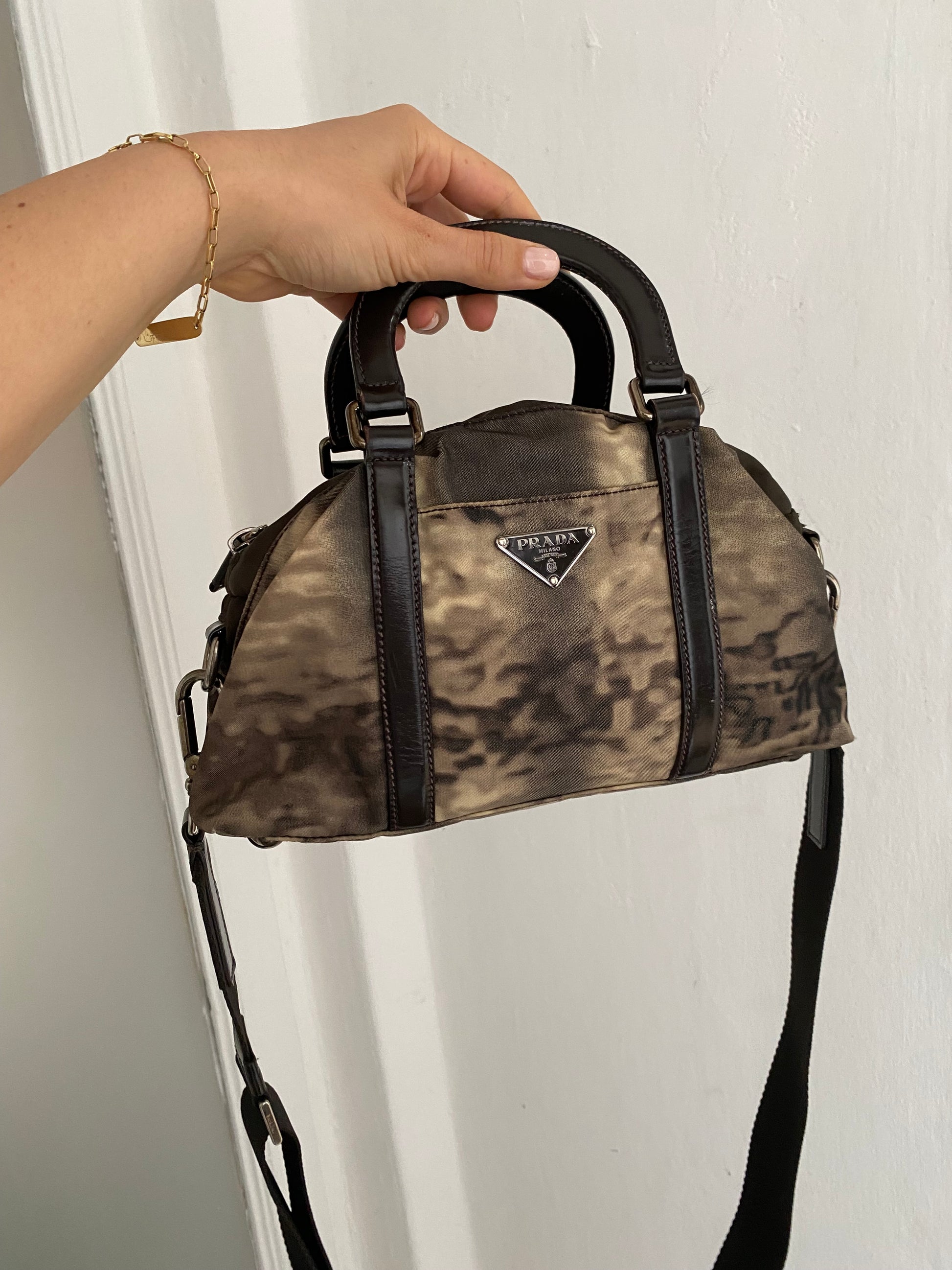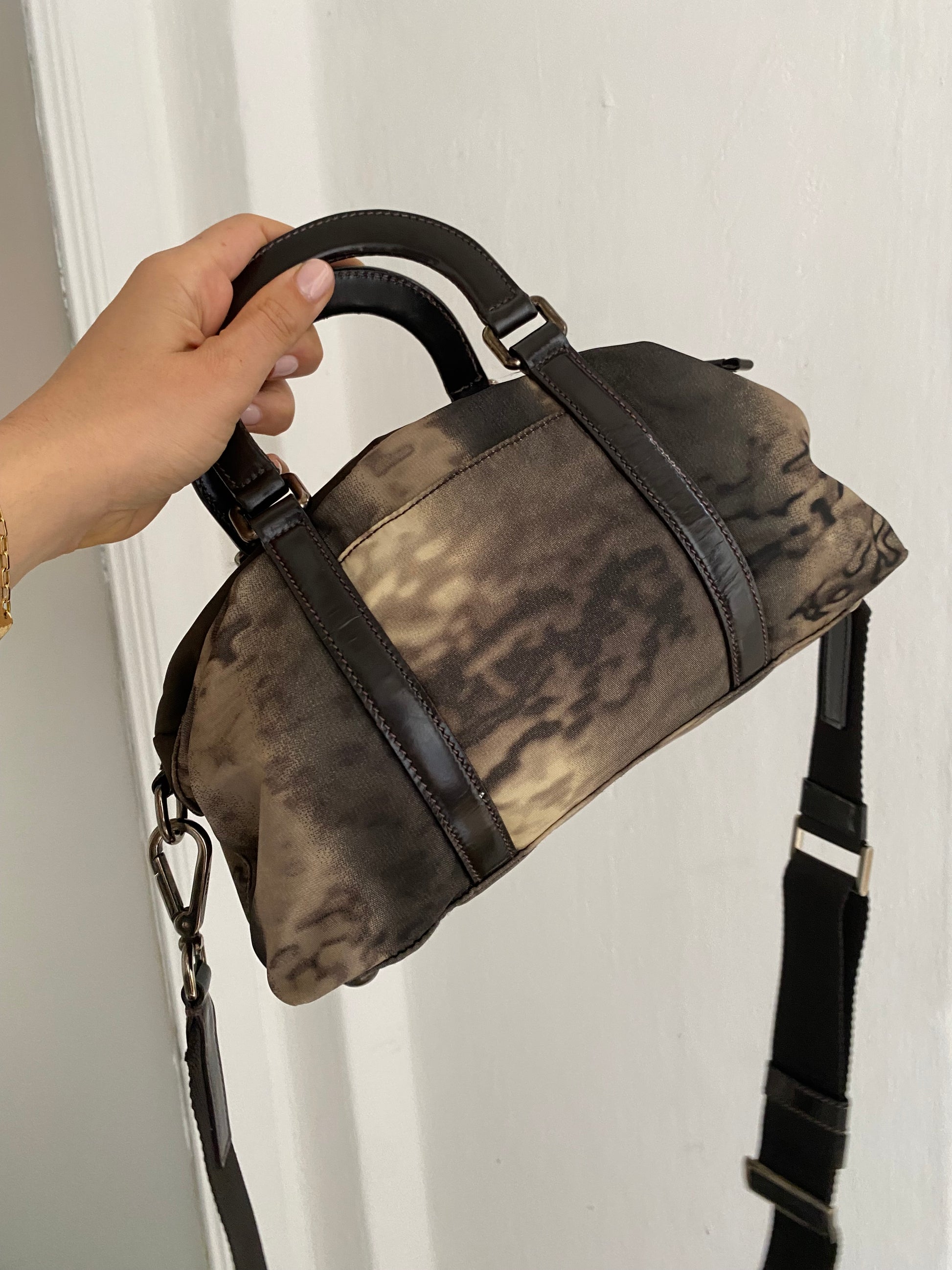 Stupenda prada in edizione limitata in pelle verniciata e nylon con stampa tie-dye. Dimensioni contenute ma super capiente: si porta a mano o a tracolla.
