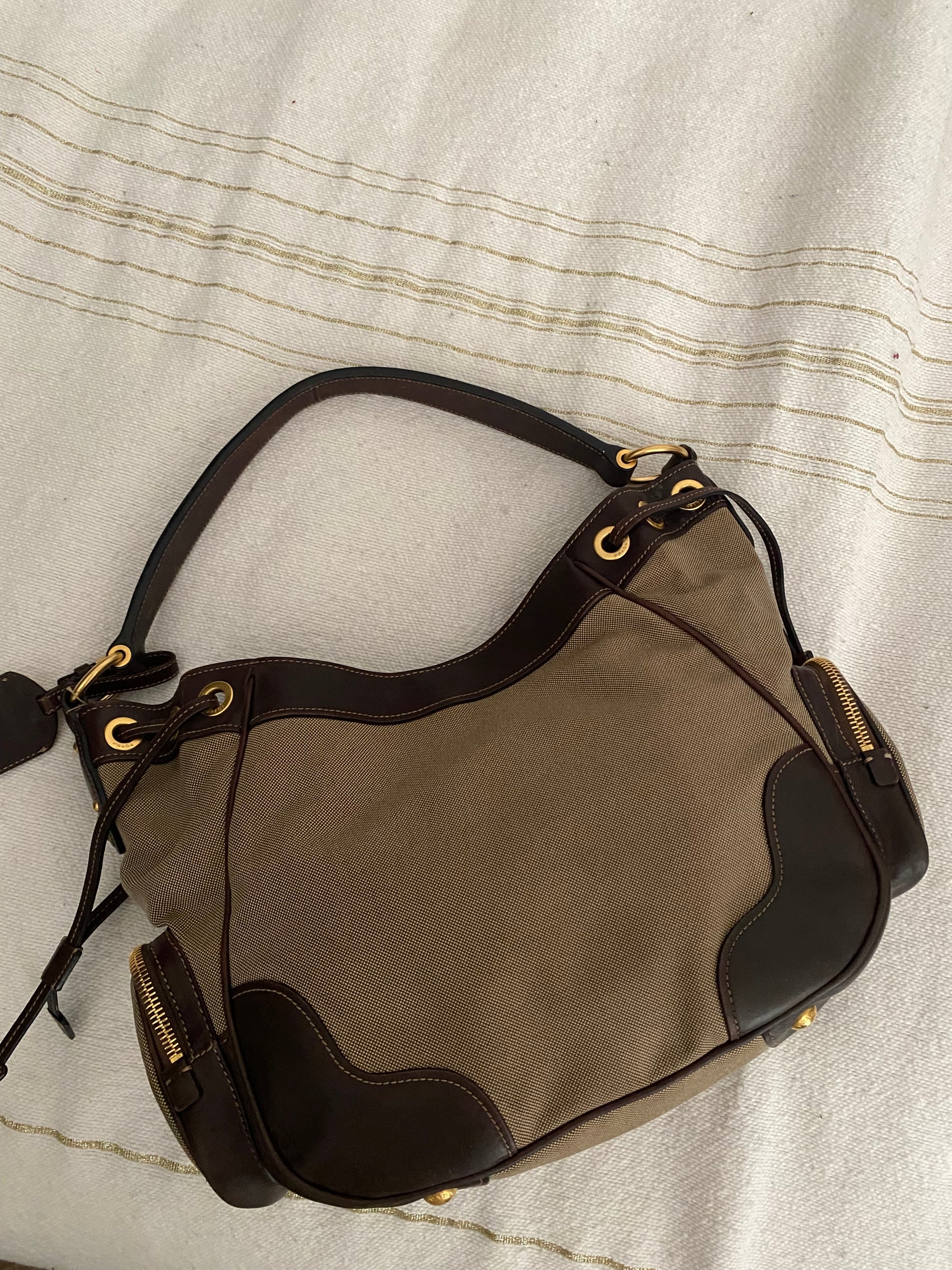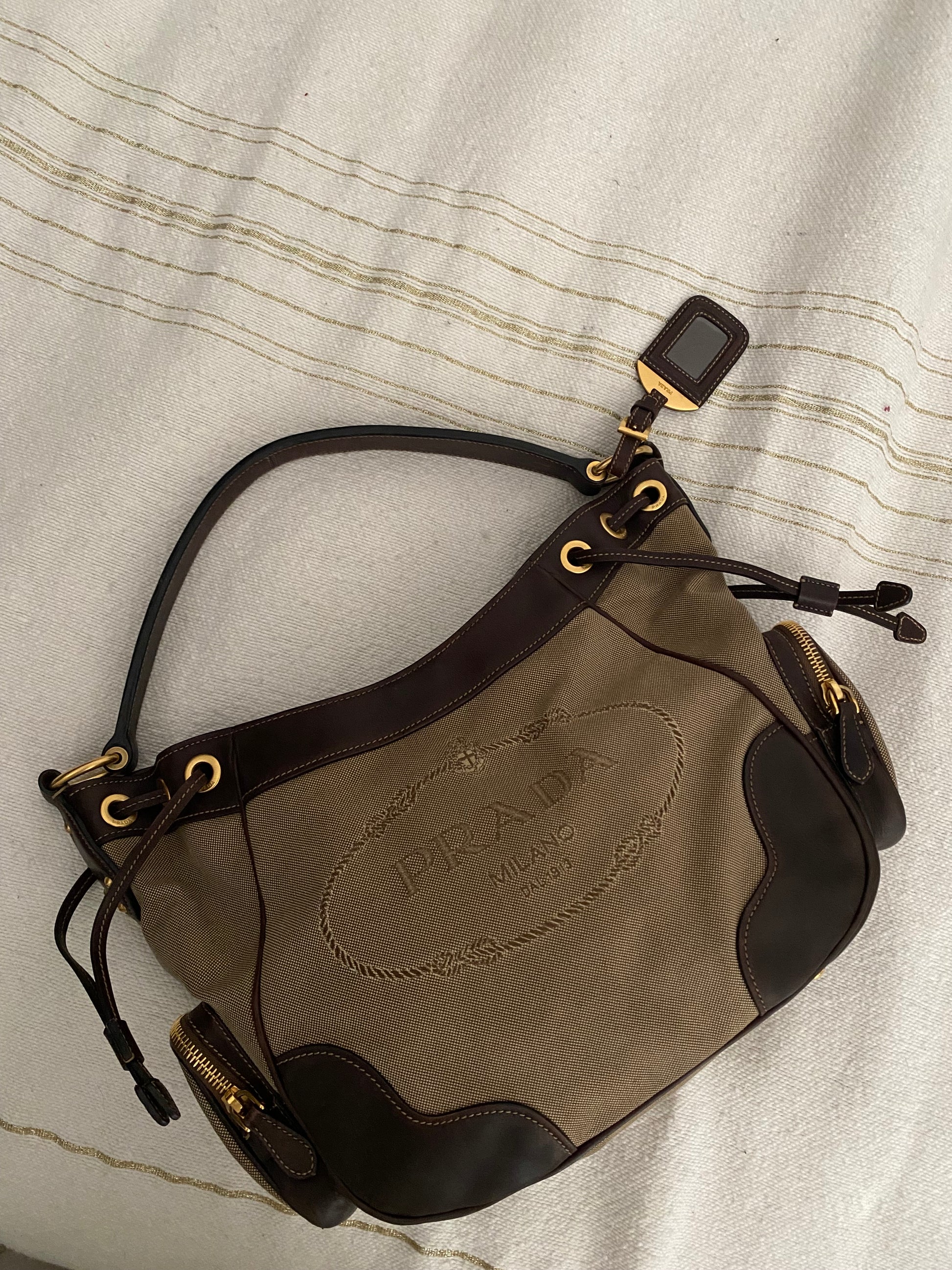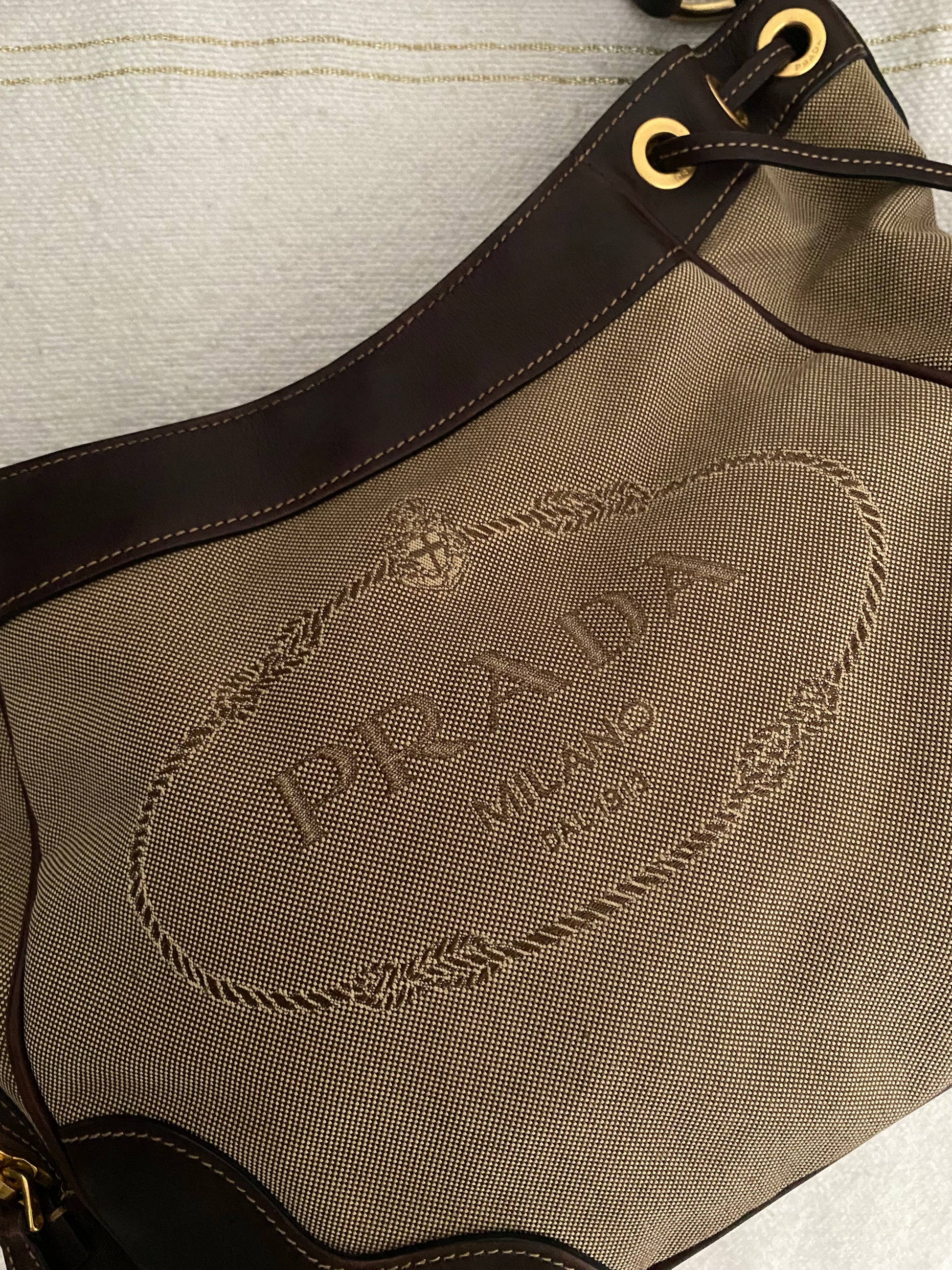 Pazzesca Prada in jacquard e pelle con due tasche laterali che la rendono davvero unica. Molto capiente. Logo centrale. Micro segni sulla tasca destra (foto) molto poco visibili, ottime condizioni generali.