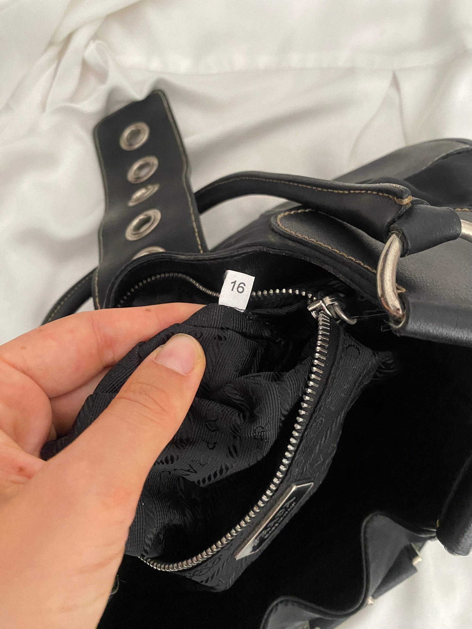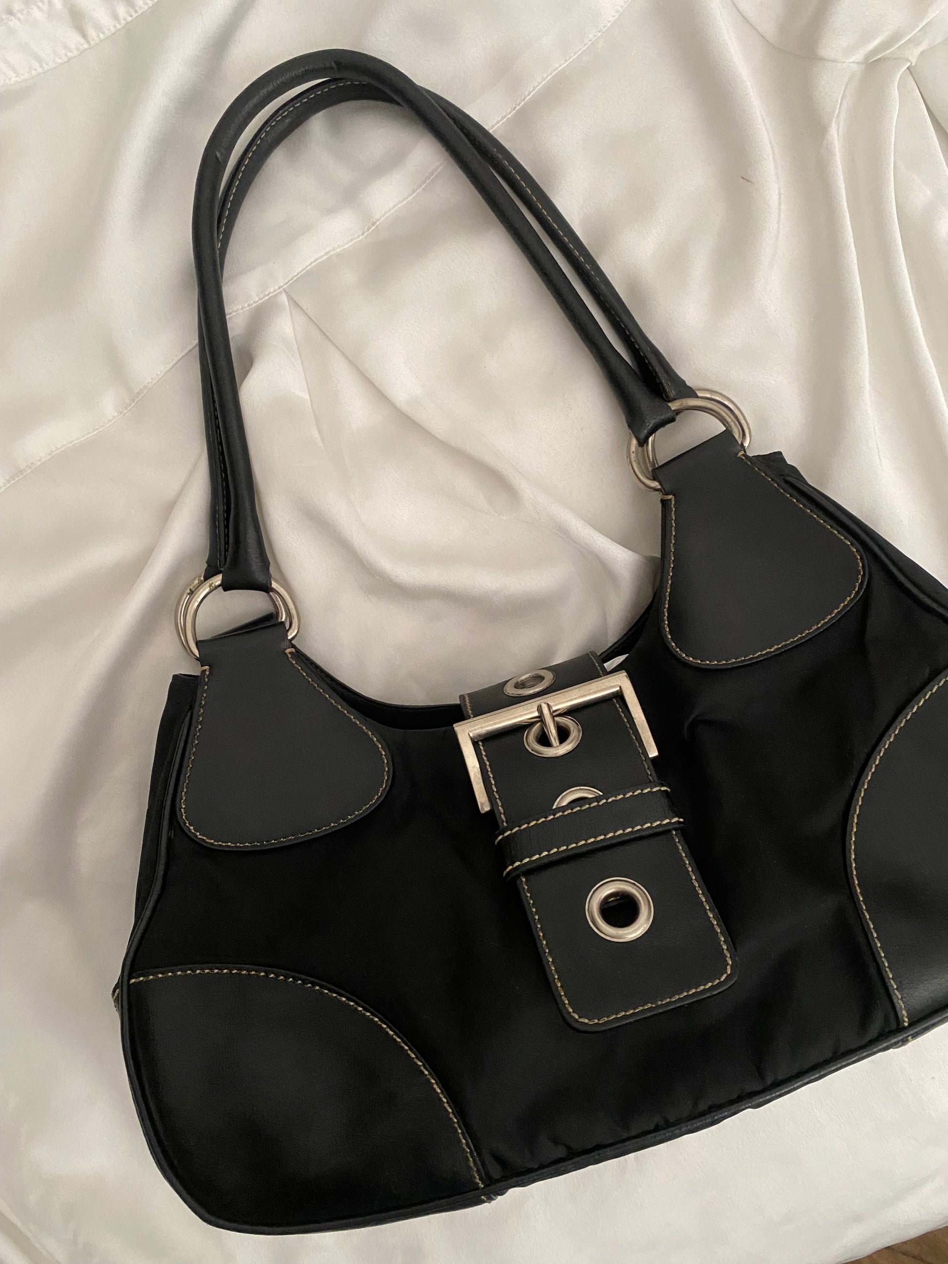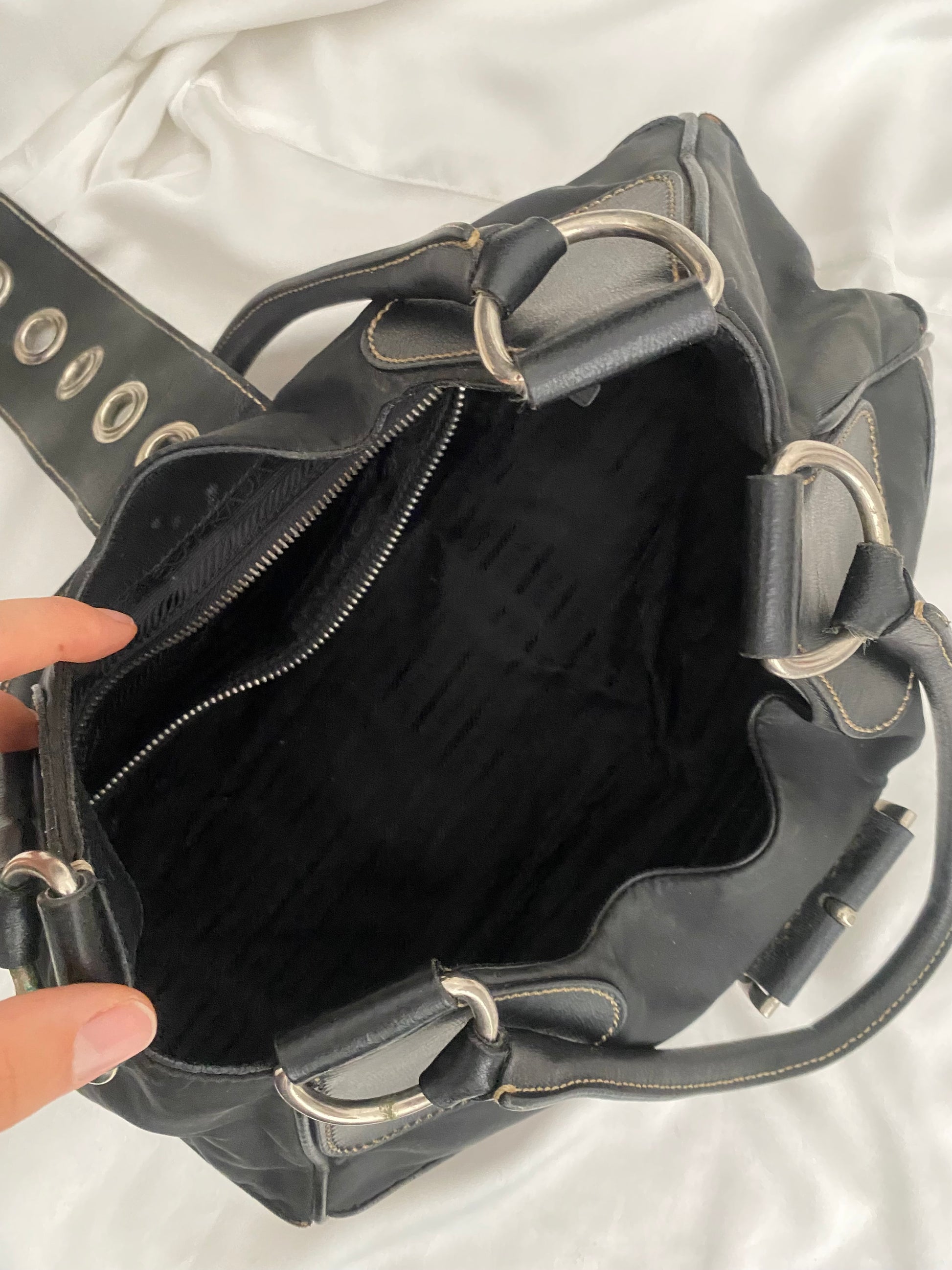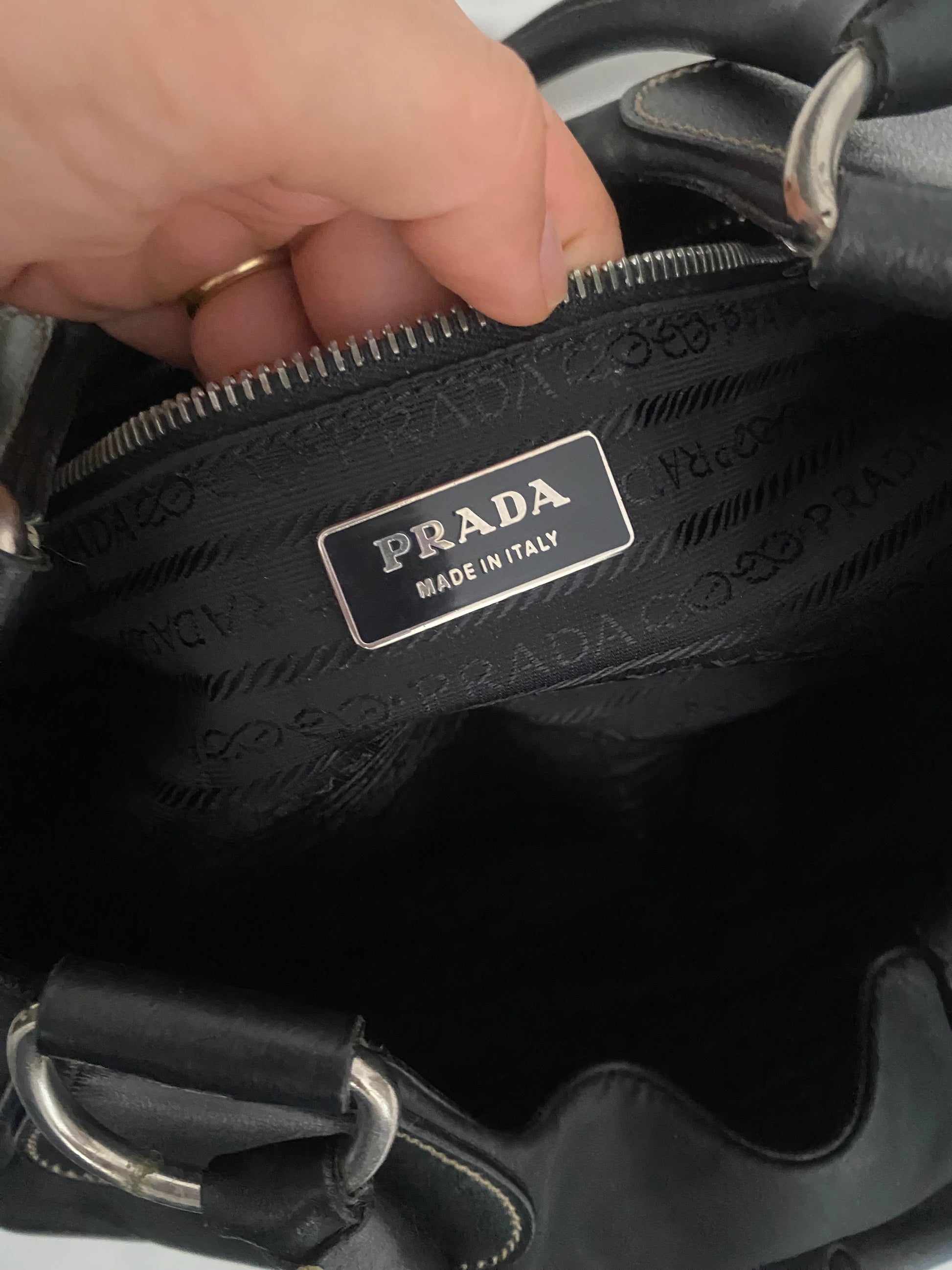 Bellissima Prada Moon in nylon con profili in pelle (proprio il modello che ha ispirato la Prada moon più recente). Iconica. Qualche ruga sulla pelle visibile solo in controluce. Buonissime condizioni generali. Angoli immacolati. Hardware argento e placca prada sul lato. Venduta con i suoi cartellini.