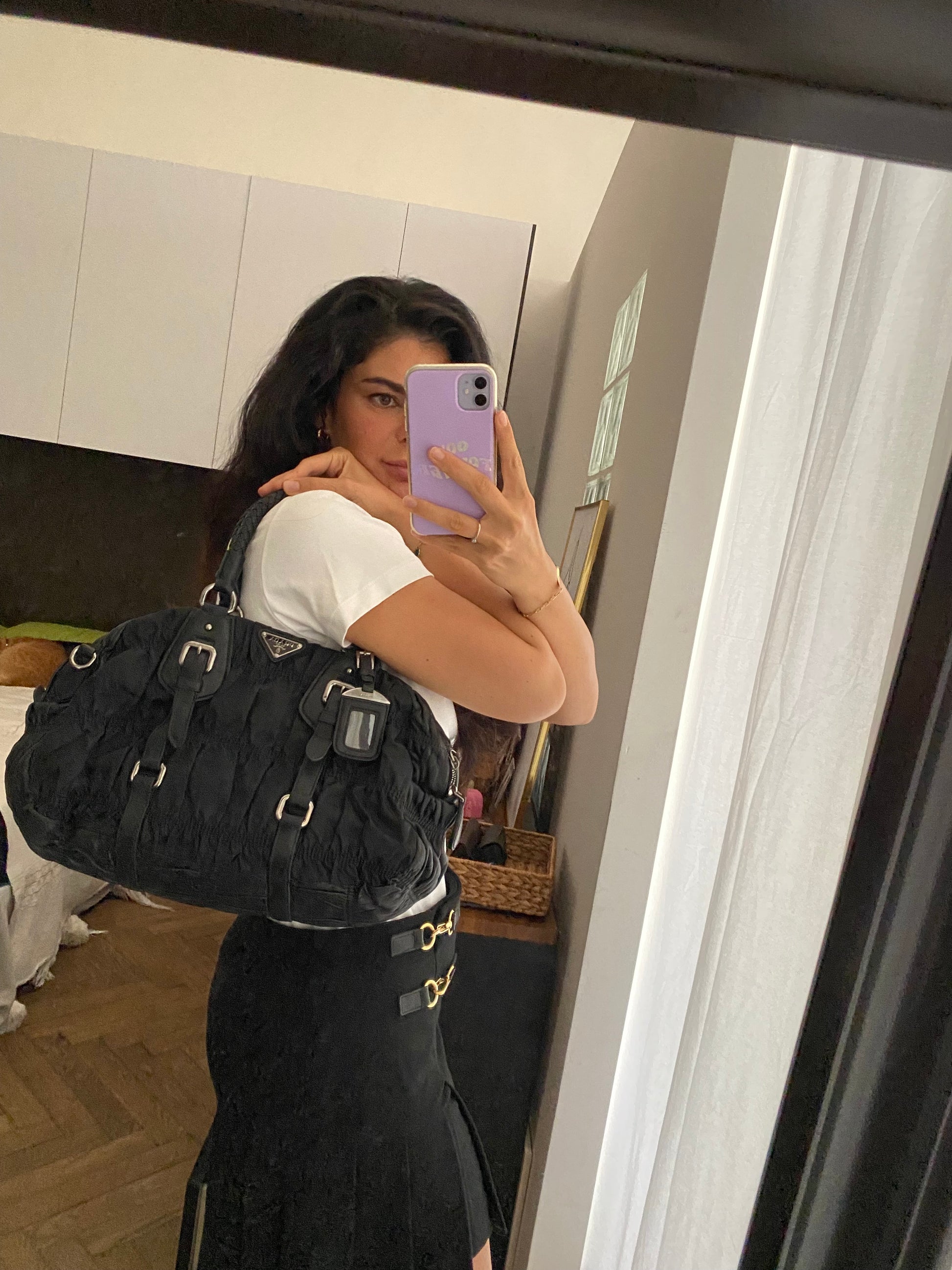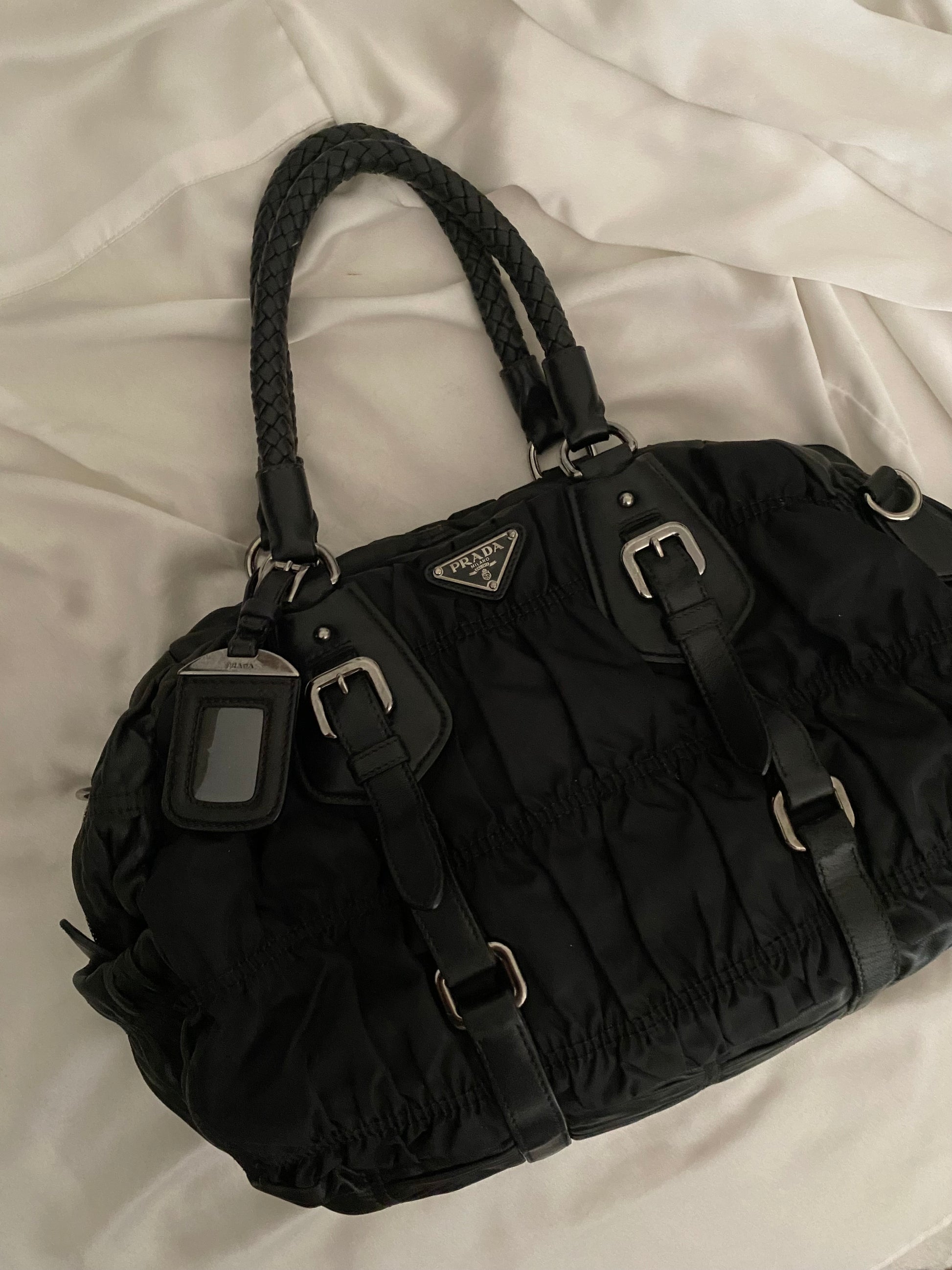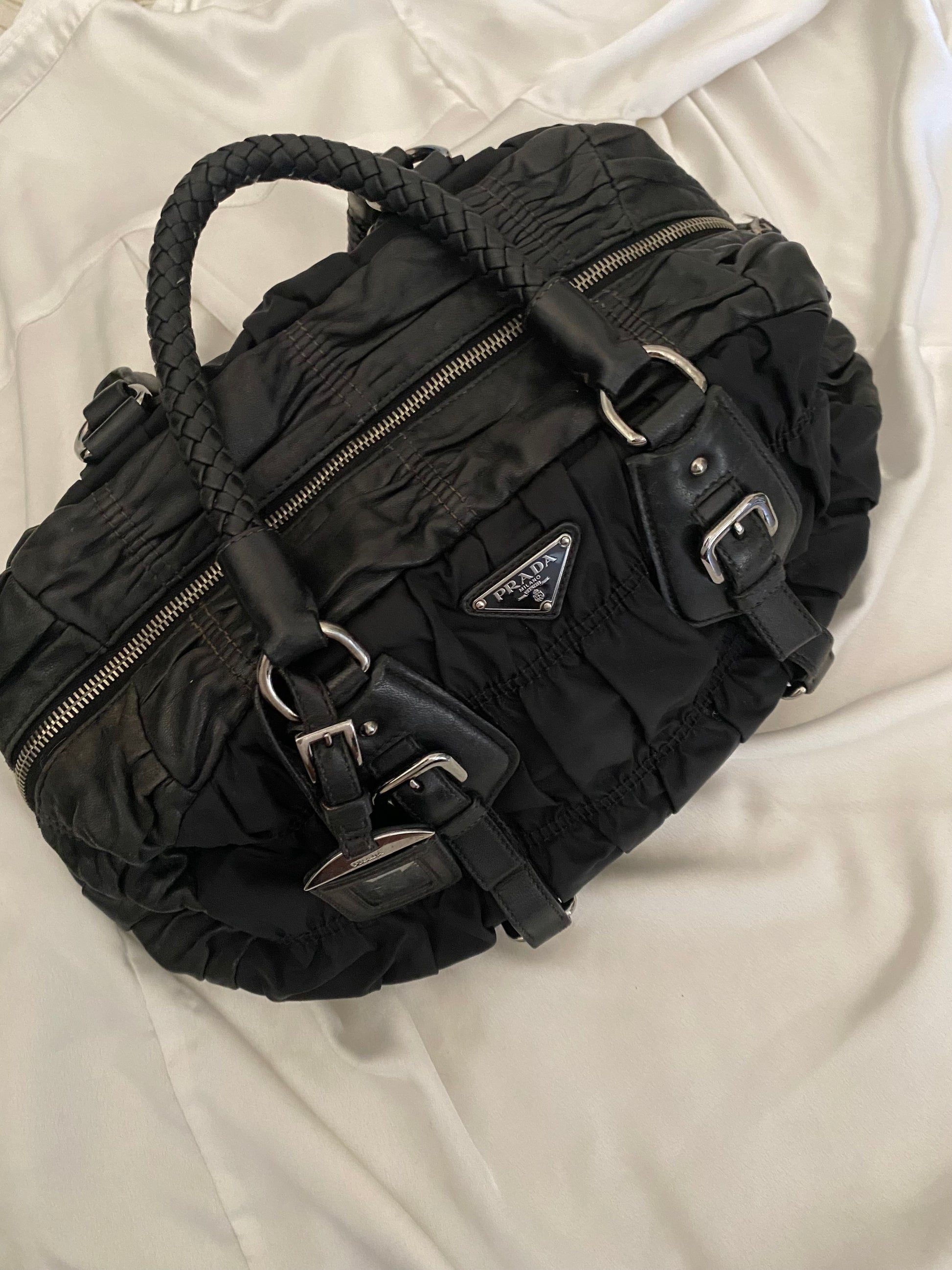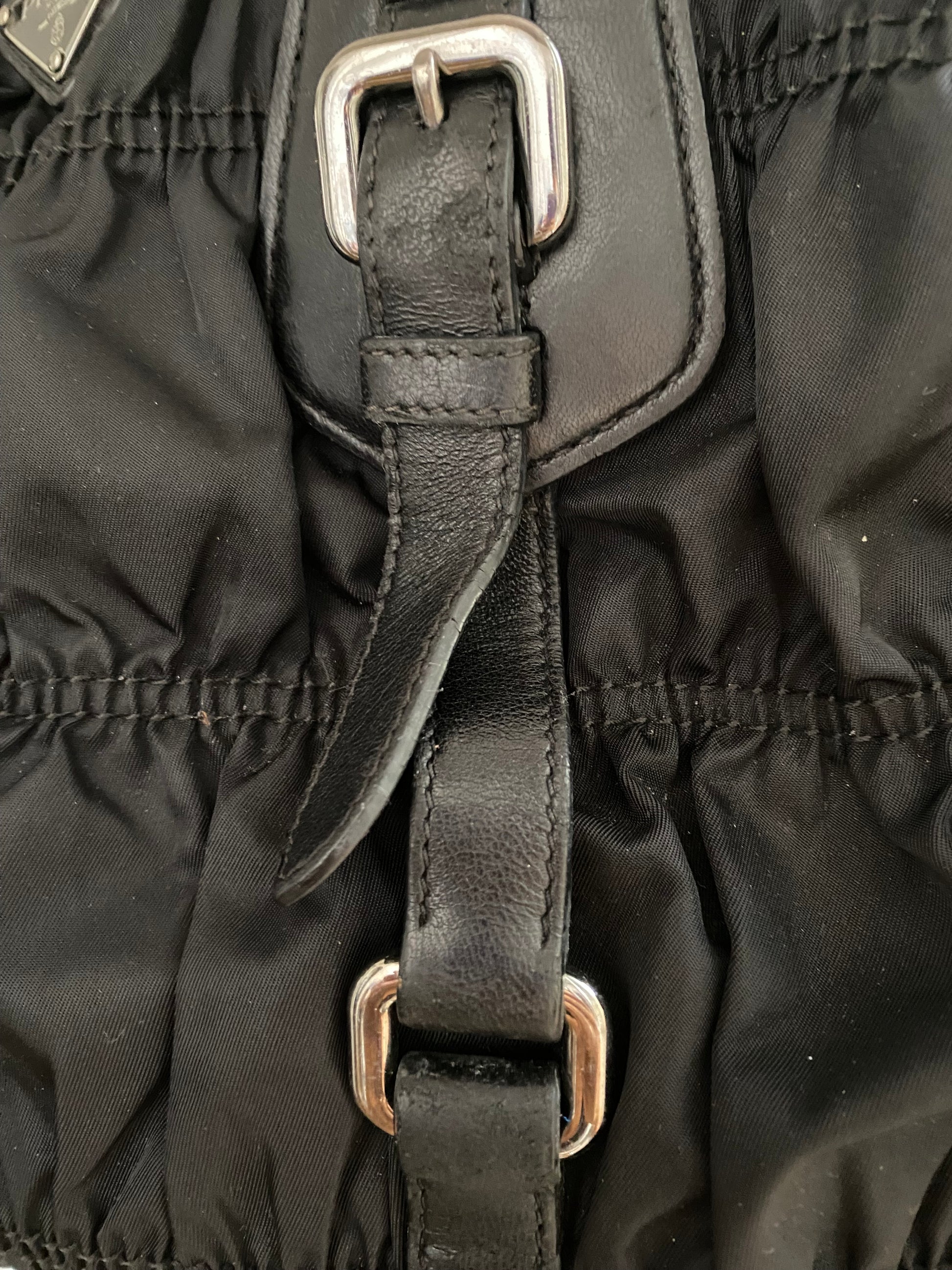 Stupenda Prada plissè nera in nylon con profili in pelle morbidissima. Qualche leggerissimo segno sui passanti, messo in evidenza in foto e poco visibile dal vivo.