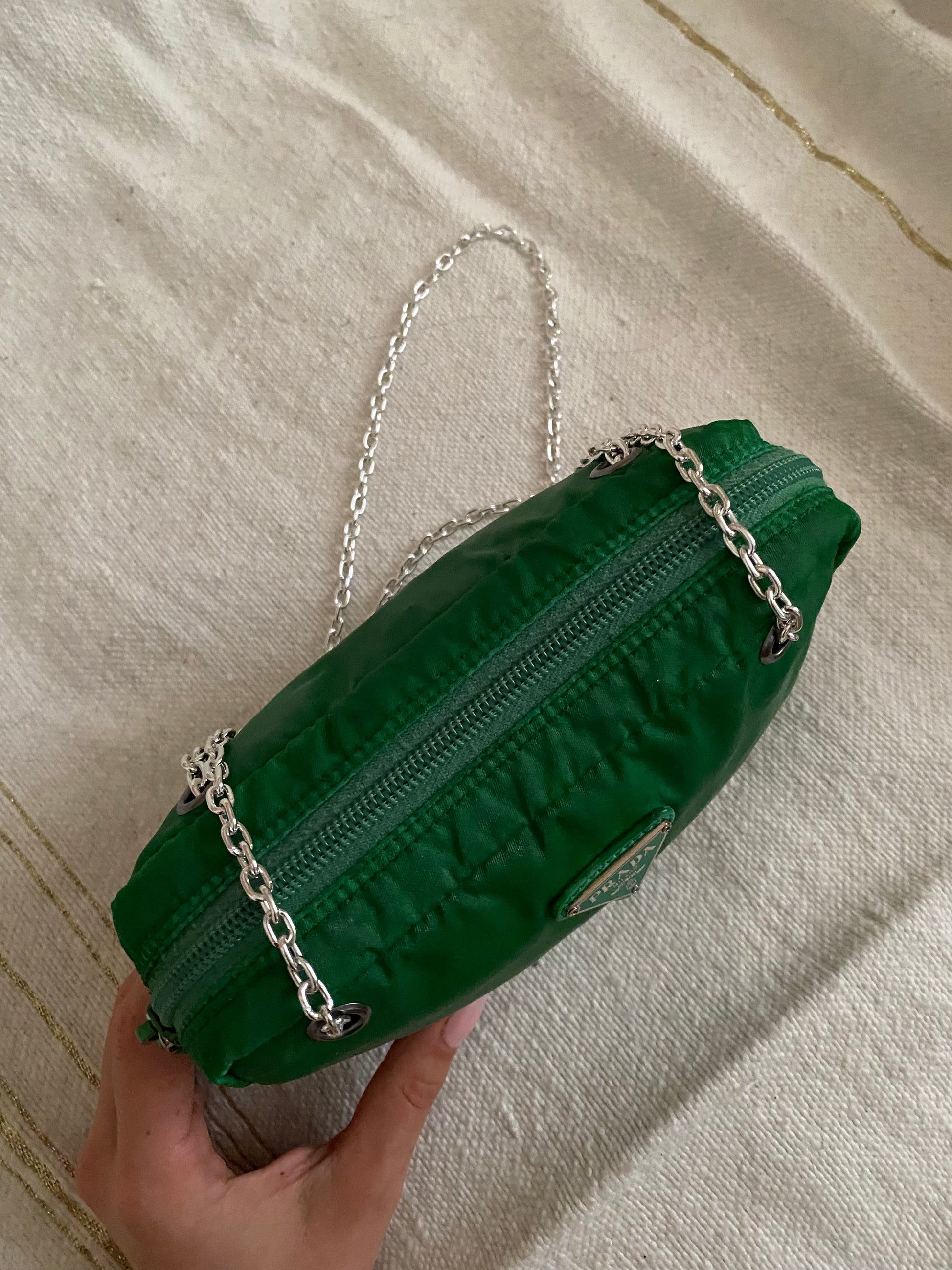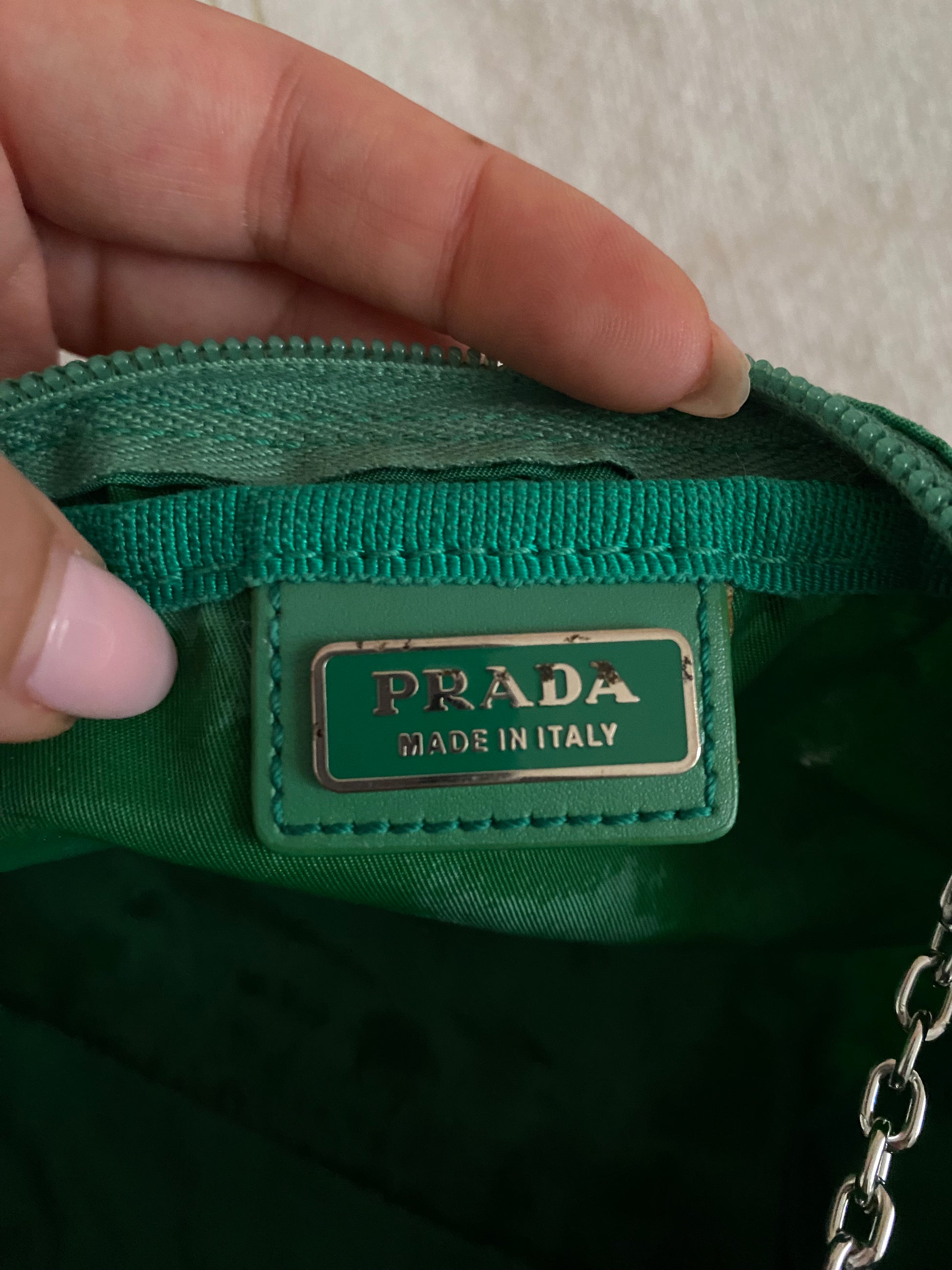 Pochette Prada verde smeraldo. Piccolo segno sul lato sinistro (non visibile), discromie interne (non visibili dall’esterno).