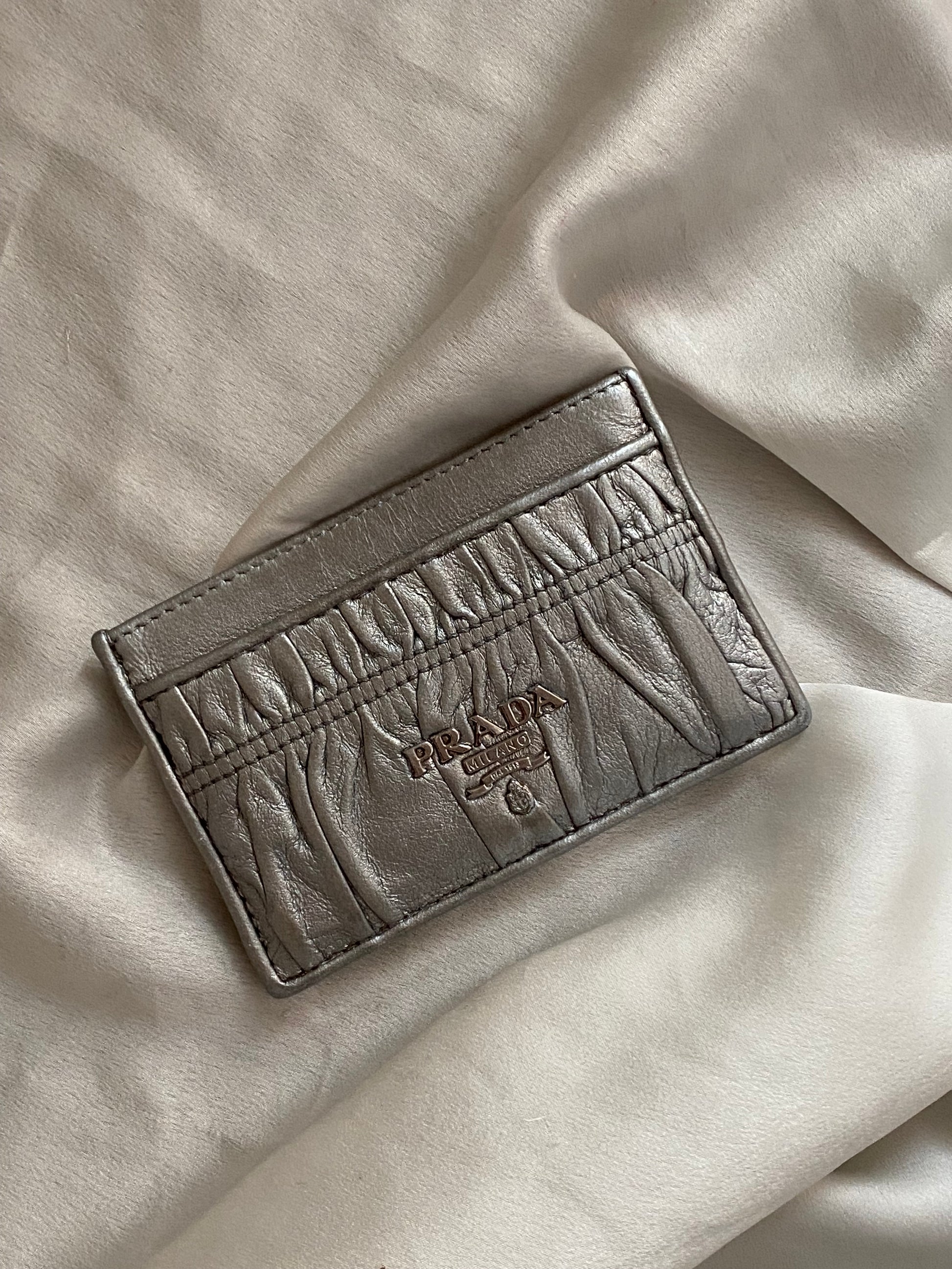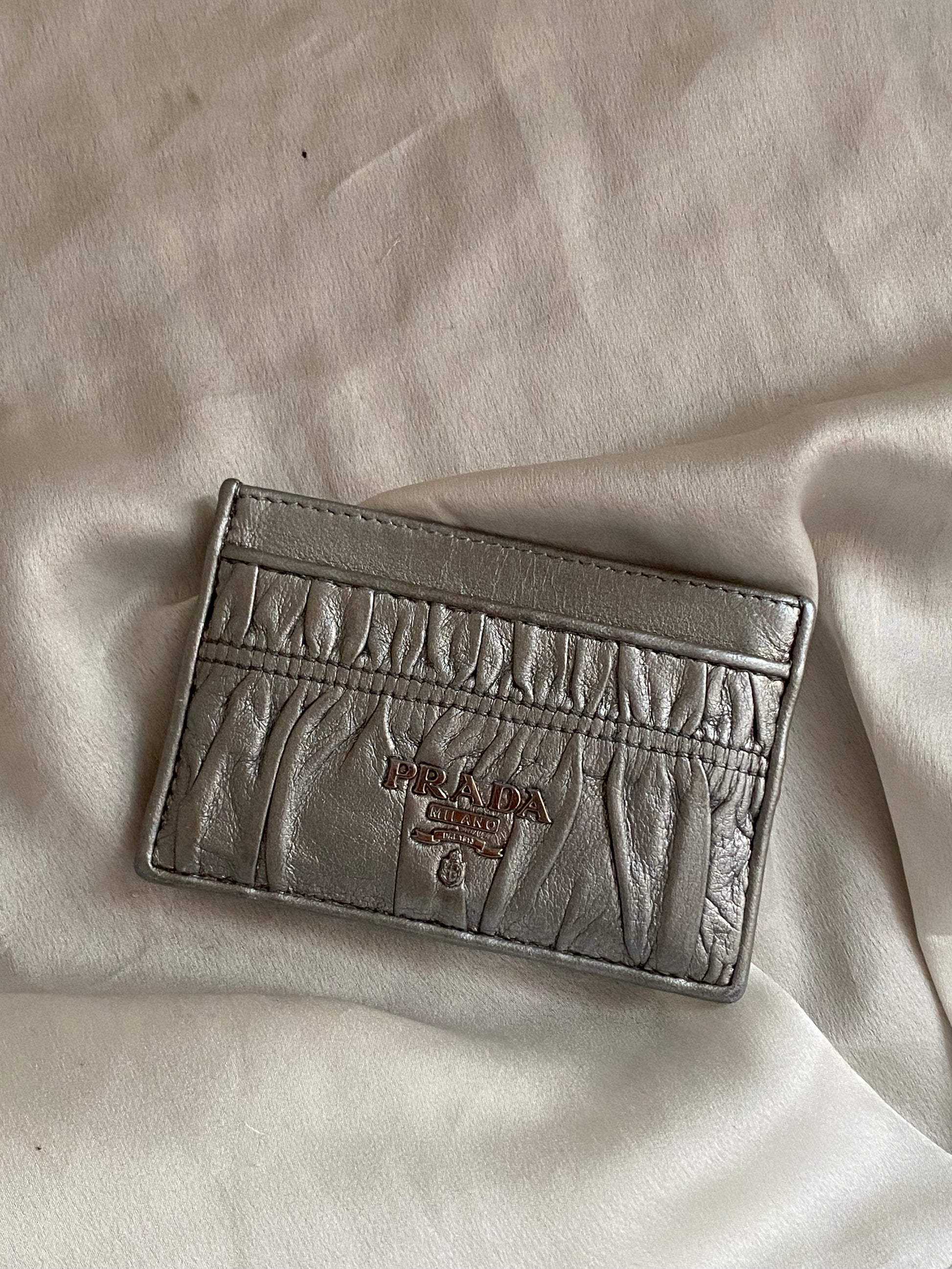 Prada portacarte argento completamente in pelle. Rarissimo. Qualche segno, pelle lucidata e morbida, buonissime condizioni generali.