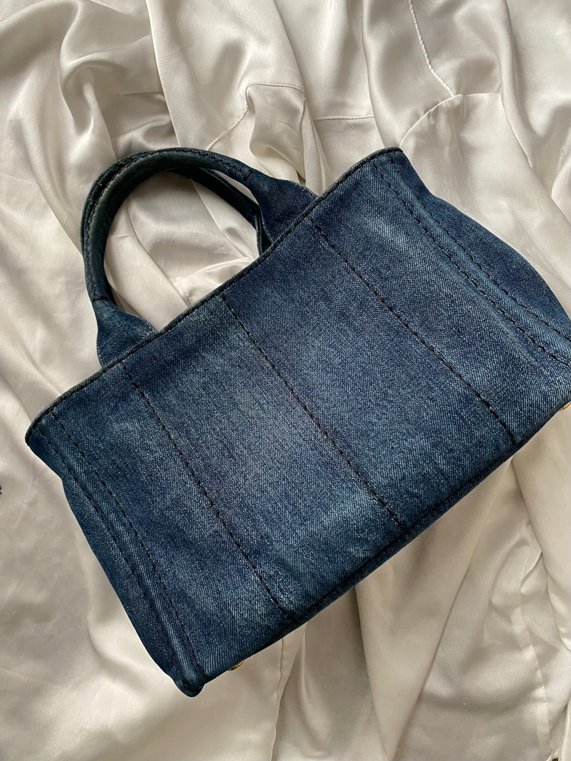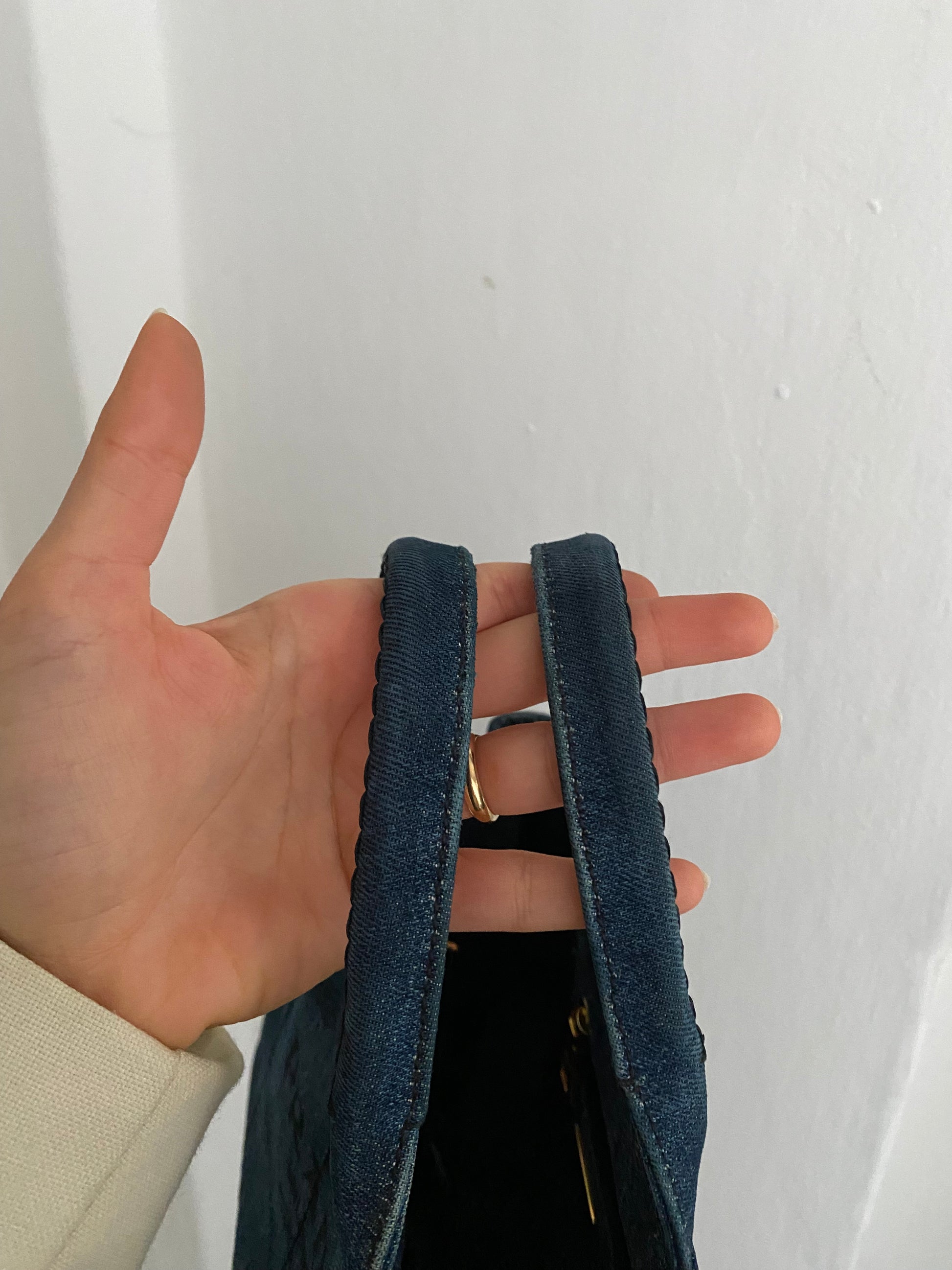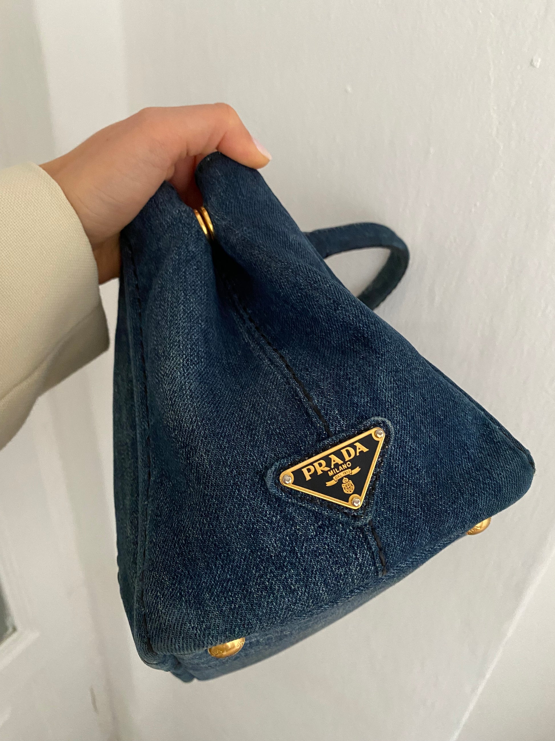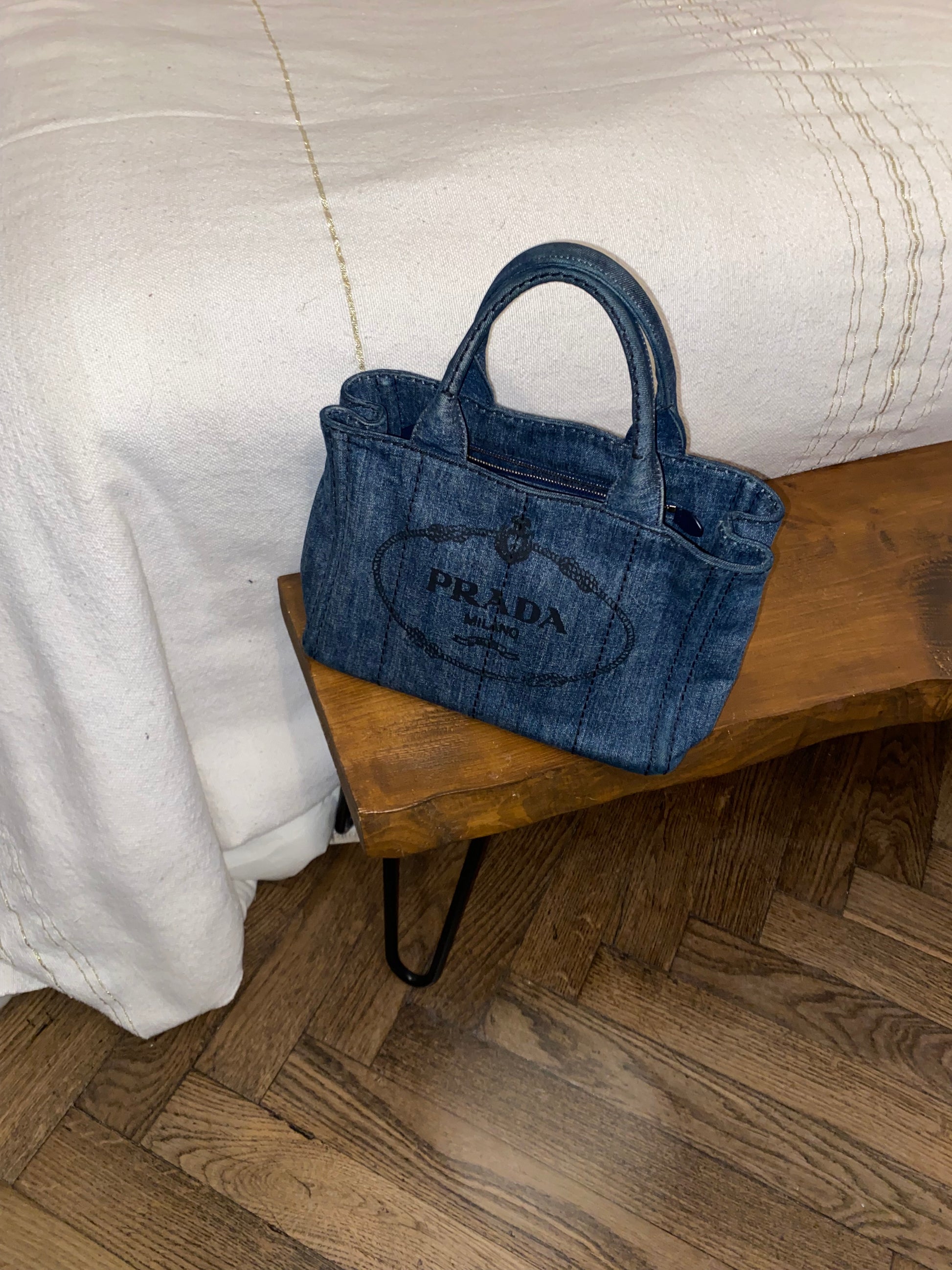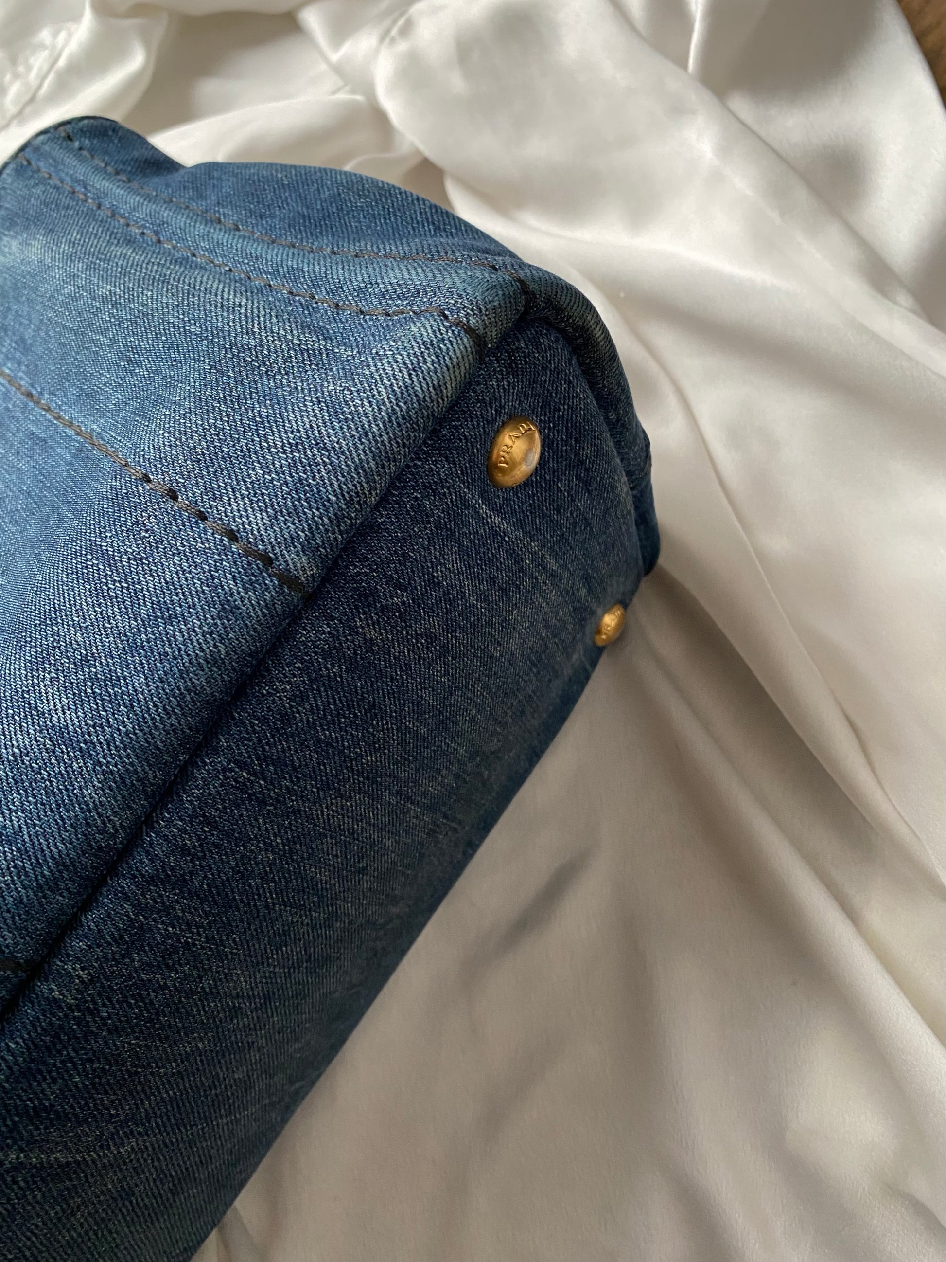Meravigliosa tote in denim di prada con tracolla originale. Qualche abrasione sugli angoli, ma buonissime condizioni generali. Manici e struttura molto solidi. Logo stampato ancora perfetto.